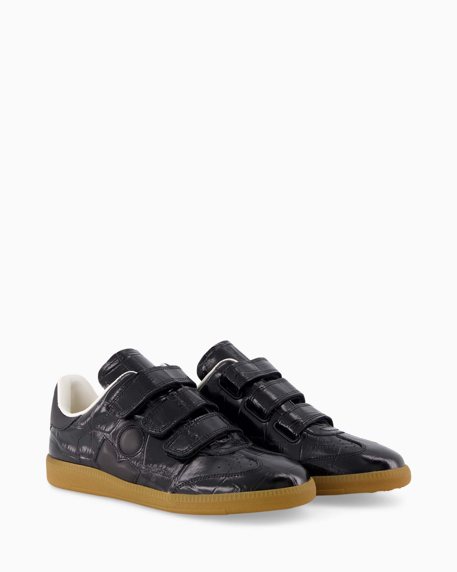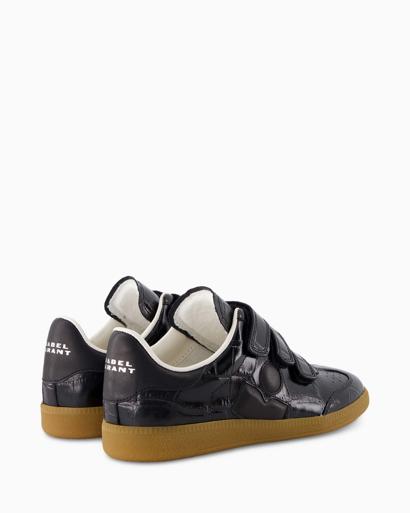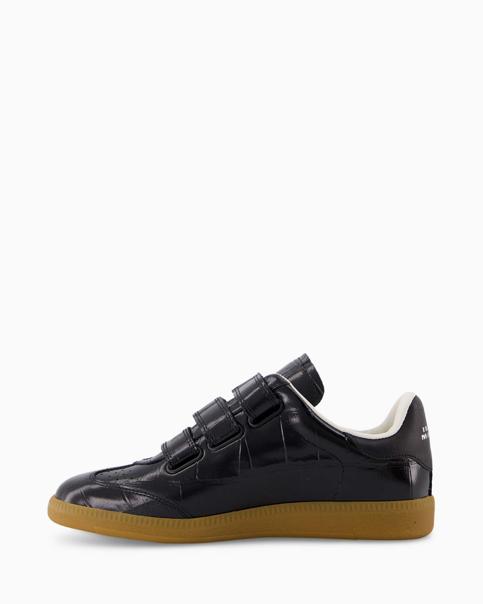 Sneaker Beth-gd Zwart van Isabel Marant geeft je dagelijks gemak en een fijne pasvorm. Deze sneaker heeft een zwarte kleur en een stevige bruine zool. Het leer bevat een patroon van een krokodillenhuid. Je sluit de schoen snel met de drie banden van klittenband aan de bovenkant.