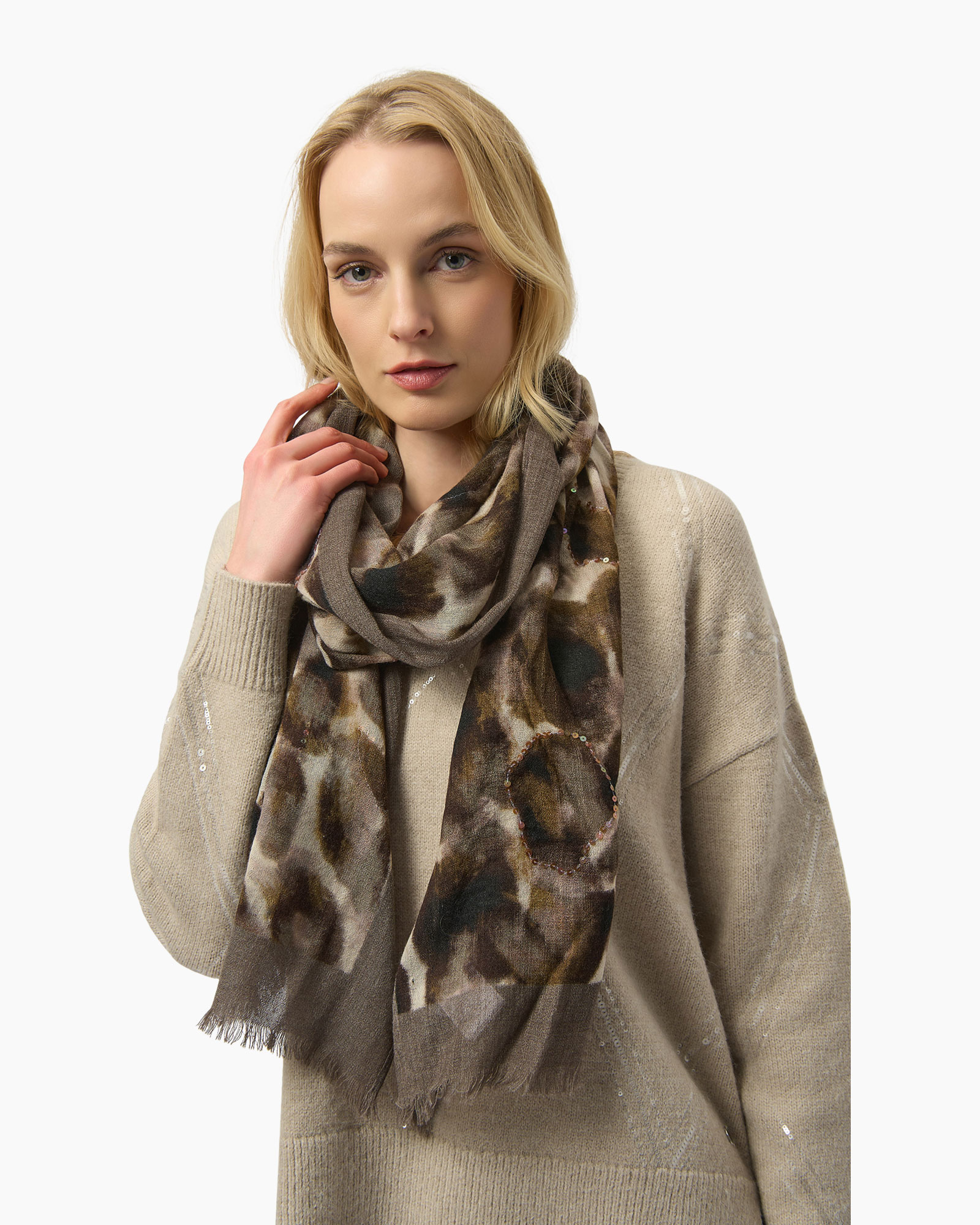 Sjaal Leopard Beige van Joseph Ribkoff omhult je met een warme omhelzing. Gemaakt van zacht, soepel materiaal dat comfortabel rond je nek valt. De subtiele beige tint maakt het een veelzijdige metgezel voor elk seizoen.