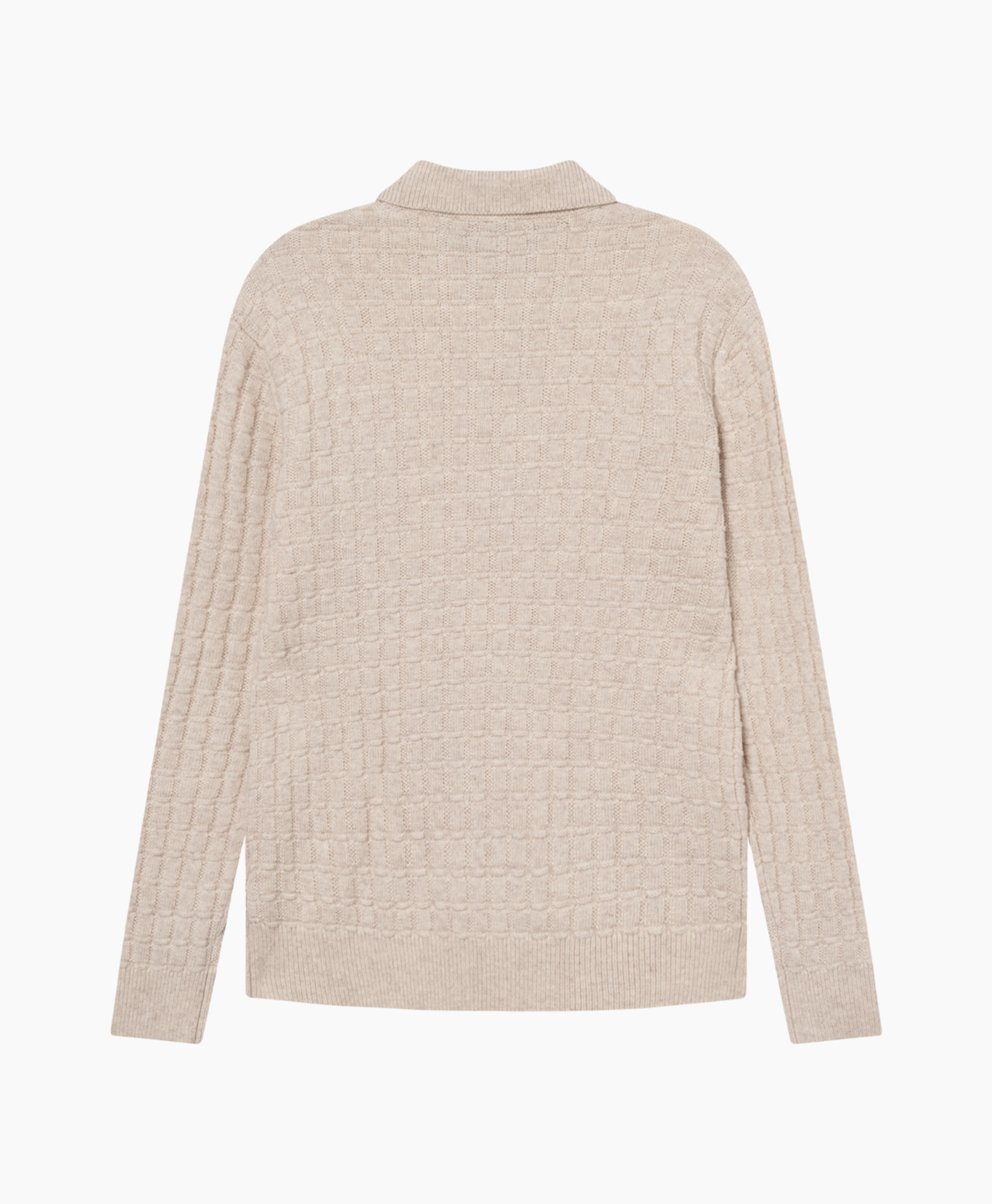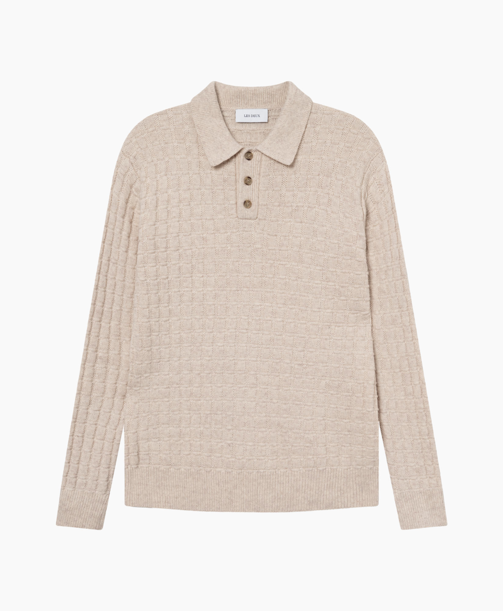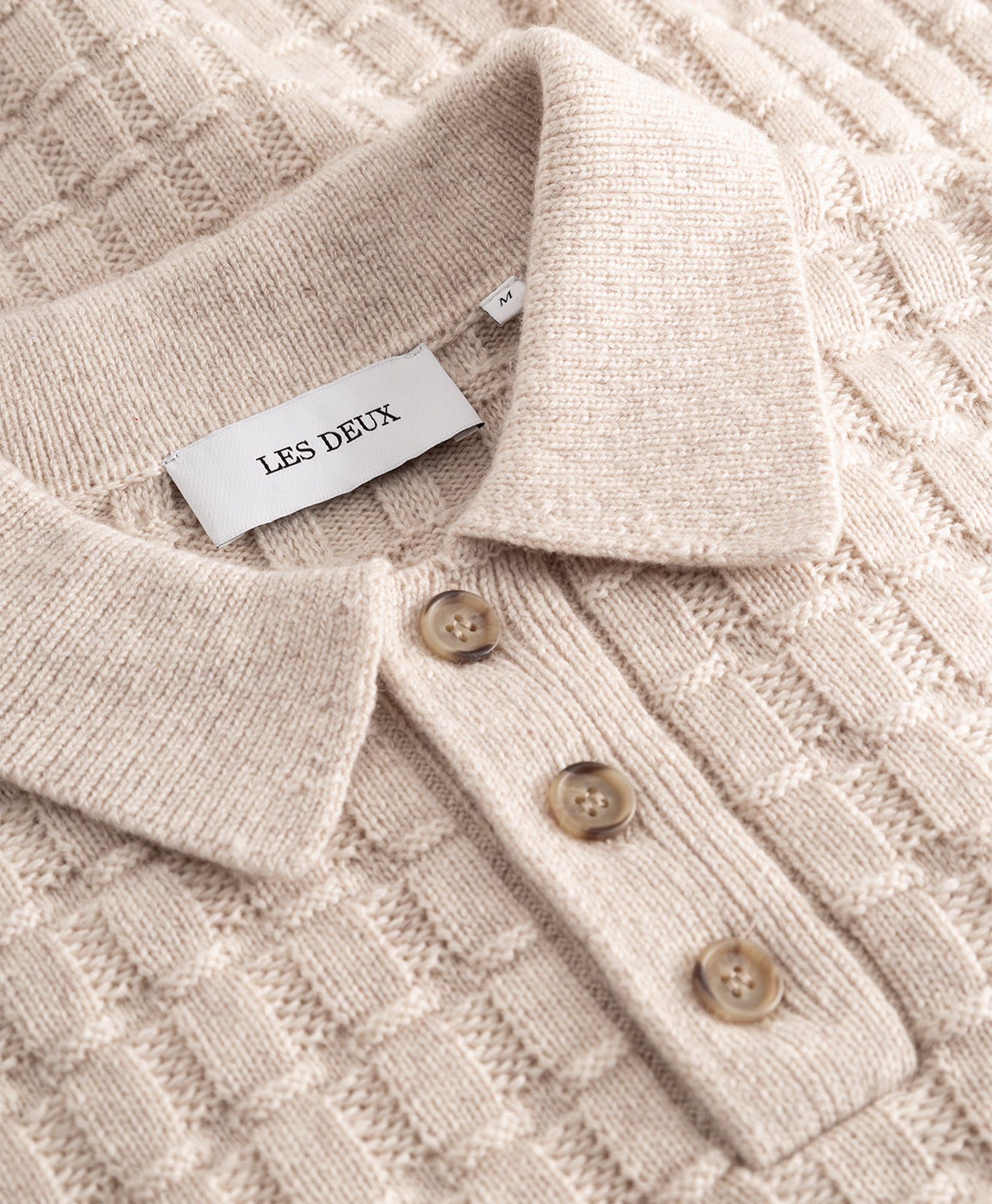 Polo Gustav Squared Structure Knit Zand van Les Deux is een gebreide polo met lange mouwen. De kleur zand geeft rust aan je outfit met deze polo in een rechte pasvorm. Je ziet een kraag met drie knopen en een patroon van vierkanten in de stof. De mouwen en de onderzijde sluiten aan met een boord.