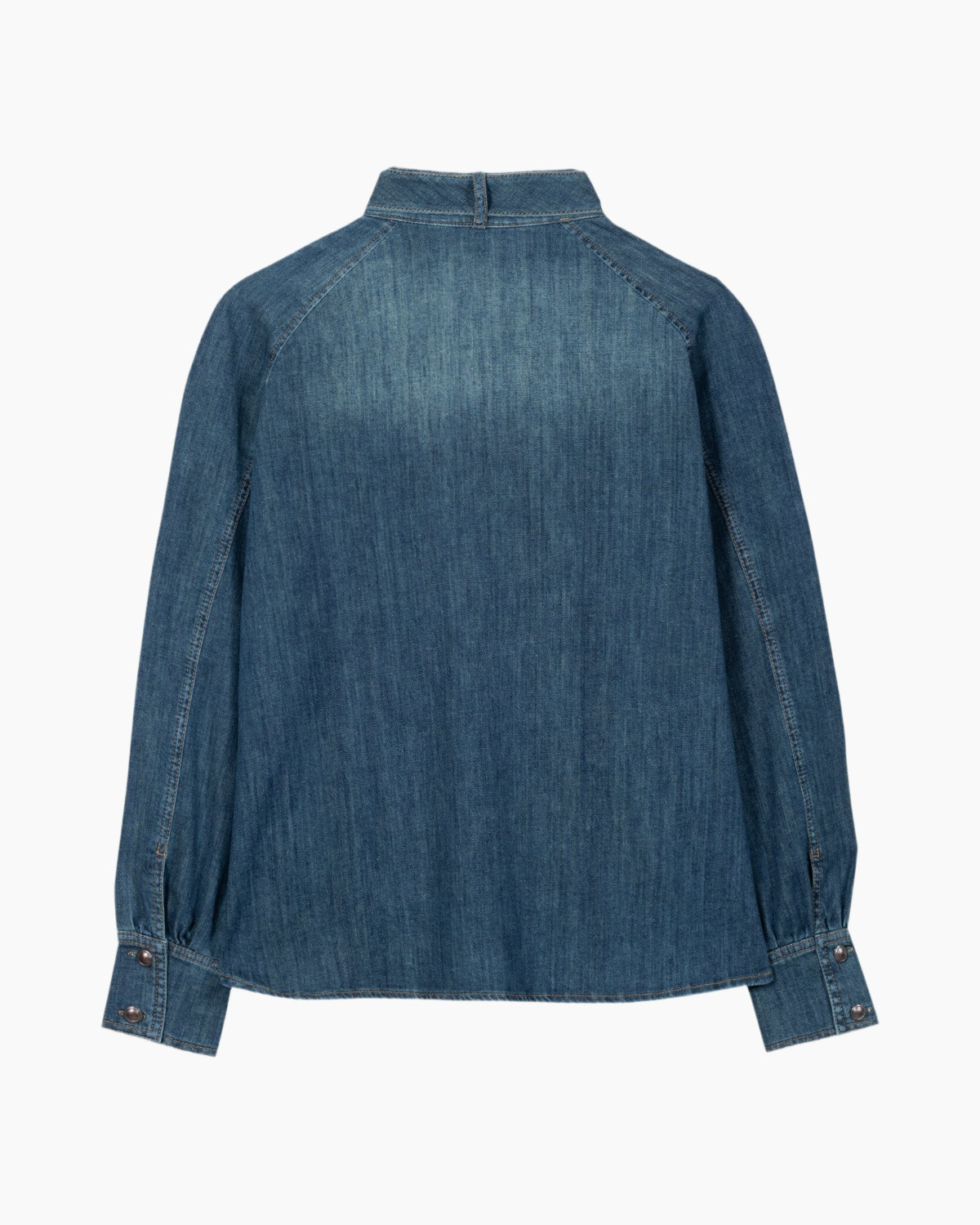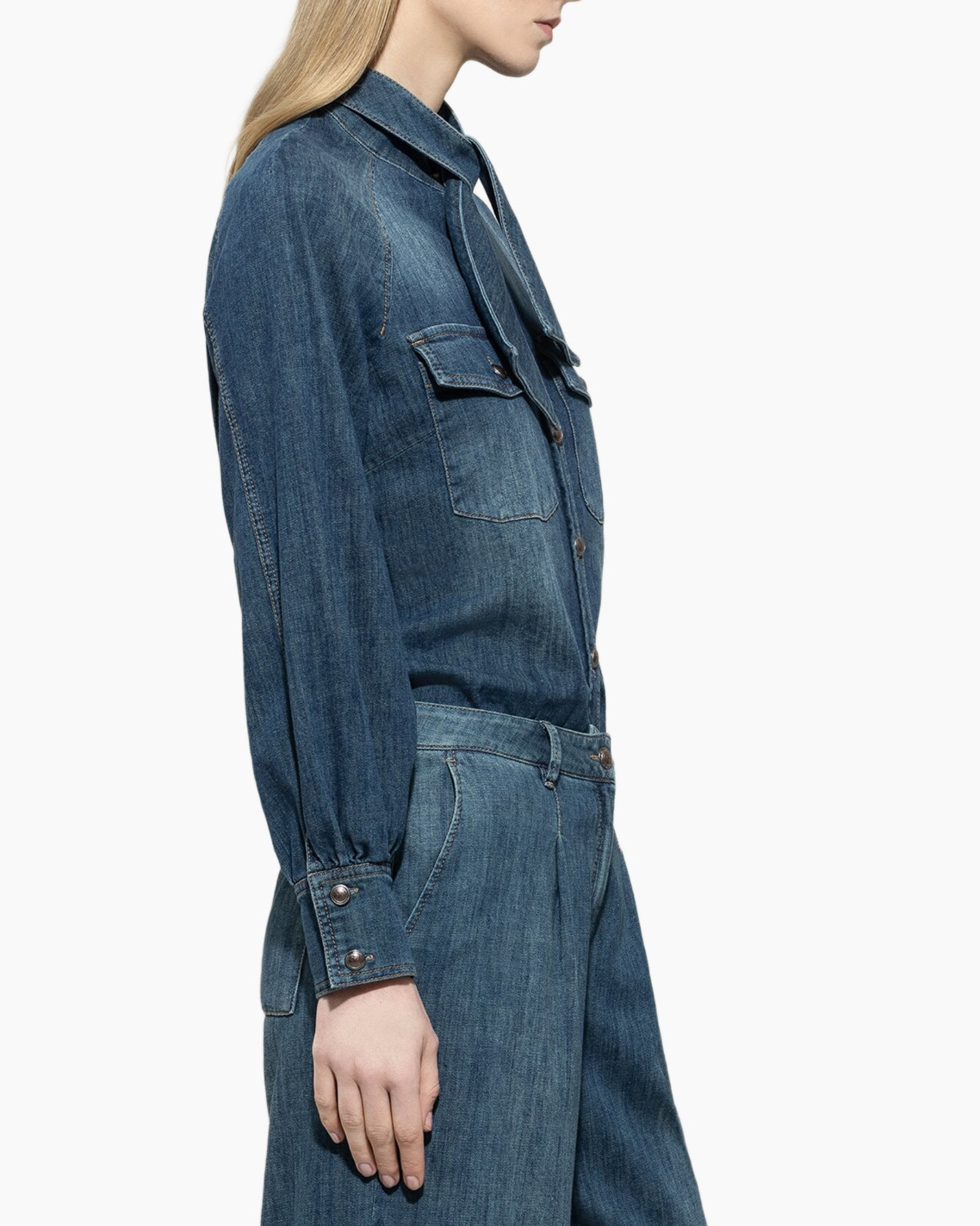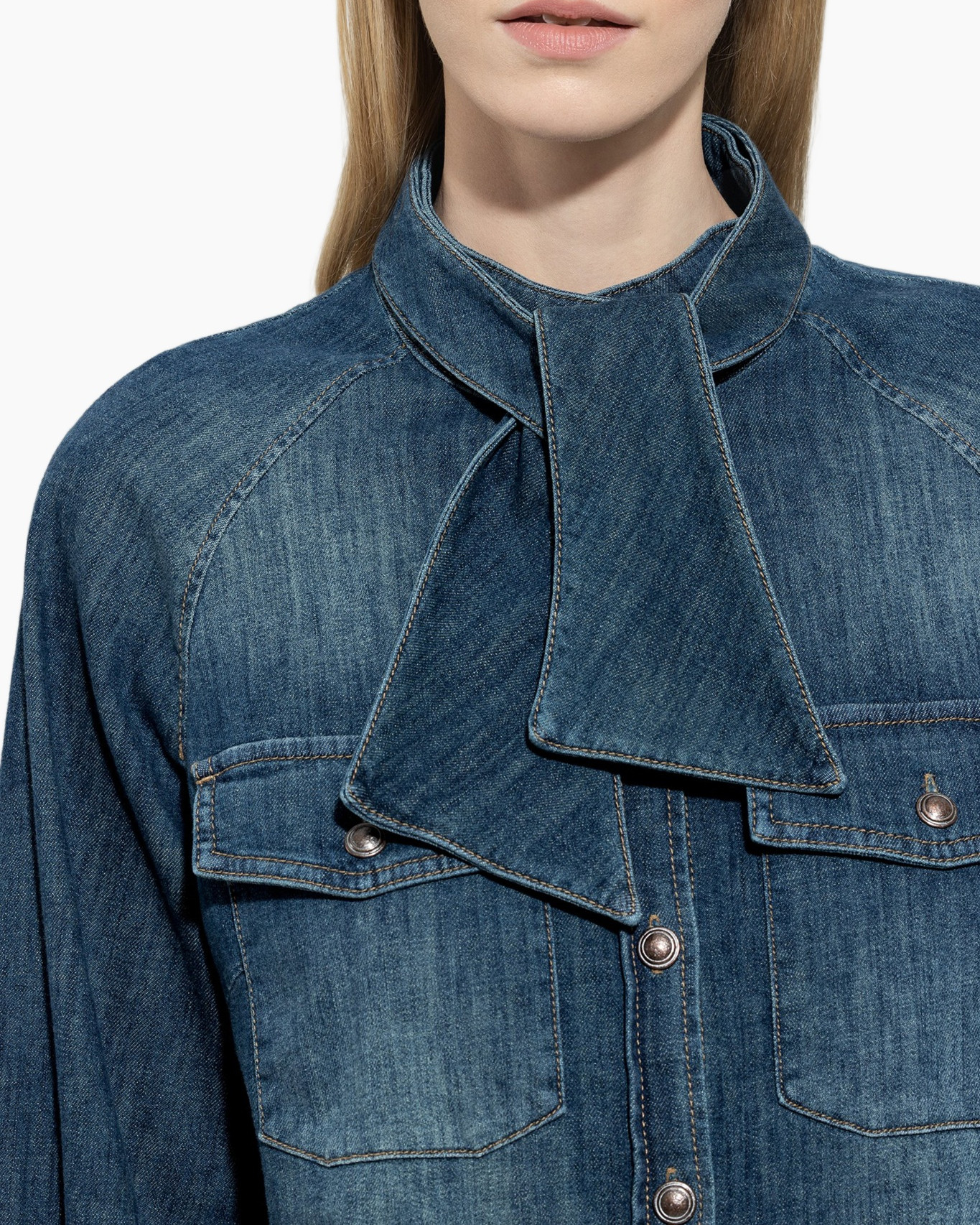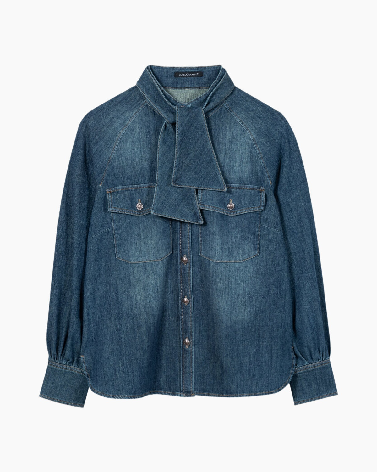 Deze blauwe blouse van soepele denim heeft een diepe indigo wassing. Het ontwerp onderscheidt zich door de uitgesproken strikkraag die karakter geeft. De borstzakken en metalen knopen refereren naar de oorsprong van spijkerstof. Je draagt deze creatie als krachtige basis.