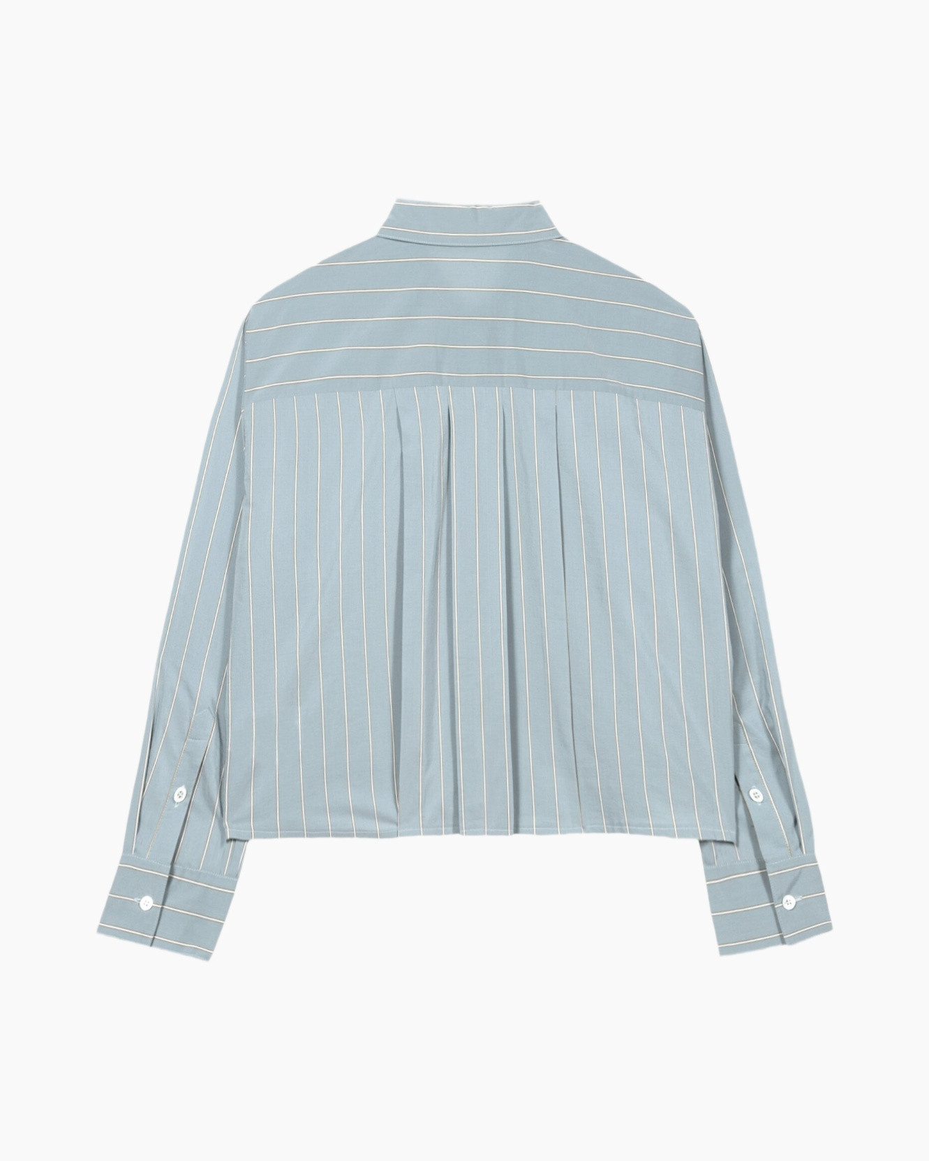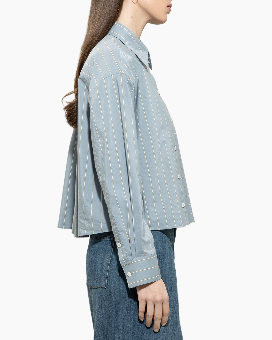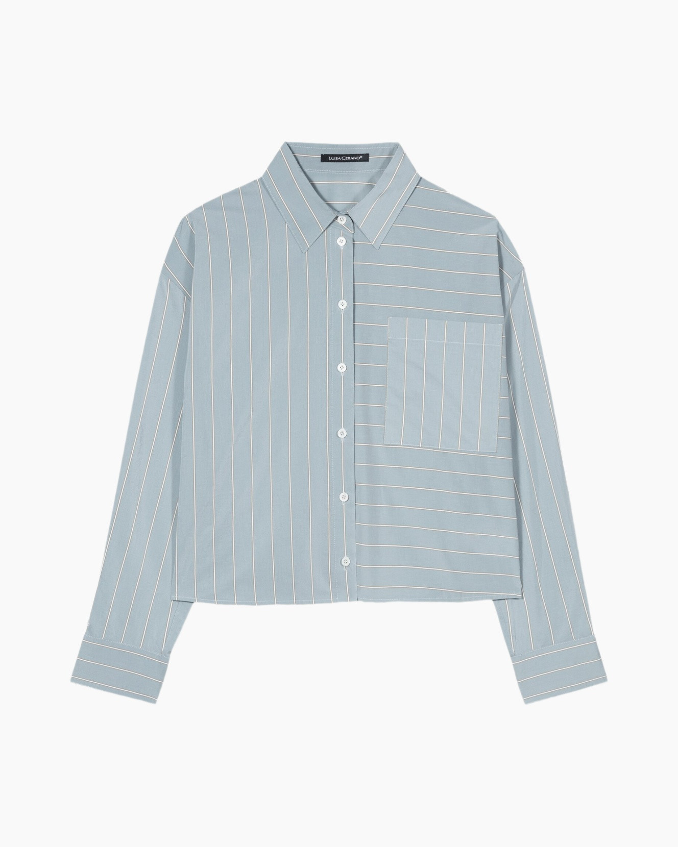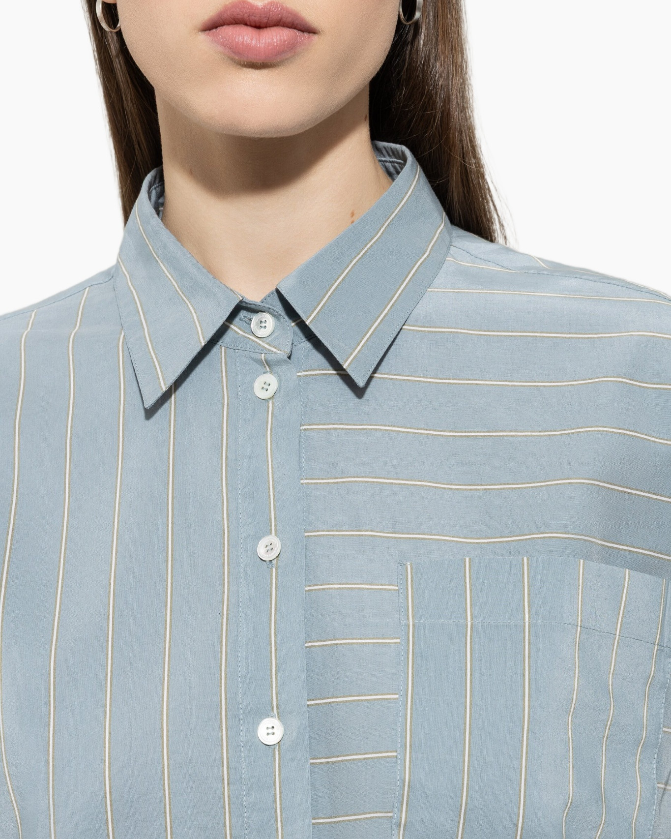 Deze lichtblauwe blouse valt soepel door de mix van katoen en cupro. Het witte streeppatroon geeft een dynamisch effect. De kraag en knoopsluiting geven een verzorgde vorm. Wijde mouwen eindigen in manchetten.