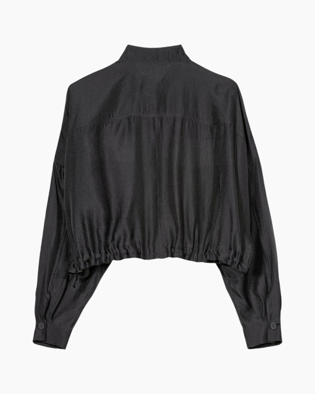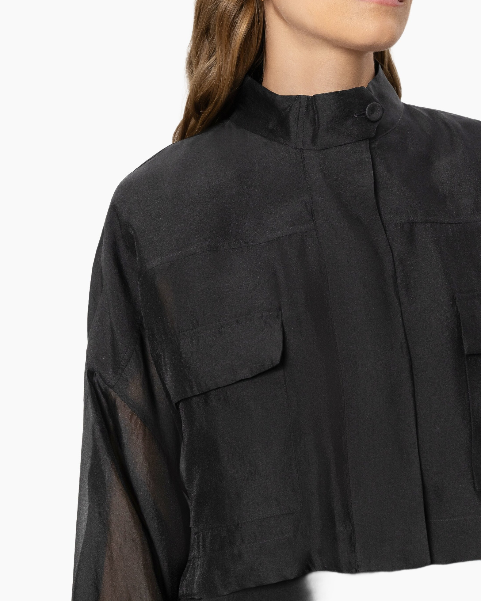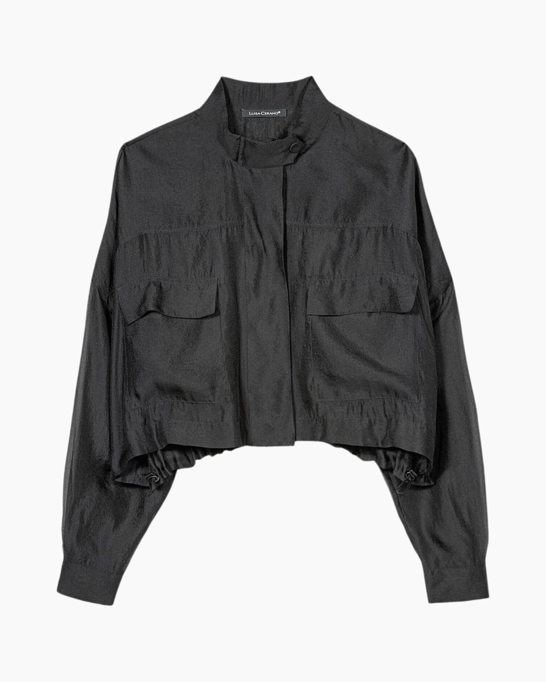 Blouse 238647/3796-0 Zwart dessin van Luisa Cerano geeft je direct een eigentijdse uitstraling. Deze zwarte blouse heeft een cropped pasvorm en valt ruim, wat zorgt voor een luchtig silhouet. Je ziet duidelijk twee borstzakken aan de voorzijde, een verfijnde bandkraag en een nette knoopsluiting. De mouwen zijn transparant en vallen wijd, afgewerkt met subtiele, opake strepen. Aan de achterkant is de zoom licht elastisch, wat de pasvorm verder accentueert.