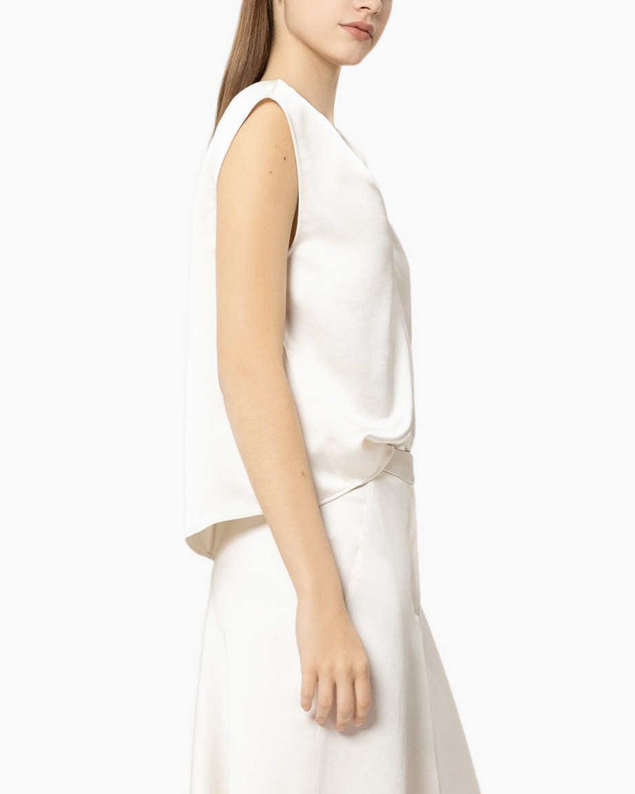 Combineer deze top met een wijde pantalon in dezelfde kleur voor een rustig totaalplaatje, of draag hem op een donkere kokerrok voor een zakelijke uitstraling.