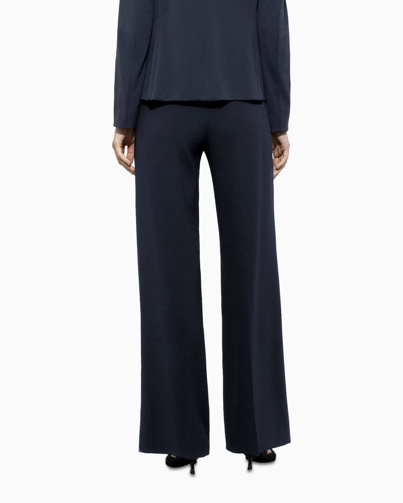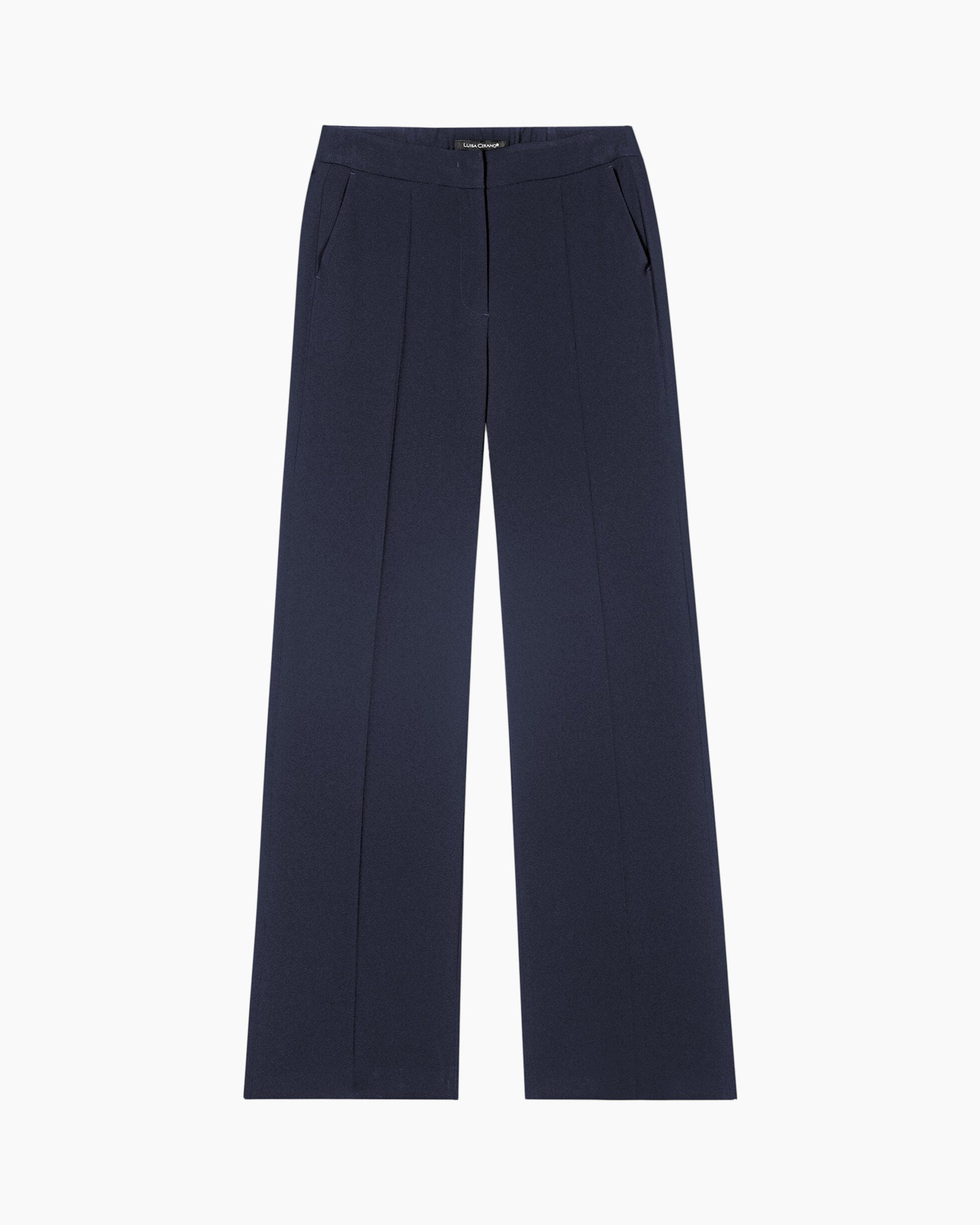 Broek met wijde pijpen van losvallende triacetaatcrêpe met glanzende satijnen zijkant in een klassieke, tijdloze stijl met plooien. Aan de voorkant zitten twee steekzakken en aan de achterkant twee aangegeven klepzakken.