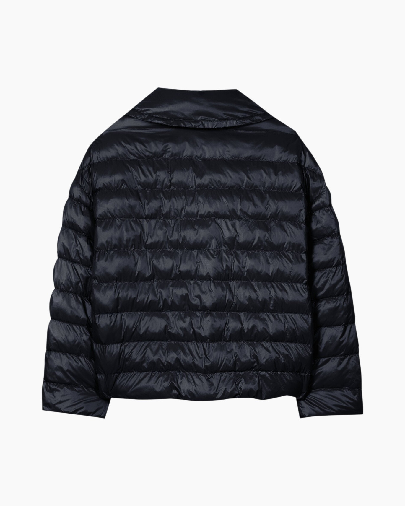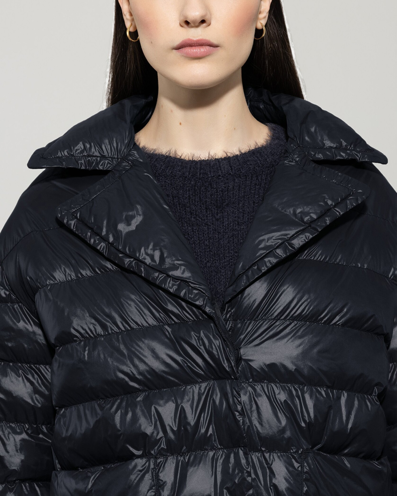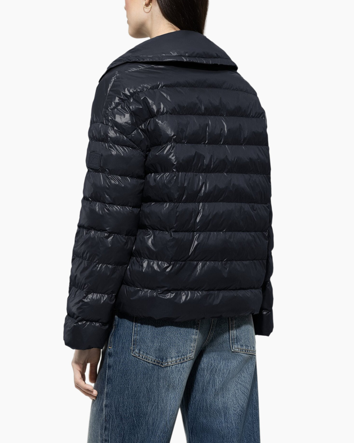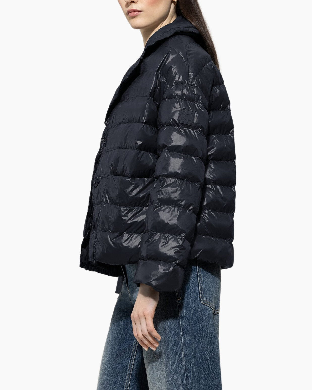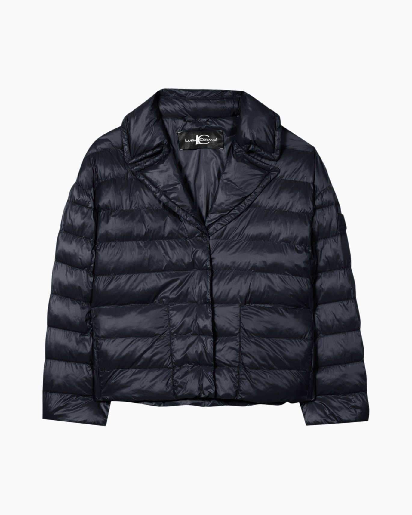 Dit gewatteerde jack in marineblauw biedt warmte tijdens koude winterdagen. De glanzende stof houdt de vulling op zijn plek door horizontale banen. De hoge kraag beschermt tegen gure wind. Aan de binnenzijde prijkt de naam Luisa Cerano op een zwart label.