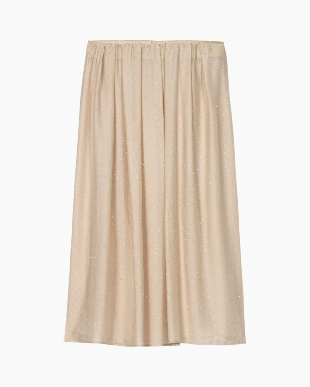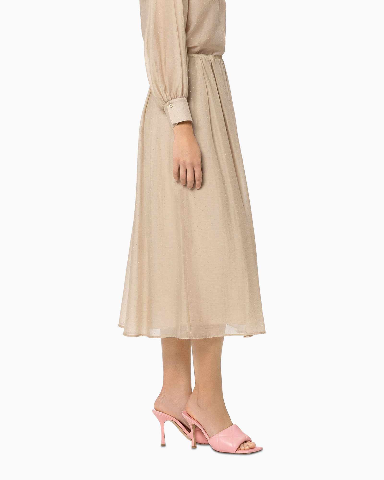 Rok 538319/3805-0 Taupe van Luisa Cerano is de luchtige, geplooide midi-rok die je dit seizoen wilt dragen. De zachte taupe kleur heeft een lichte glans, waardoor de rok direct opvalt. Je ziet de fijne, subtiel glinsterende stippen die de semi-transparante buitenlaag sieren. Deze rok valt tot over de knie en heeft een losse pasvorm die heerlijk comfortabel zit. Zo voeg je direct een veelzijdig kledingstuk toe aan je collectie.