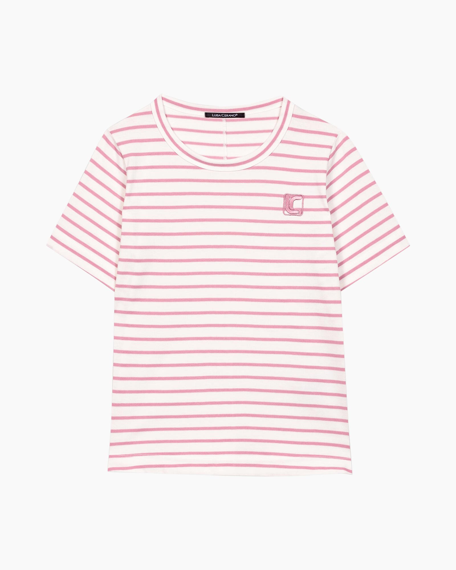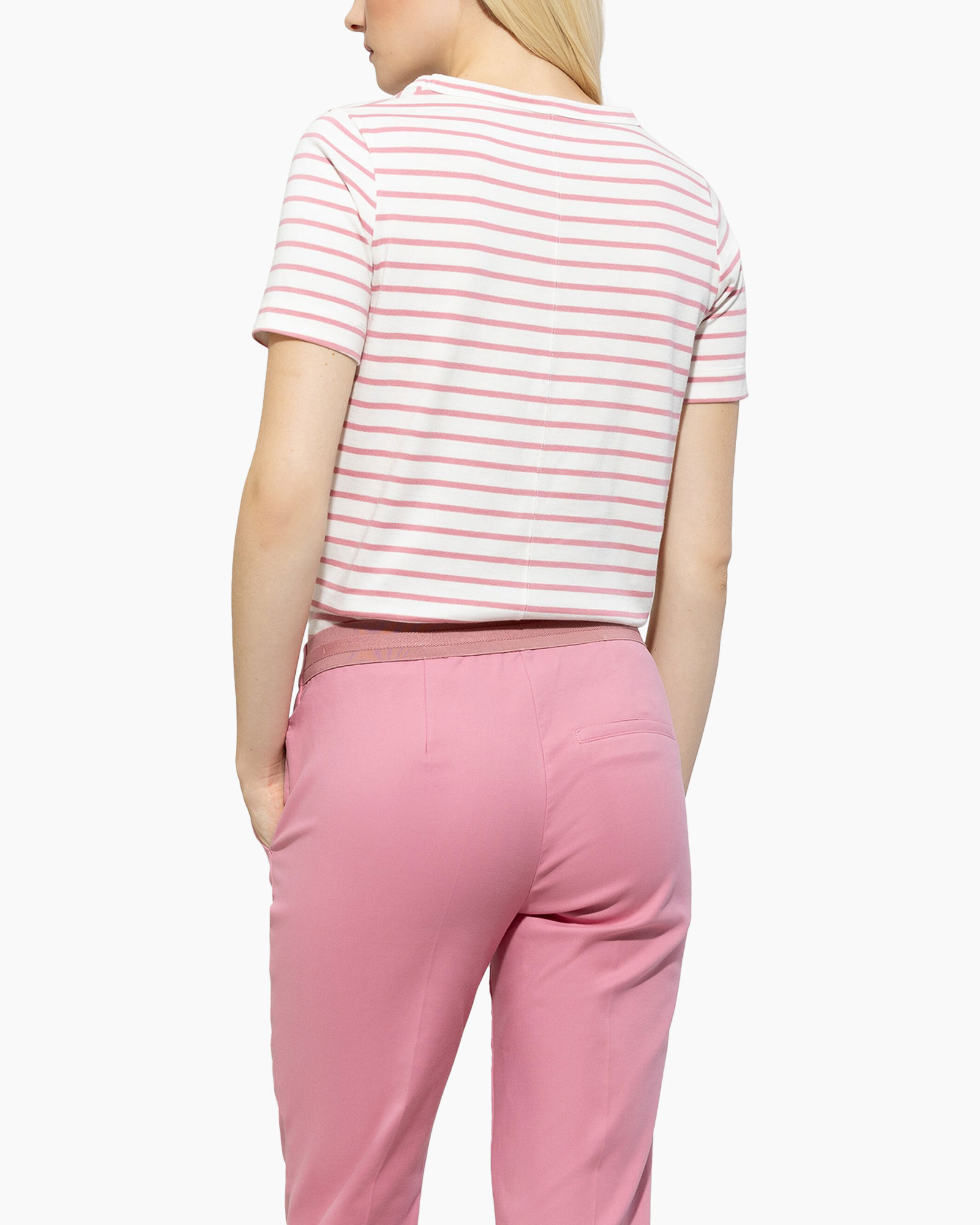 Je ziet hier het T-shirt 318220/7800-0 Wit van Luisa Cerano, een heerlijk kledingstuk dat direct frisheid brengt in je garderobe. De rechte pasvorm garandeert optimaal draagcomfort en valt soepel langs je lichaam. Dit T-shirt heeft een helder witte basis die verlevendigd wordt door fijne, horizontale strepen in een zachte roze tint. De klassieke ronde halslijn is netjes afgewerkt met een strakke boord. Gebruik dit item als een veelzijdige basis om je dagelijkse looks mee te creëren.