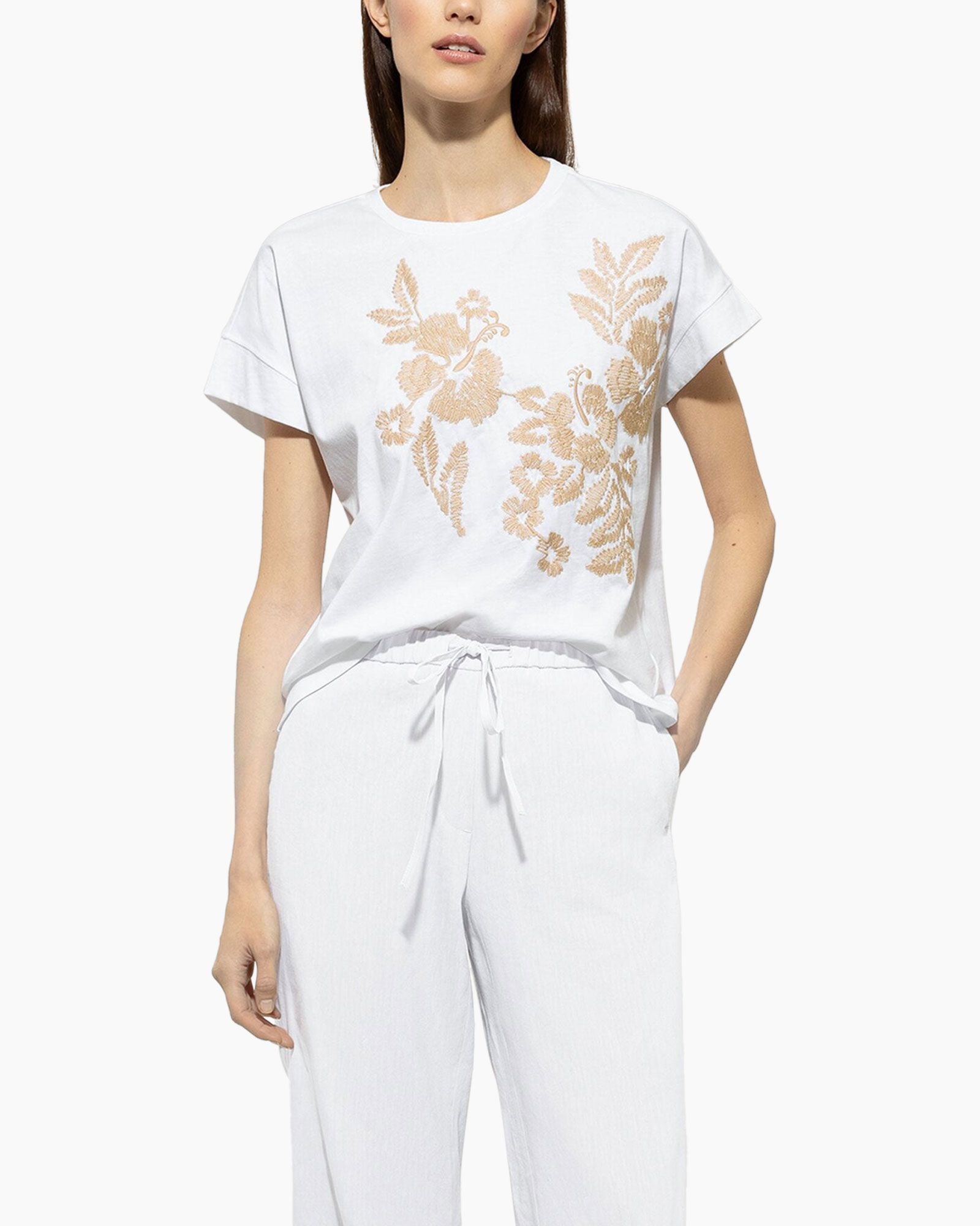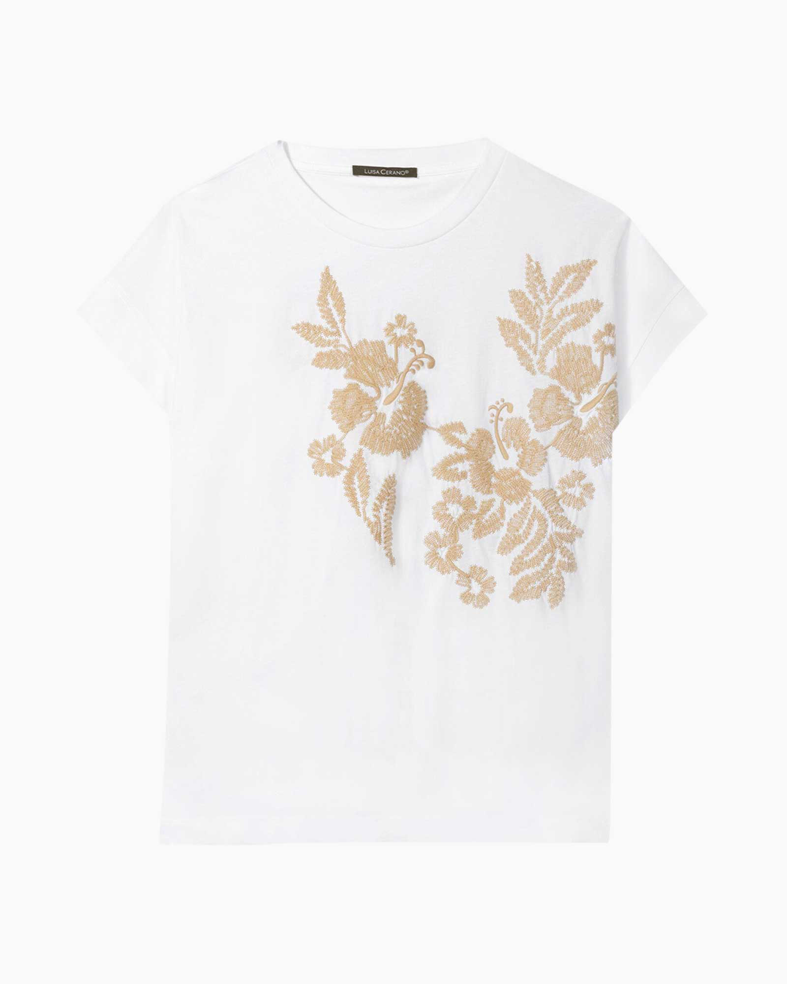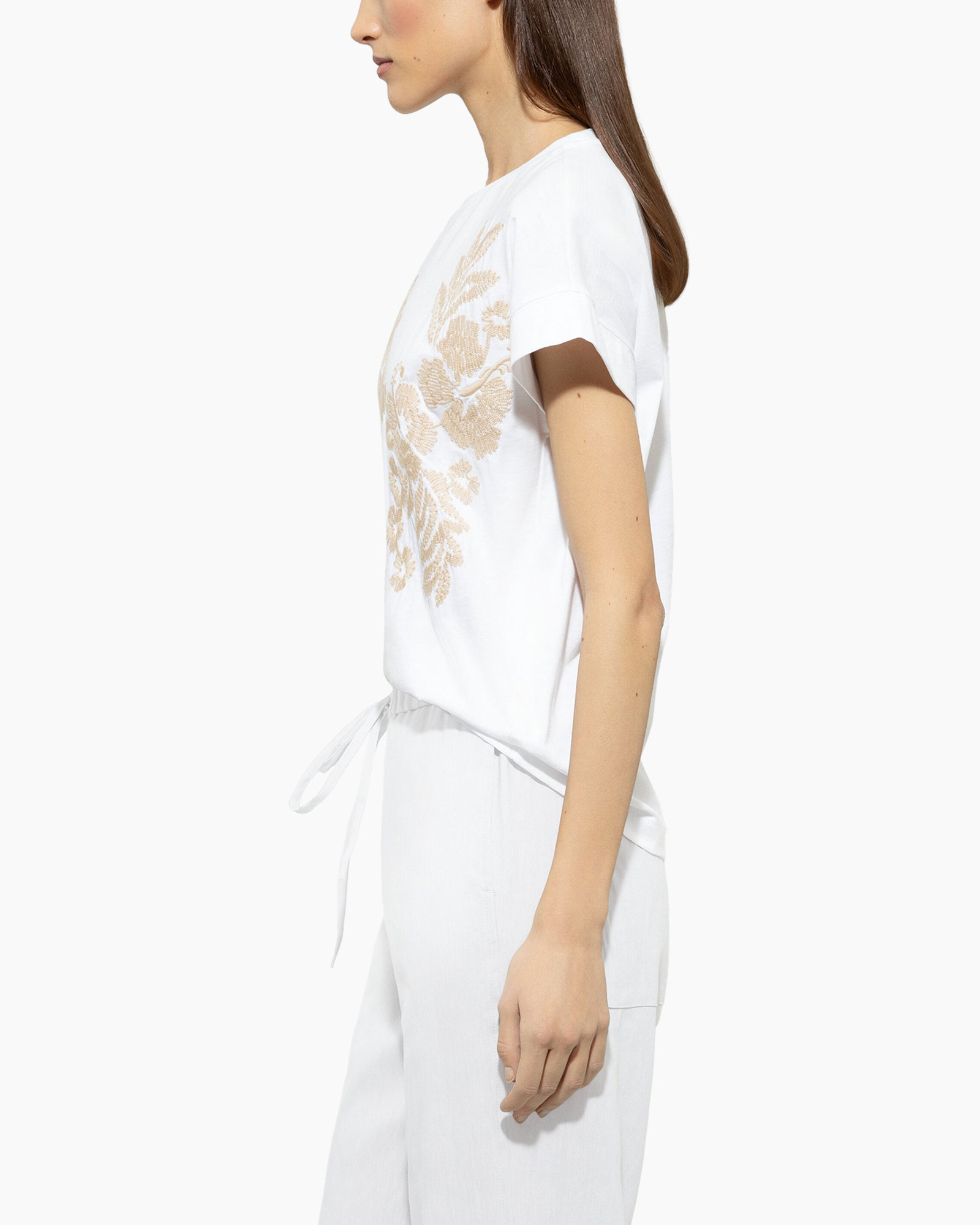 T-shirt van biologisch katoen met ronde halslijn, verlaagde schouders en kapmouw. De voorkant is voorzien van ingewikkeld bloemenborduurwerk in een contrasterende kleur.