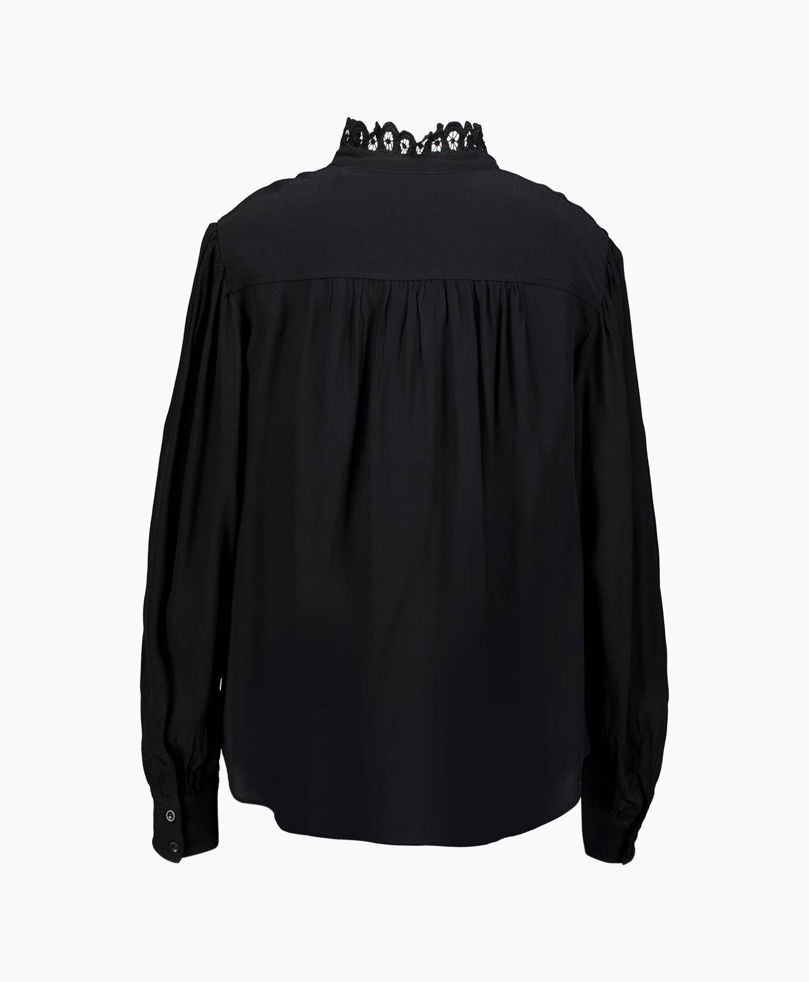 Met de Blouse Estela-gb Zwart van Marant Étoile voeg je een prachtige zwarte blouse aan je garderobe toe. De pasvorm is losjes en valt soepel over het lichaam, waarbij de subtiele plooiing bij de schoudernaden en rug zorgt voor een mooie valling. Deze blouse in effen zwart is voorzien van een opstaande kraag die is afgewerkt met een gekartelde kanten rand. Je sluit de blouse met kleine, verborgen knopen die worden geflankeerd door een decoratieve, geperforeerde verticale rand.