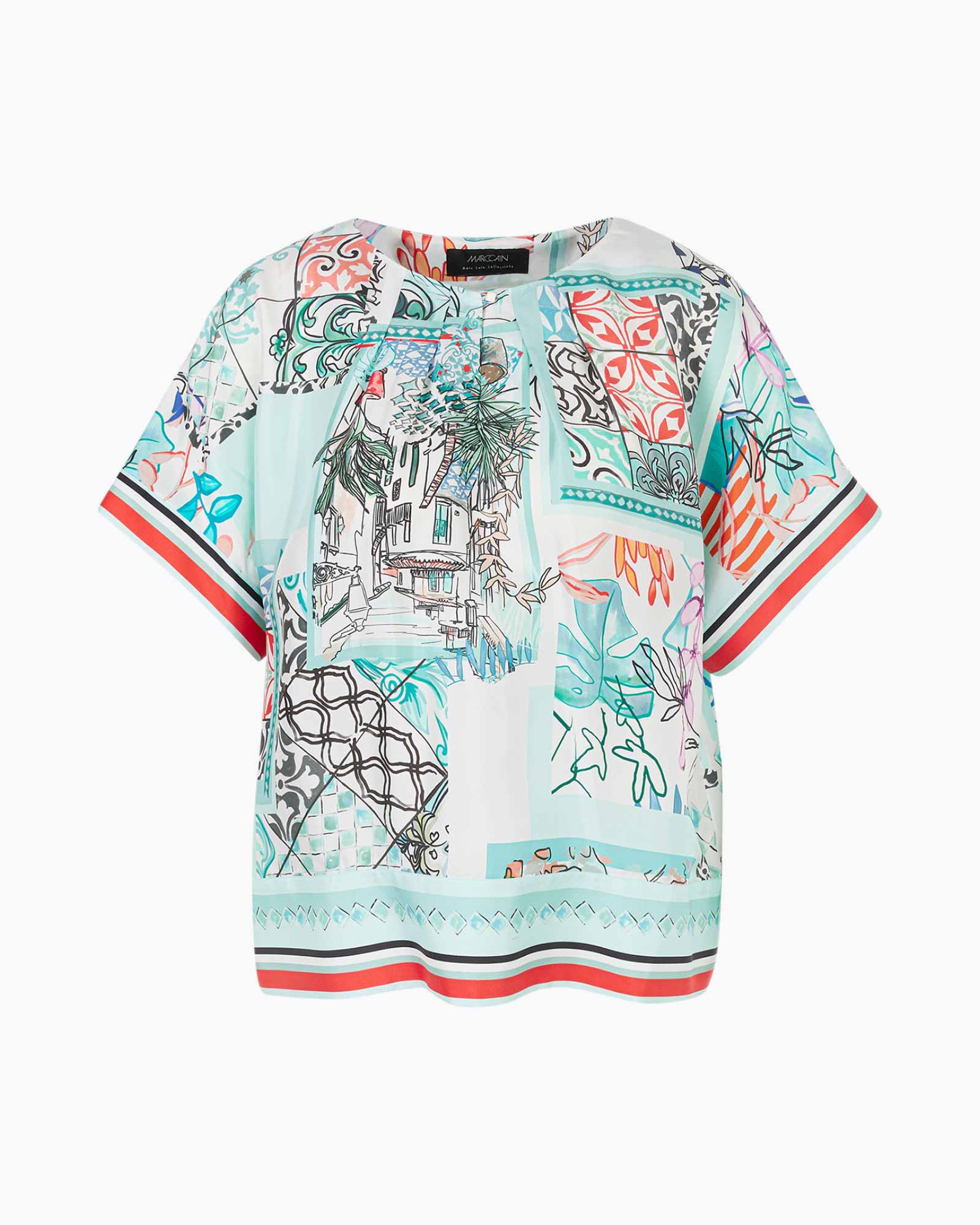 Classy overslagblouse van zachte, vloeiende zijden keperstof. Het model heeft een kimonovorm en een ronde hals met opgestikte plooien. De halsuitsnijding kan worden gesloten met een lus en knoop. De print toont een collage van bloemen, oude tegeldessins en een motief van een ansichtkaart. De zomen zijn geaccentueerd met gestreepte randen.