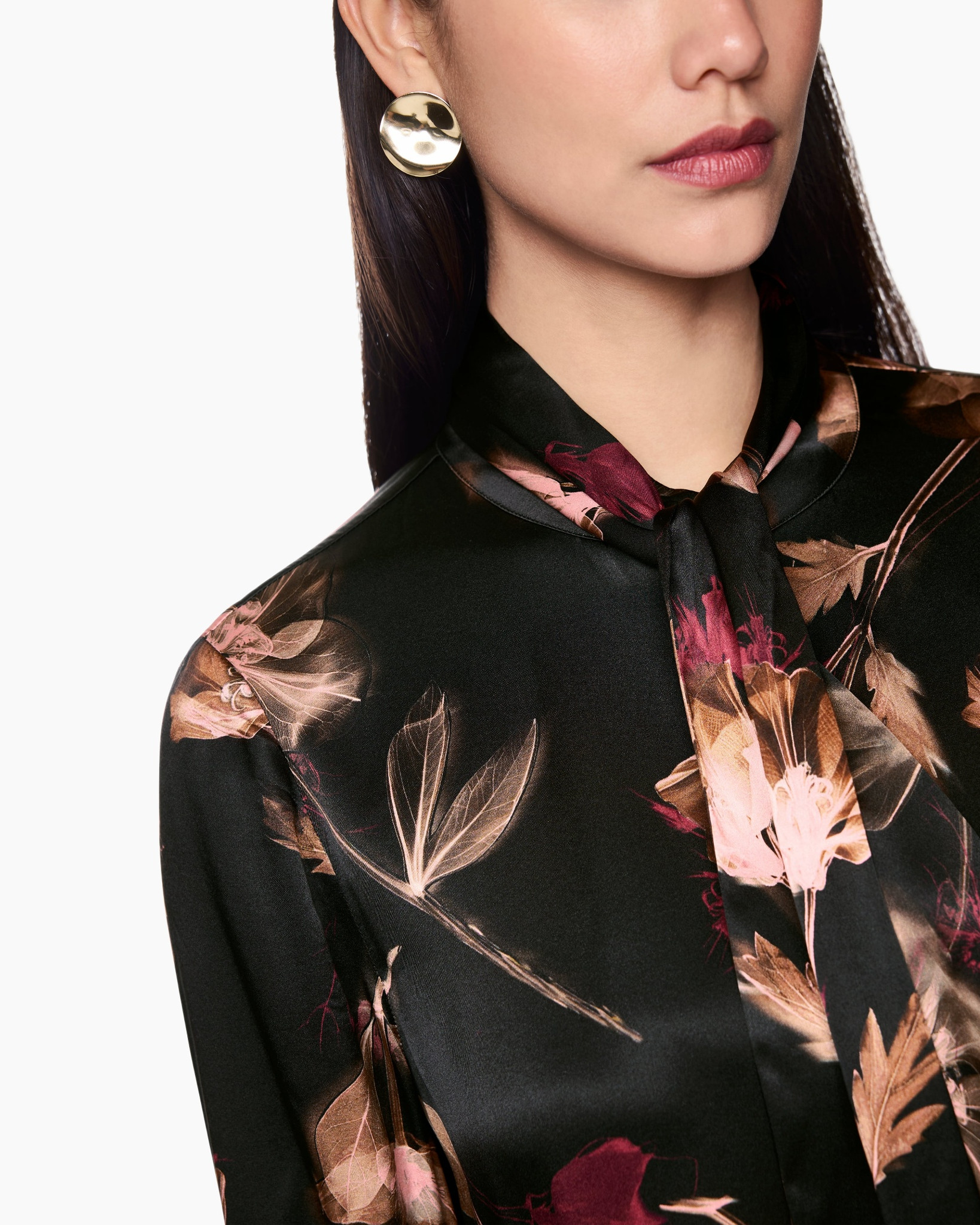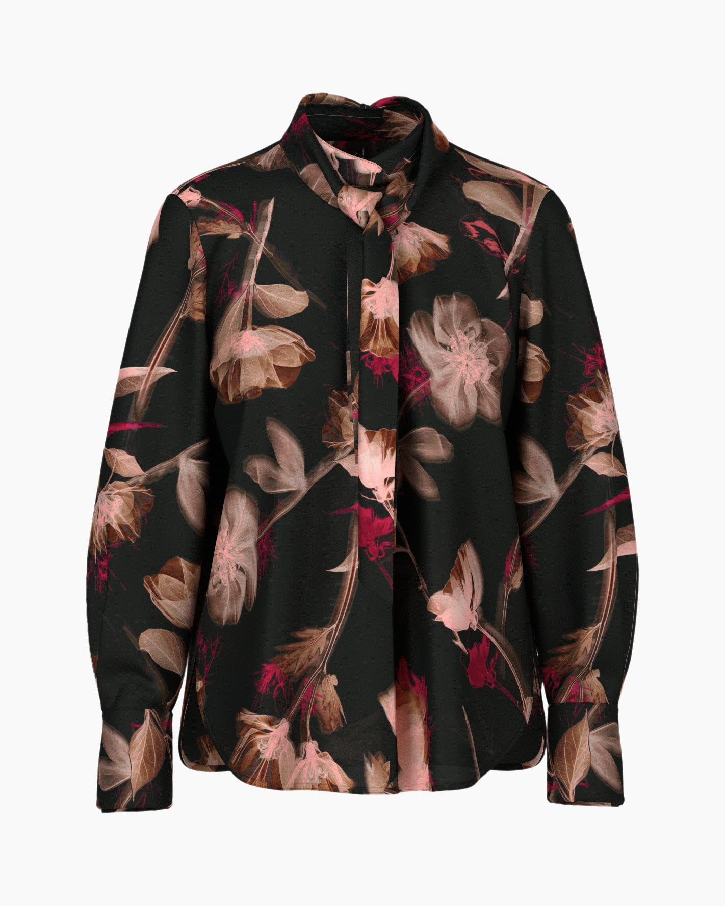 Elegante blouse van zijde met afneembare strik en vrouwelijke bloemenprint. De losse pasvorm, diepe V-hals en fijne splitjes in de mouwen geven haar een luchtige lichtheid en een elegante uitstraling.