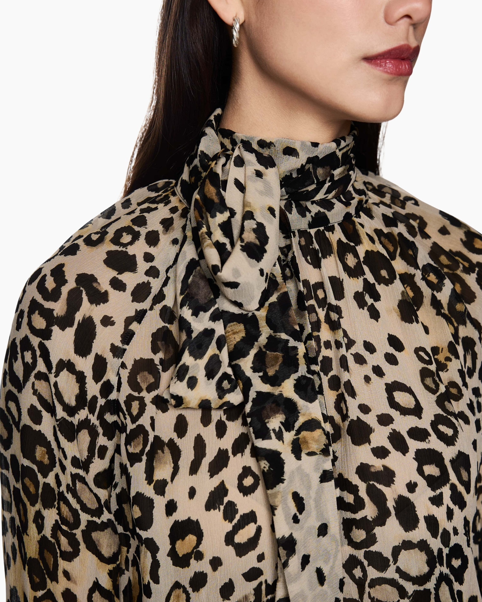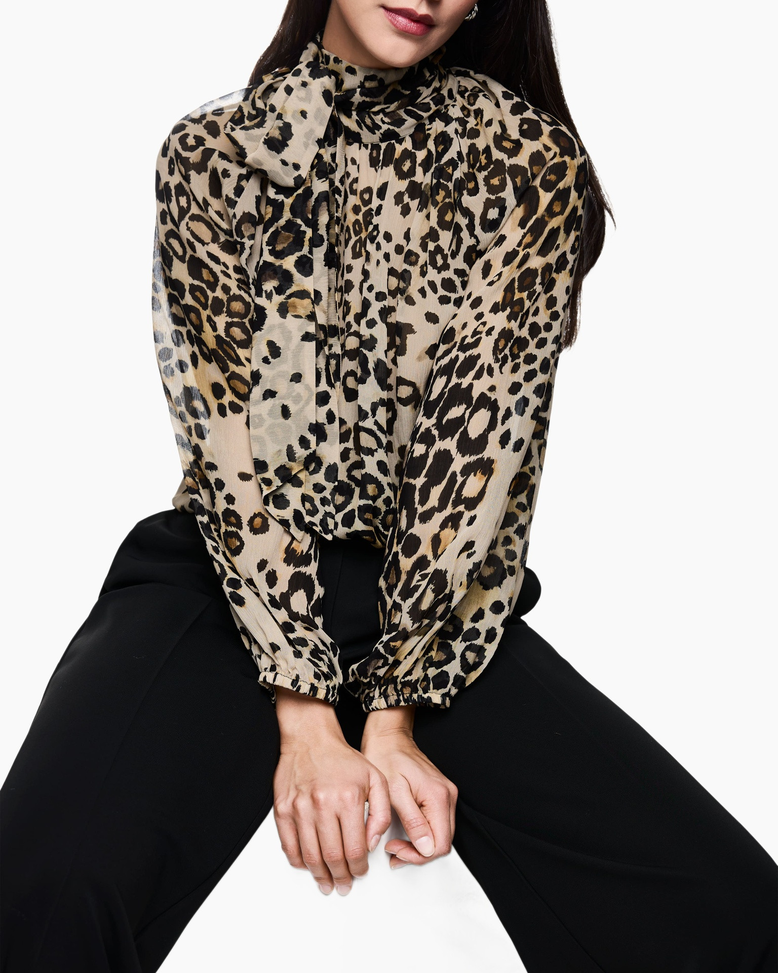Moderne strikblouse met luipaardprint en semitransparante look. De losse pasvorm zorgt voor een aangenaam draagcomfort, terwijl de ballonmouwen met elastiek en de klassieke strikkraag stijlvolle accenten zetten. Een eigentijdse blouse voor een zelfverzekerde, modieuze uitstraling.