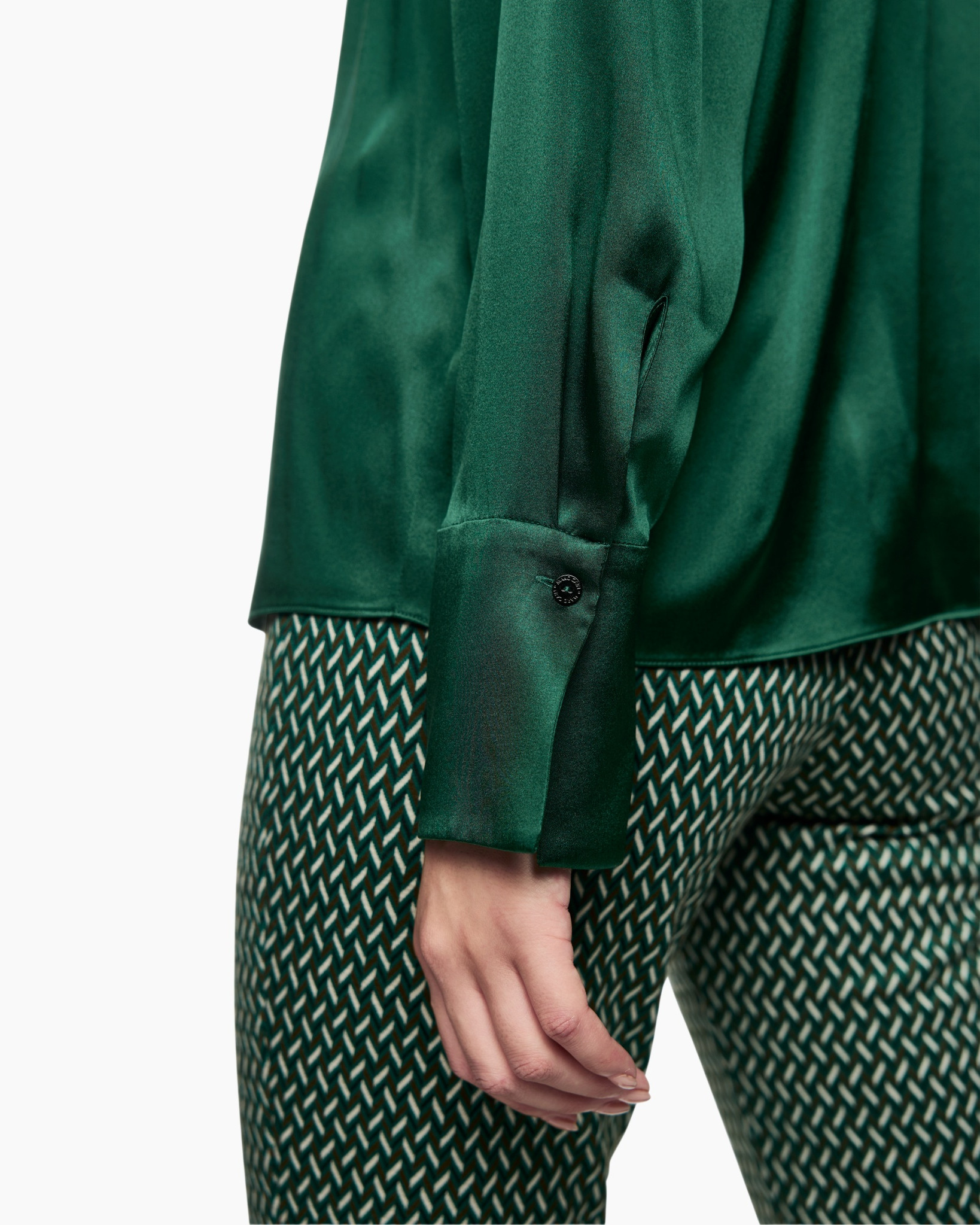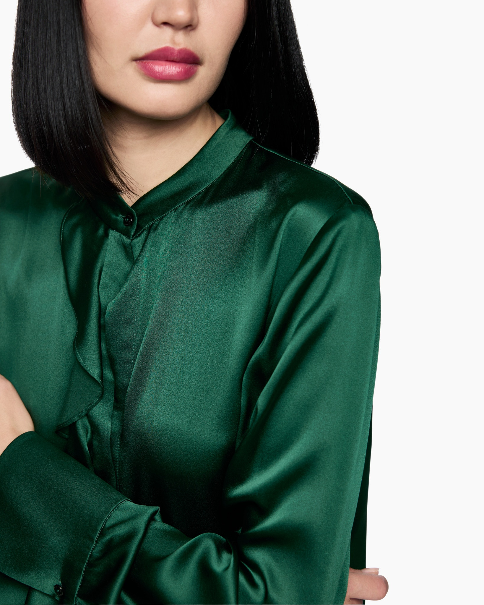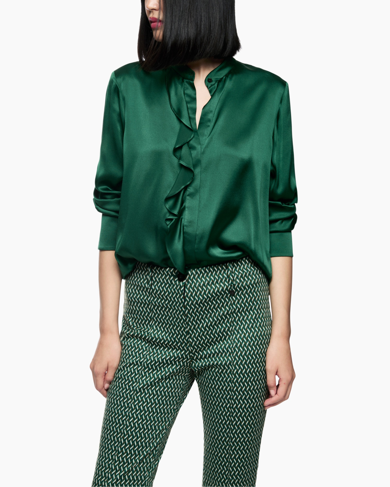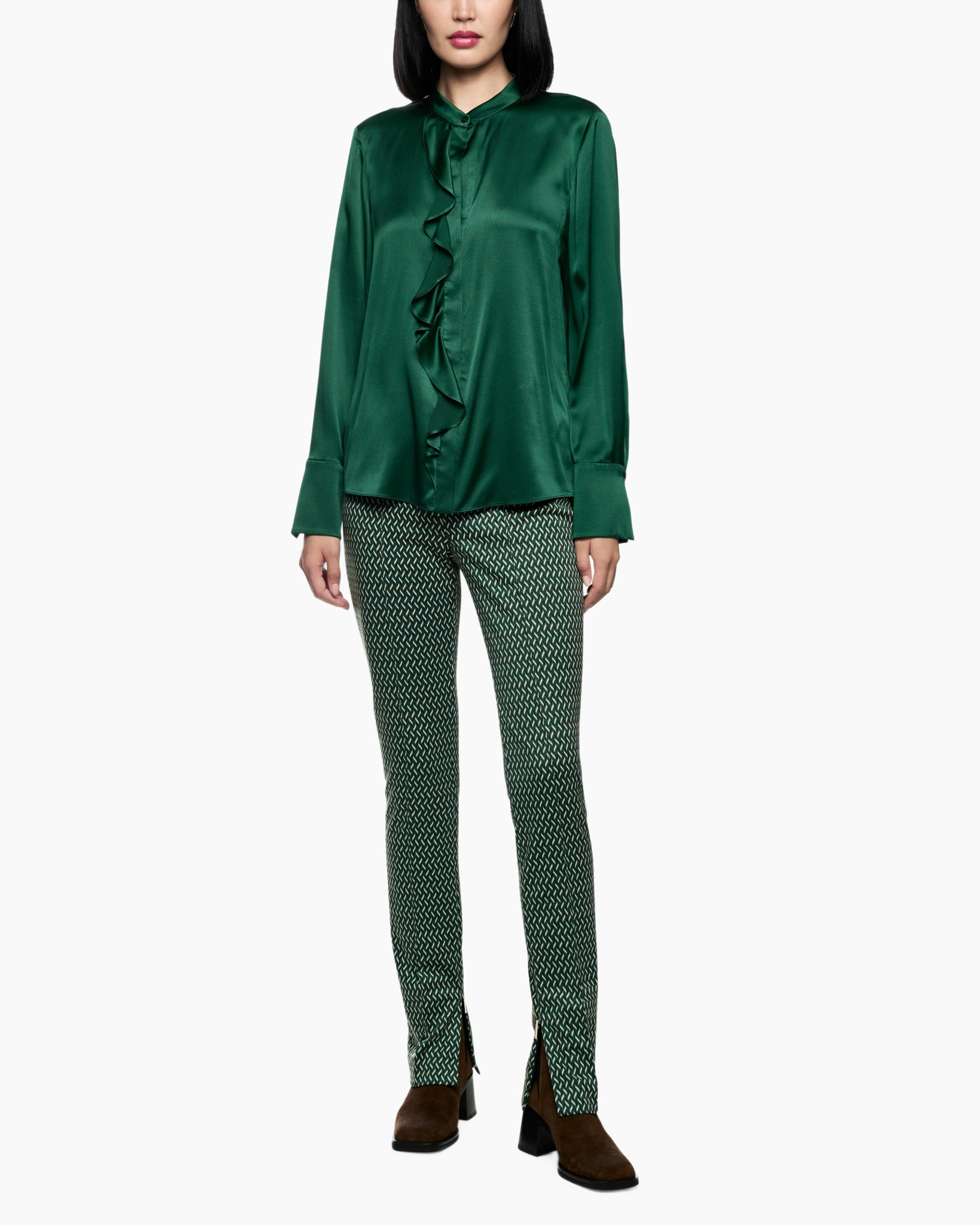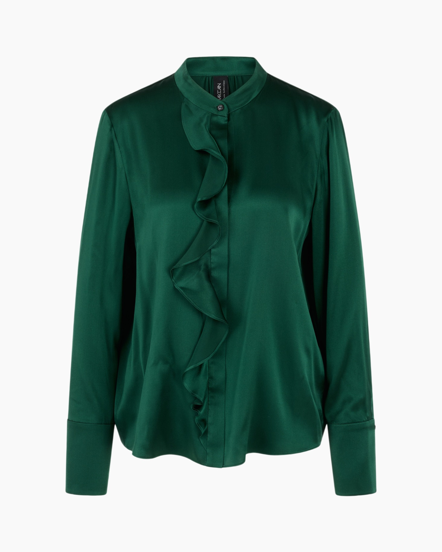 Blouse Zc 51.24 W78 Groen van Marc Cain Collections voegt direct iets speciaals toe aan je garderobe. Deze blouse pakt de aandacht met zijn diepe smaragdgroene tint en een soepele, licht glanzende stof die prachtig valt. Je ziet direct de losvallende pasvorm, gecombineerd met een opstaande kraag en ruches langs de V-halslijn aan de voorzijde. De mouwen zijn ruim gesneden en sluiten af met brede manchetten, elk voorzien van knoopjes. Een rechte snit maakt dit een comfortabel kledingstuk, perfect voor diverse gelegenheden.
