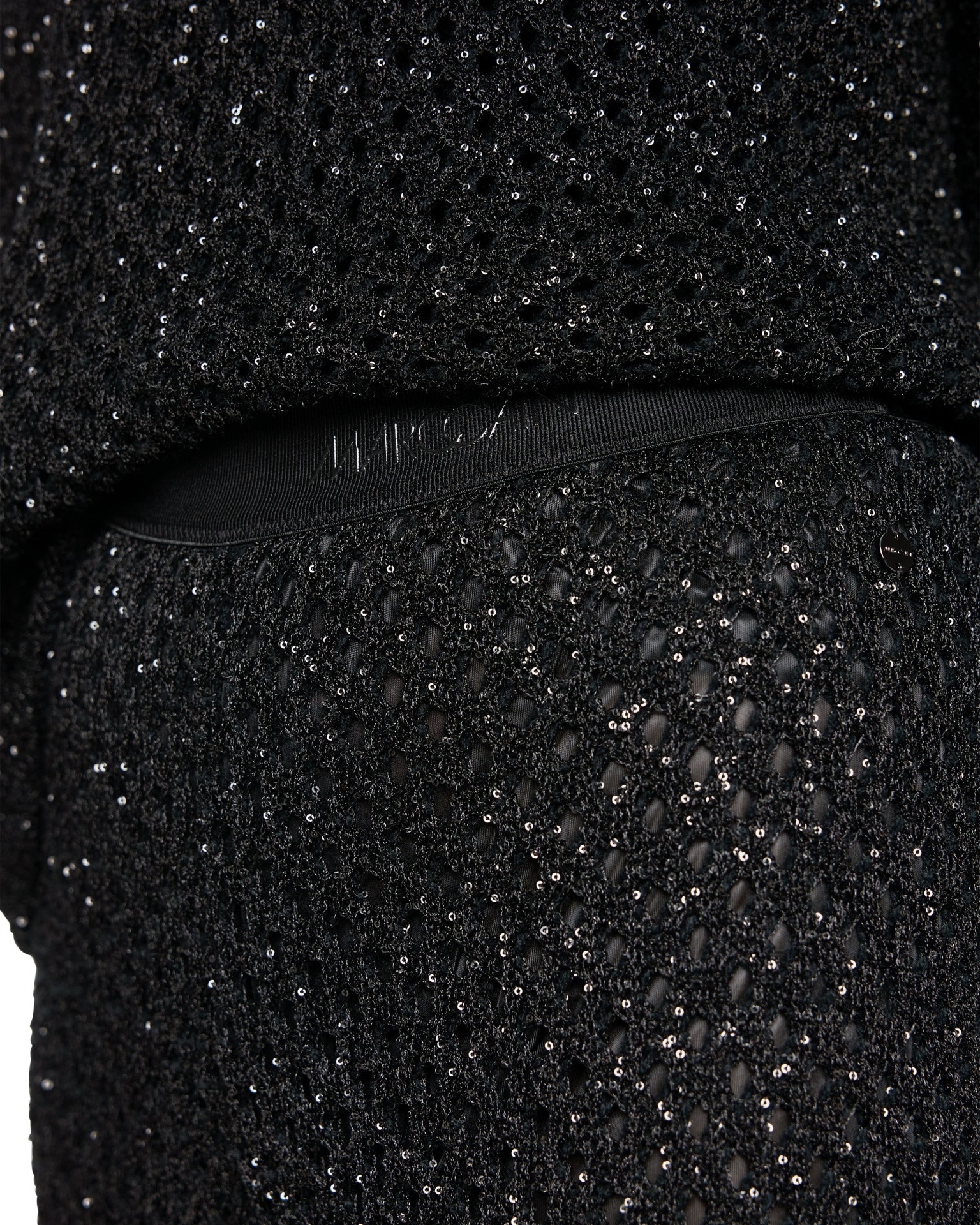Broek Ac 81.49 M33 Zwart van Marc Cain Collections is een wijde broek die direct de aandacht trekt. Je ziet een rechtvallend model dat ruim valt rond de benen, uitlopend aan de onderkant voor een krachtig silhouet. De diepzwarte kleur van de stof krijgt extra glans door de subtiele, ingeweven pailletten die je overal terugvindt. Dit item heeft een elastische tailleband, wat zorgt voor een hoog draagcomfort en een naadloze pasvorm rond de heupen.