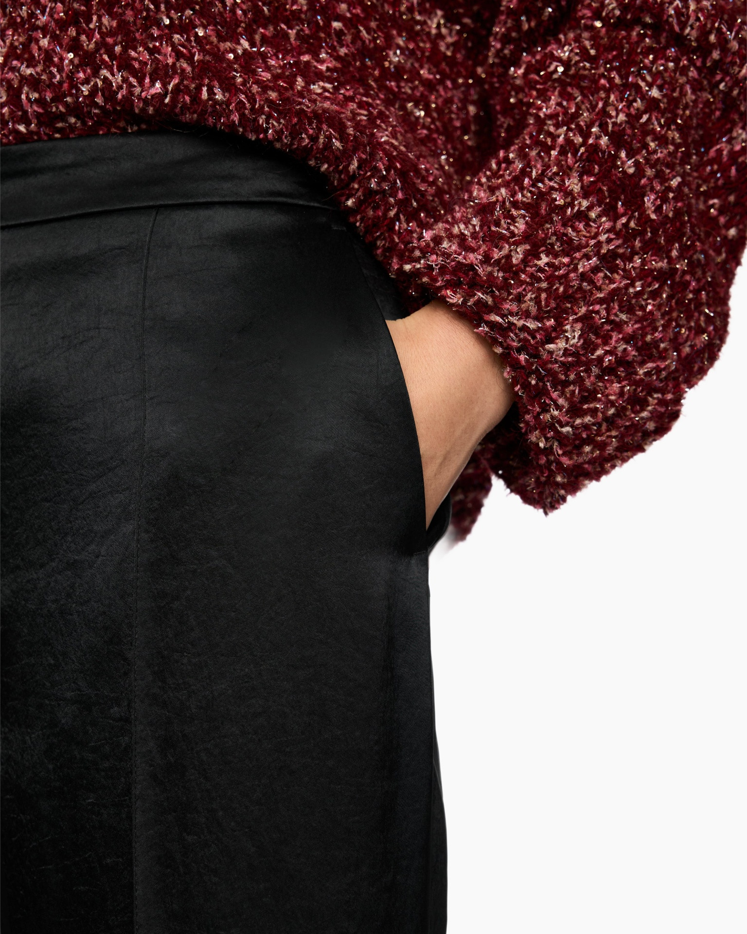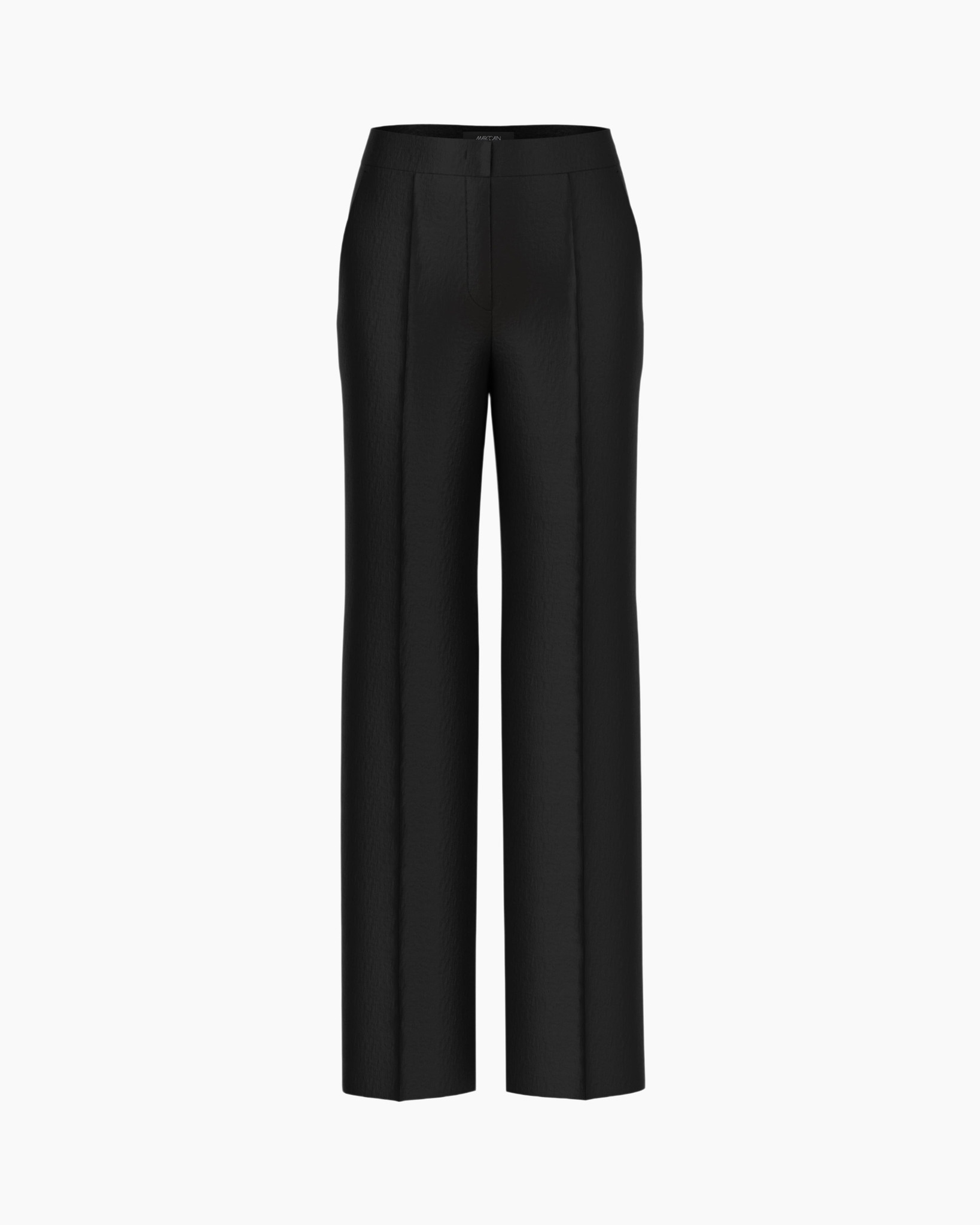 Kies je voor Broek Zc 81.12 W46 Zwart van Marc Cain Collections, dan haal je een broek in huis die je draagt voor veel gelegenheden. De stof valt heerlijk soepel en heeft een prachtige diepzwarte kleur met een verfijnde glans, wat direct de aandacht trekt. Je ziet een ruimvallende pasvorm met wijde pijpen die vanuit de hoge taillelijn mooi naar beneden vallen. Dit biedt je een comfortabele bewegingsvrijheid. De tailleband oogt strak en is aan de voorzijde vrij van zichtbare sluitingen, wat zorgt voor een nette afwerking. Aan de zijkanten vind je praktische steekzakken. Een subtiele verticale naad loopt over de voorkant van elke pijp, wat de broek een verzorgde lijn geeft.