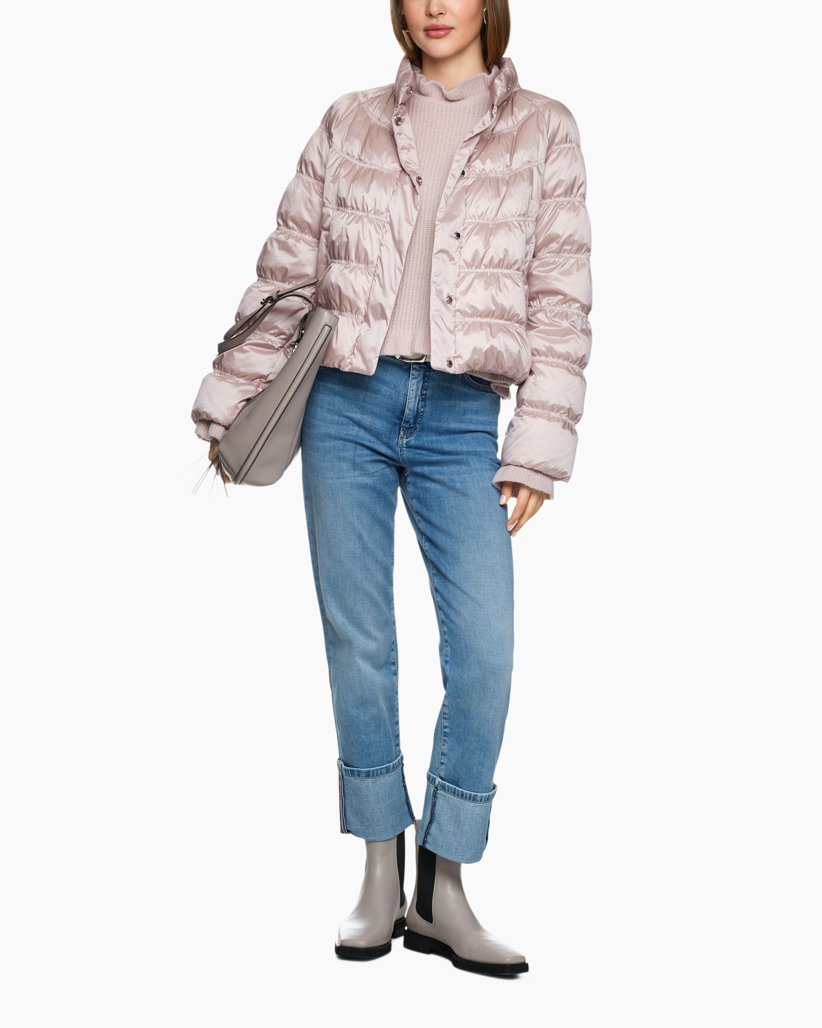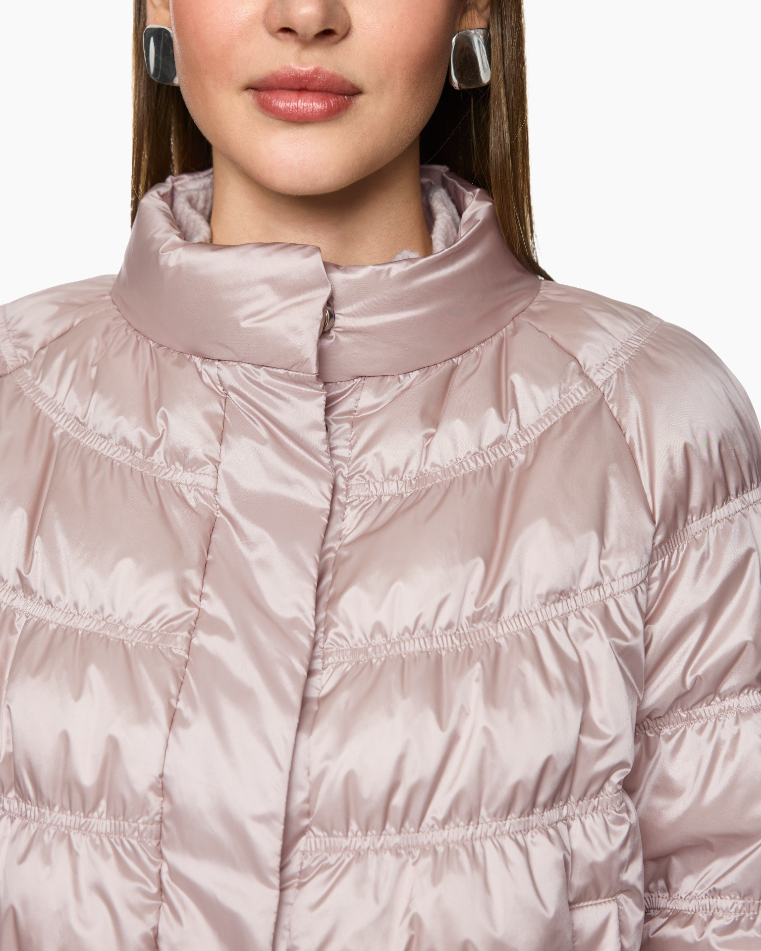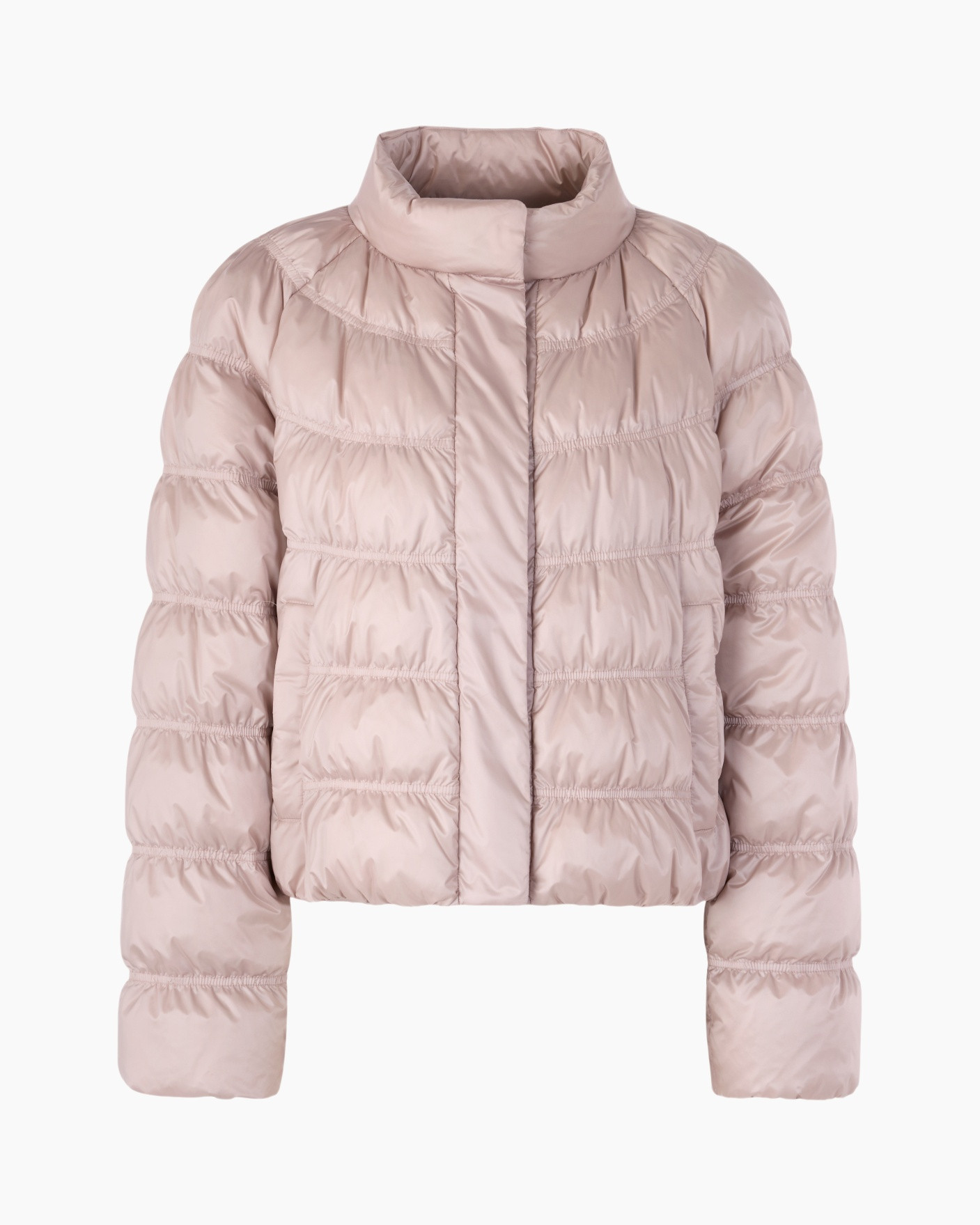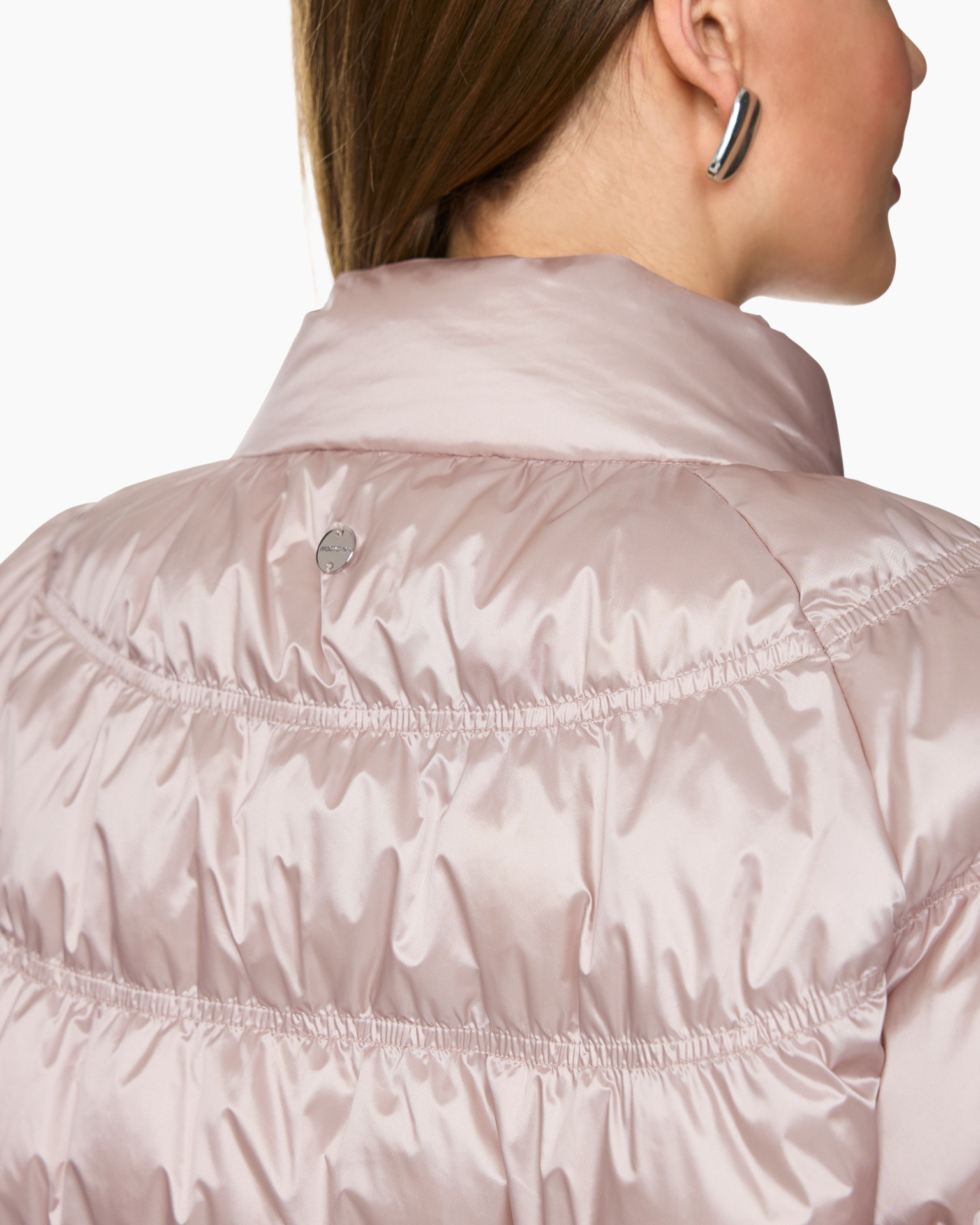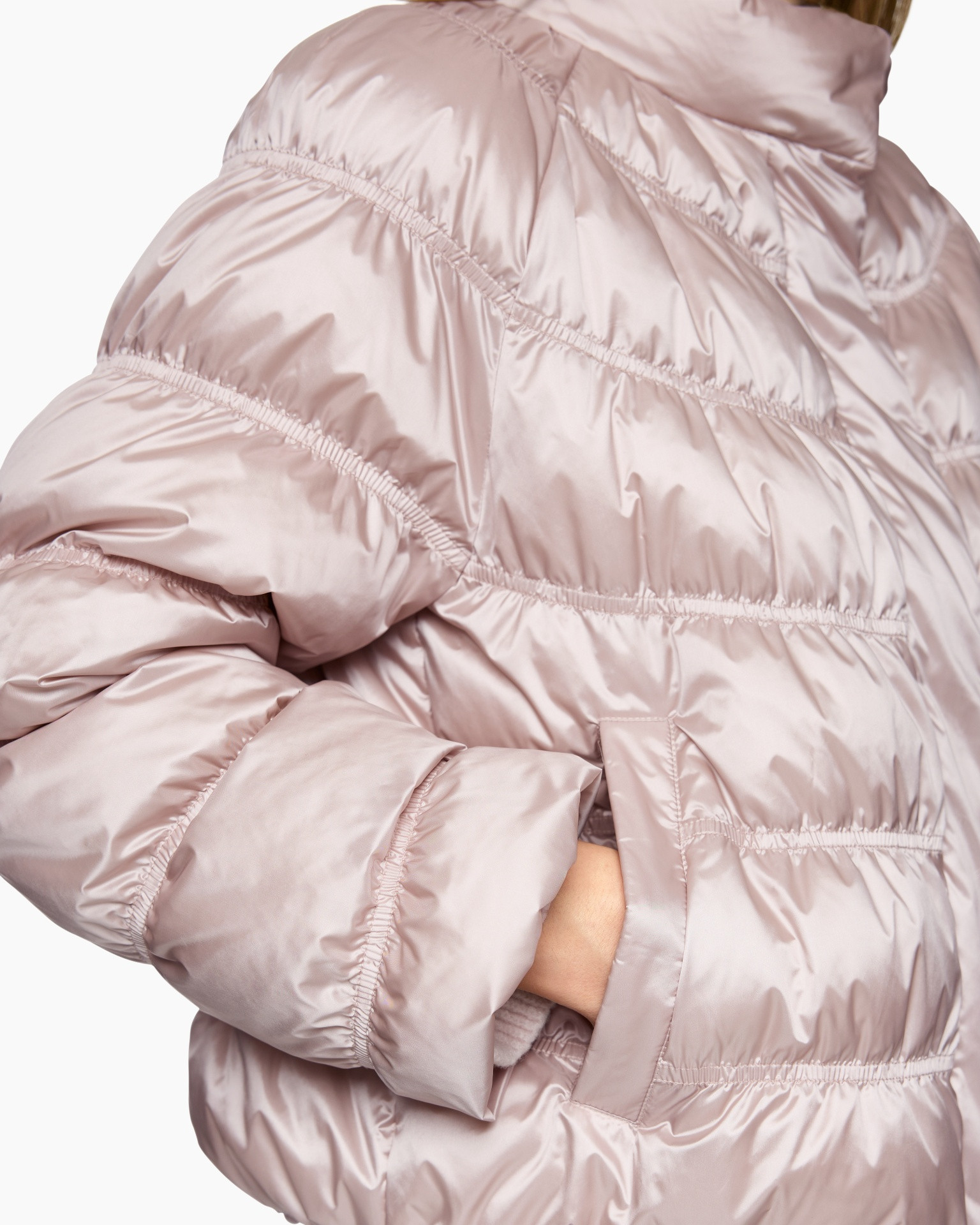De wijde pasvorm en raglanmouwen geven het jasje met synthetisch dons een relaxte look. Opvallende details zijn de glanzende stof en het bijzondere stiksel. Daarnaast heeft het jasje een opstaande kraag en een verborgen knoopsluiting. Het artikel draagt het duurzaamheidslabel 'Rethink Together'.
