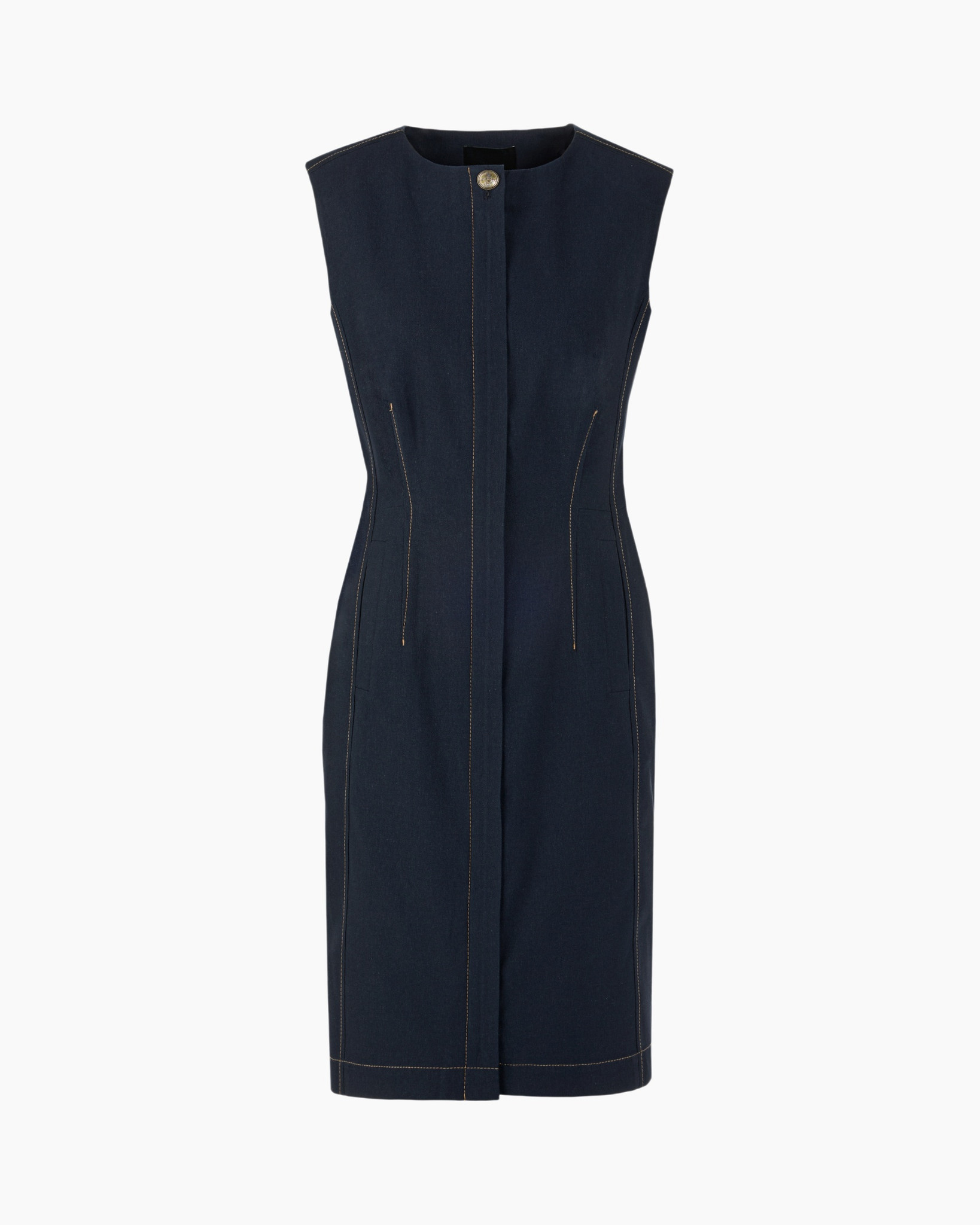 De Jurk Ac 21.16 W05 Blauw van Marc Cain Collections is een mouwloze jurk met een recht model, die jouw postuur benadrukt. De donkerblauwe stof, die aan denim doet denken, krijgt karakter door de contrasterende stiksels. Een lange rits aan de voorkant loopt door tot een split, wat je bewegingsvrijheid geeft. Steekzakken aan de zijkant bieden ruimte voor je spullen. De ronde halslijn heeft een enkele knoop dicht bij de schouder.