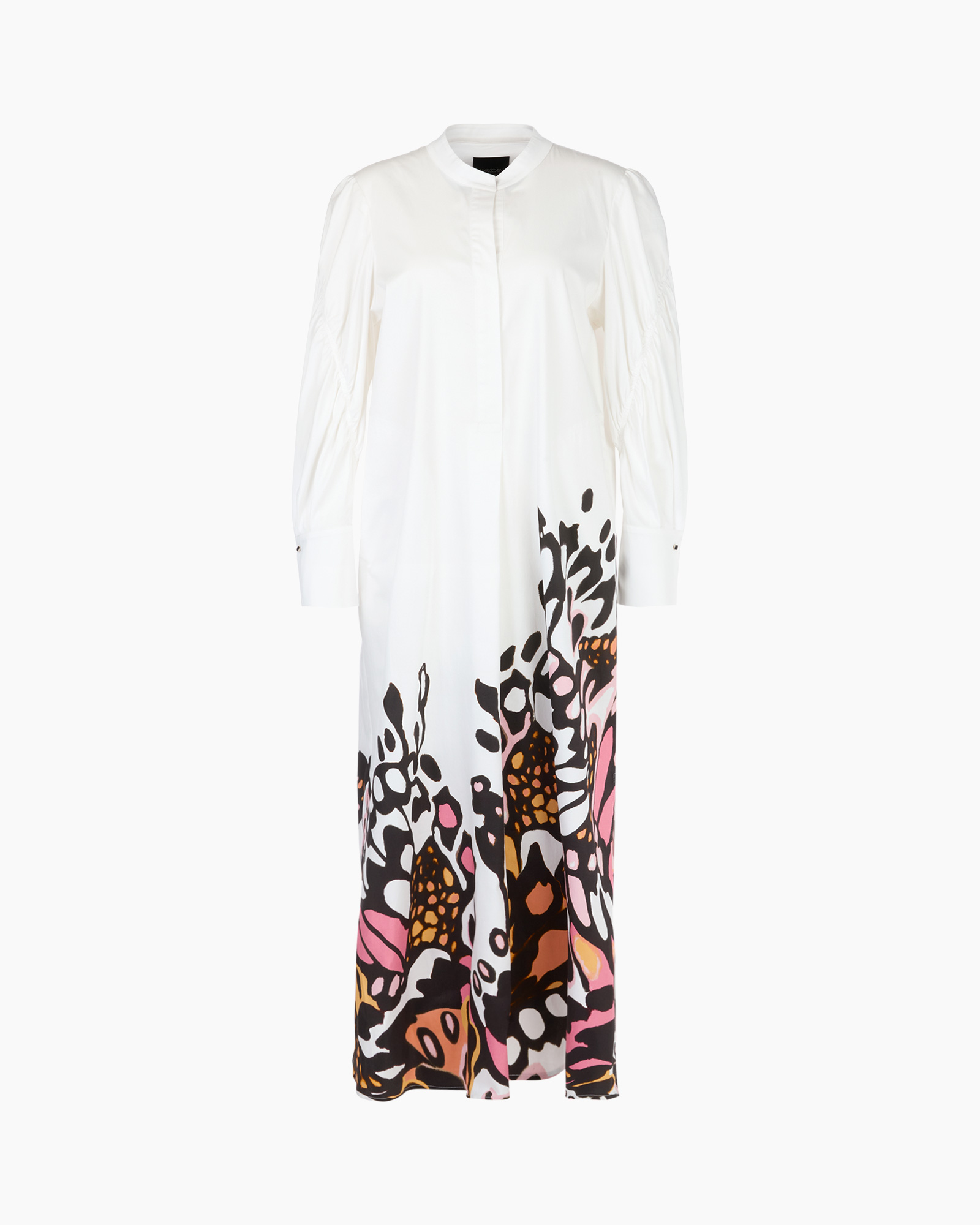 Jurk voor speciale gelegenheden. De zoom van deze jurk is versierd met een print die eruitziet als een kunstwerk. Het model is losjes en heeft een halve knoopsluiting. De mouwen zijn wijd en hebben diagonale sierstiksels. De enkellange jurk is gemaakt van stretchkatoen en zeer comfortabel om te dragen. Een split zorgt voor bewegingsvrijheid.
