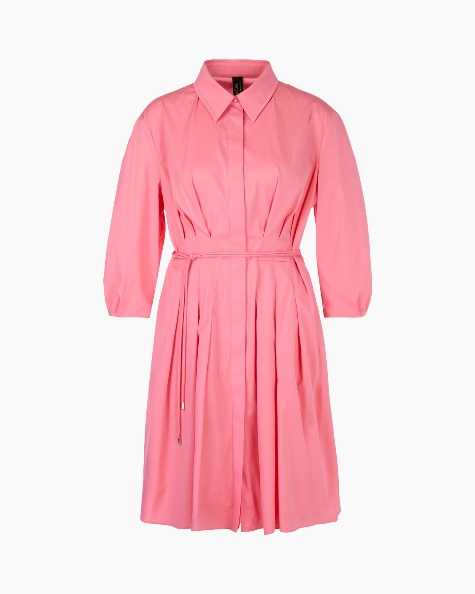 Deze overhemdjurk met uitlopende plooirok heeft een vrouwelijke touch. Het heeft een blinde knoopsluiting over de hele lengte. De wijde mouwen zijn driekwart lang en eindigen in plooien. Een ton-sur-ton ceintuur geeft het wijde silhouet een getailleerde vorm. Comfortabel: de jurk is gemaakt van een vloeiende katoenmix.