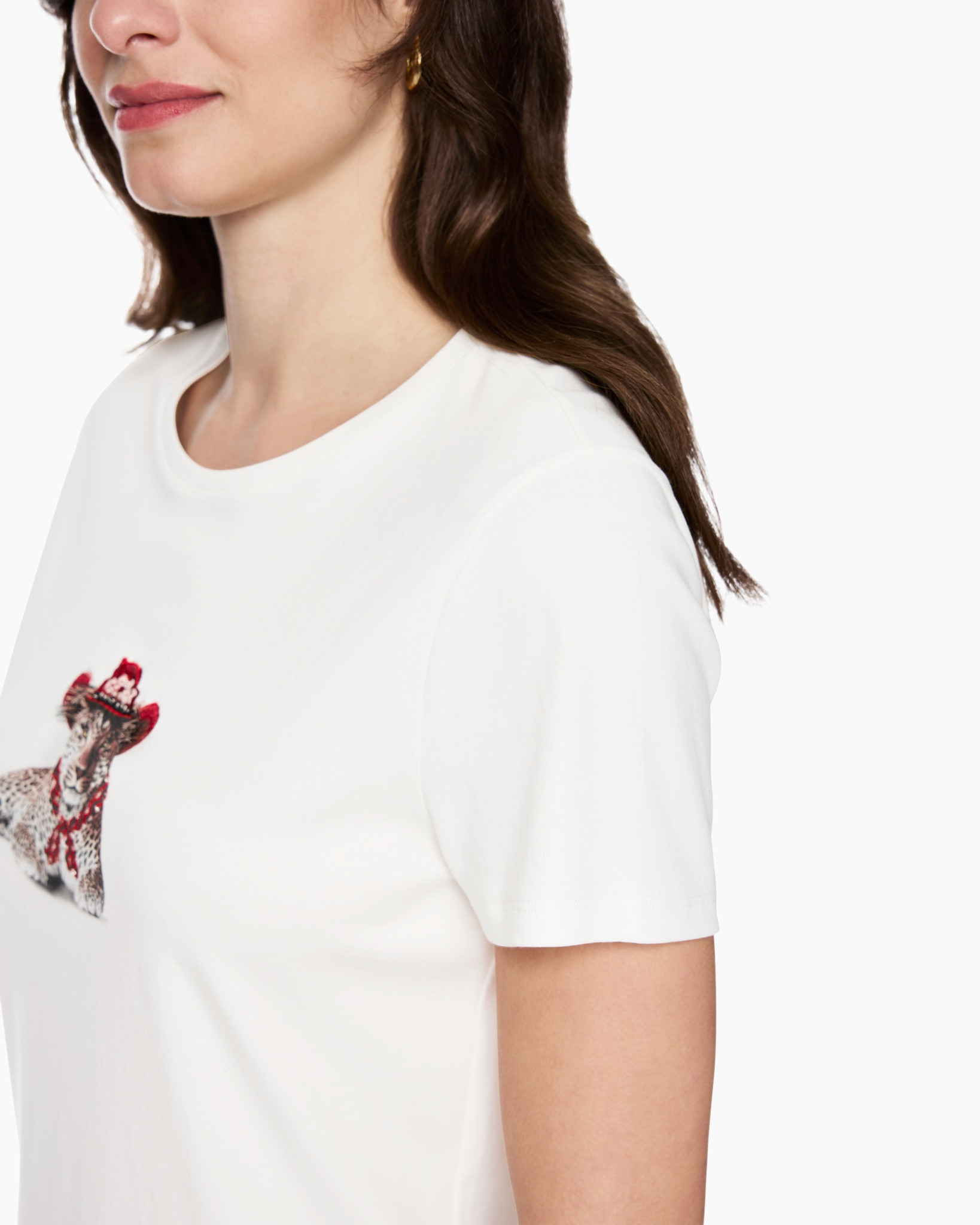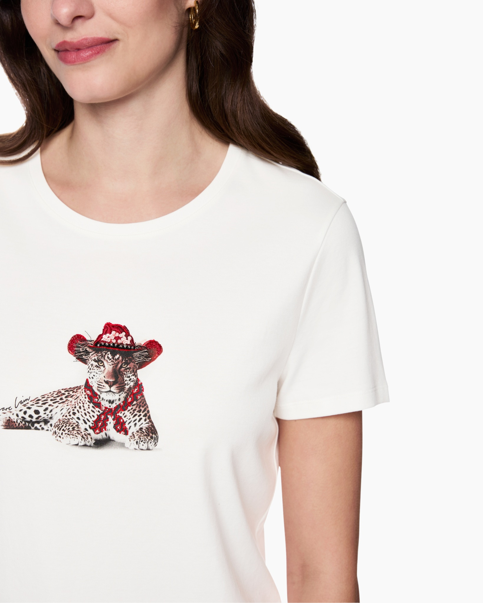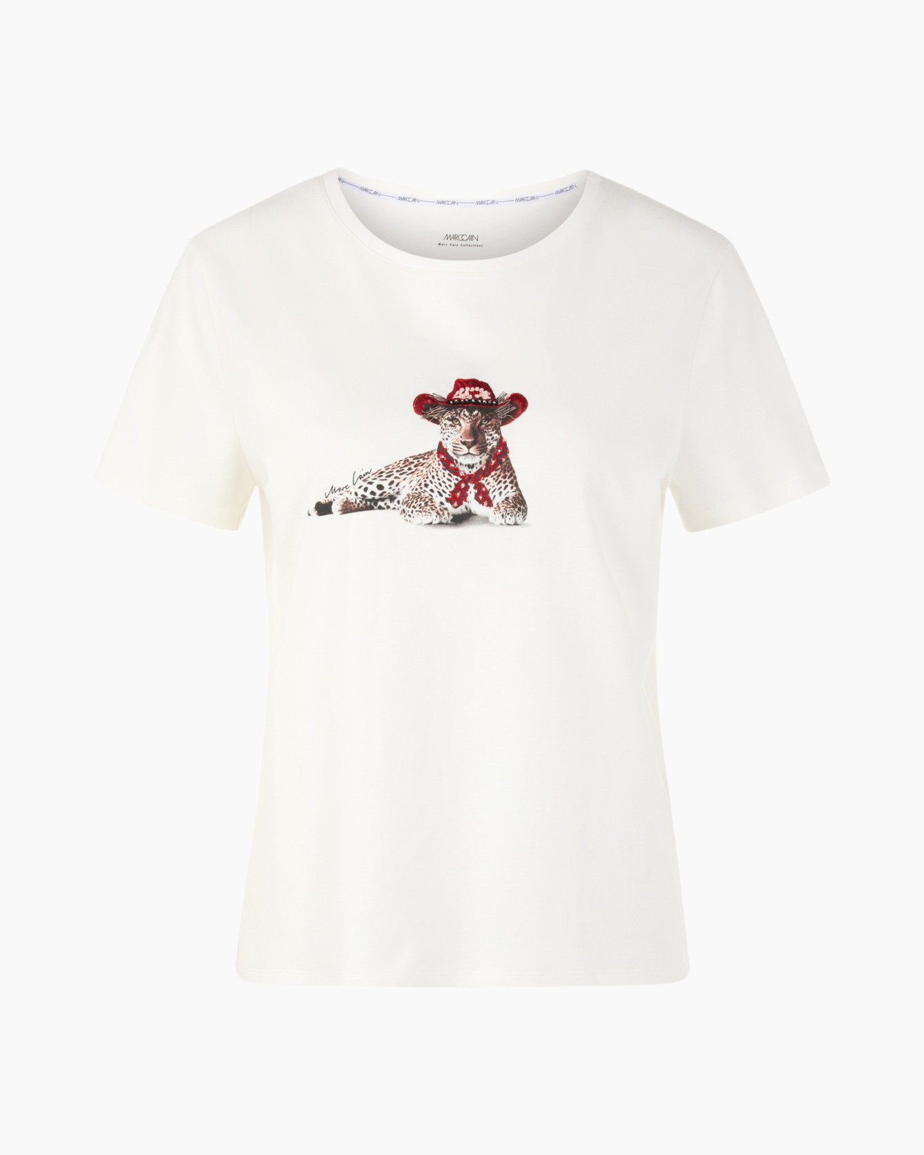 T-shirt Ac 48.32 J17 Off White van Marc Cain Collections is een prettige basis voor je garderobe. Dit T-shirt heeft een rechte pasvorm en een klassieke ronde hals. De off-white kleur maakt het shirt makkelijk te combineren. Op de voorkant zie je een opvallende print van een luipaard met een rode cowboyhoed en sjaal. De korte mouwen maken dit T-shirt ideaal voor warmere dagen.