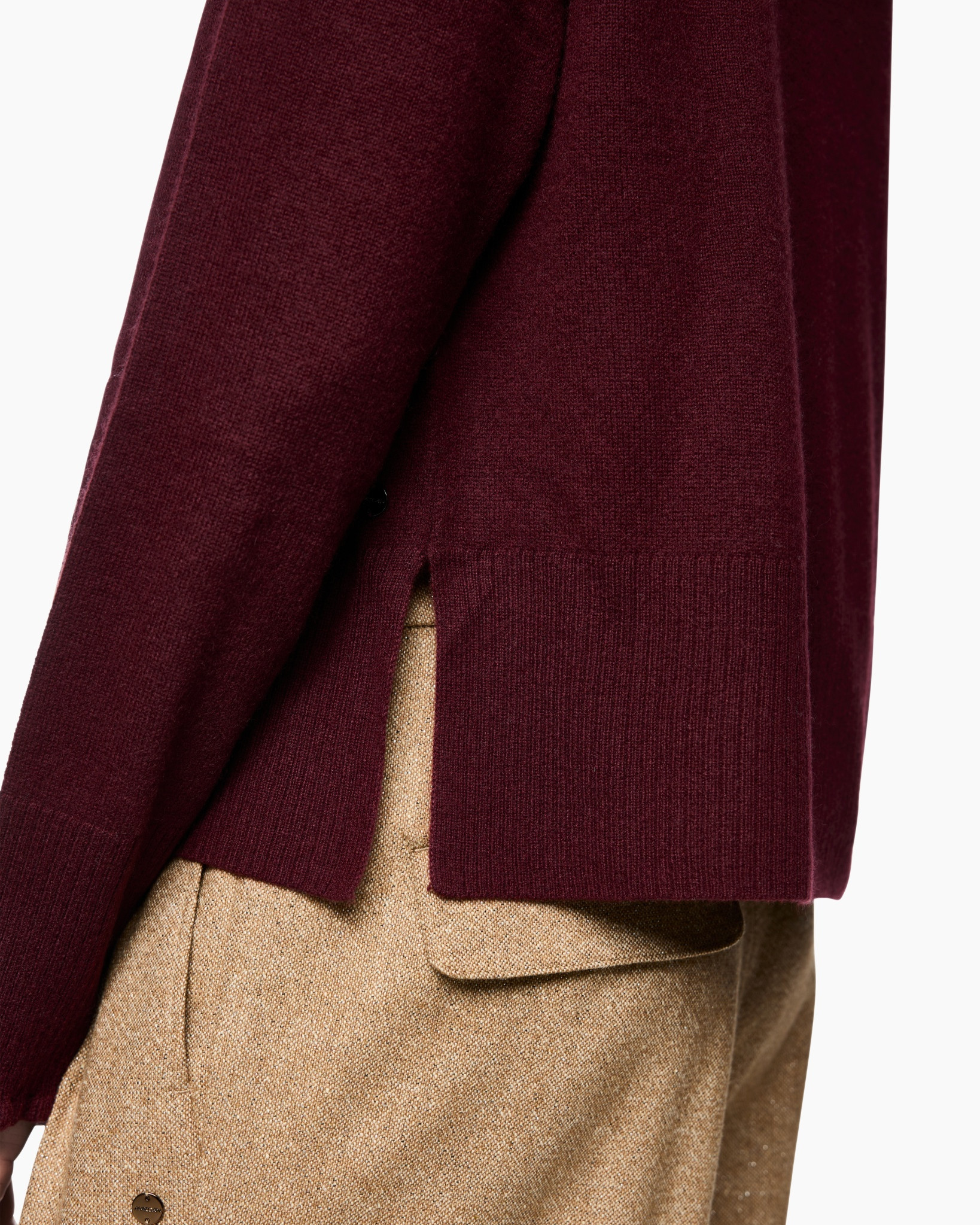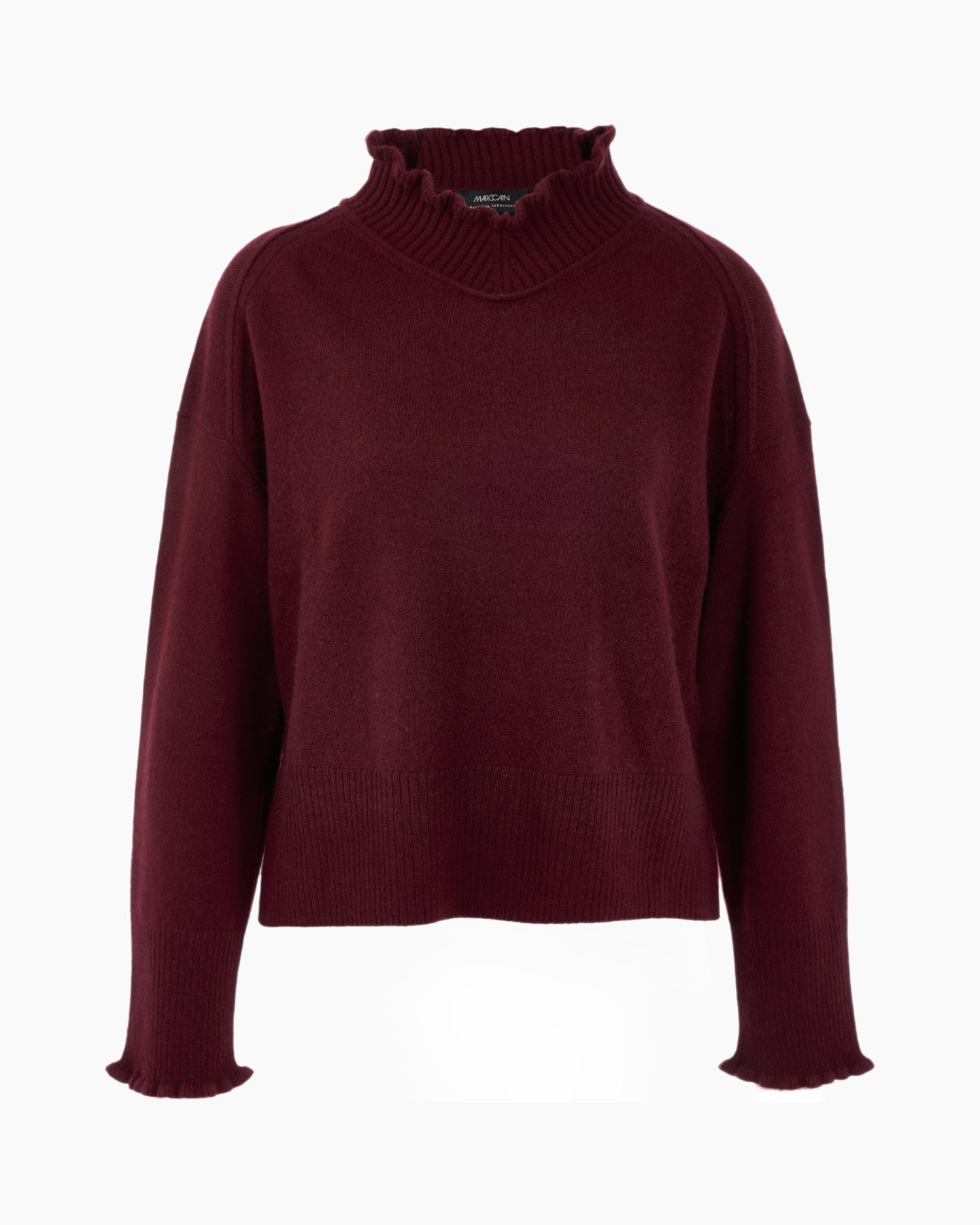 Hier zie je de Trui Zc 41.25 M68 Diverse van Marc Cain Collections, een fijne trui die je garderobe compleet maakt. Je ziet meteen de relaxte pasvorm die soepel valt, met ruimere mouwen en een rechte onderkant. De diepe bordeauxrode kleur geeft de trui een warme uitstraling. Kijk eens naar de opvallende rucheskraag die hoog sluit, en de golvende afwerking aan de mouwboorden. Een subtiel detail vind je in de korte splitten aan beide zijkanten van de boord.