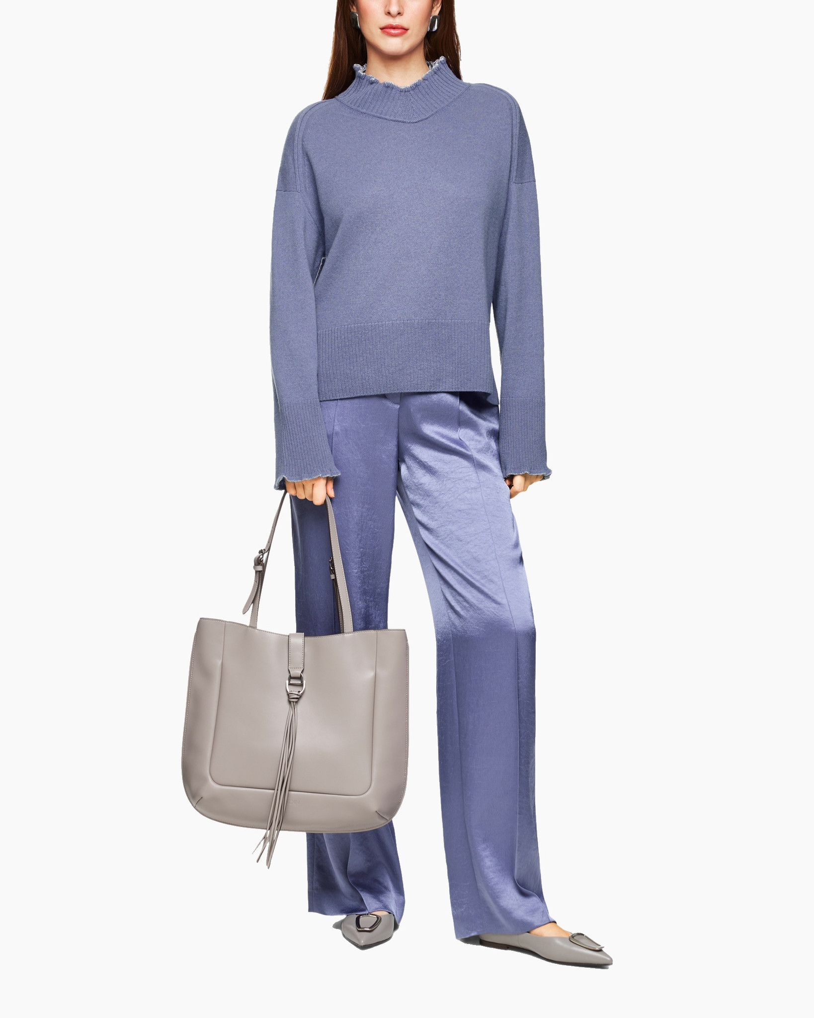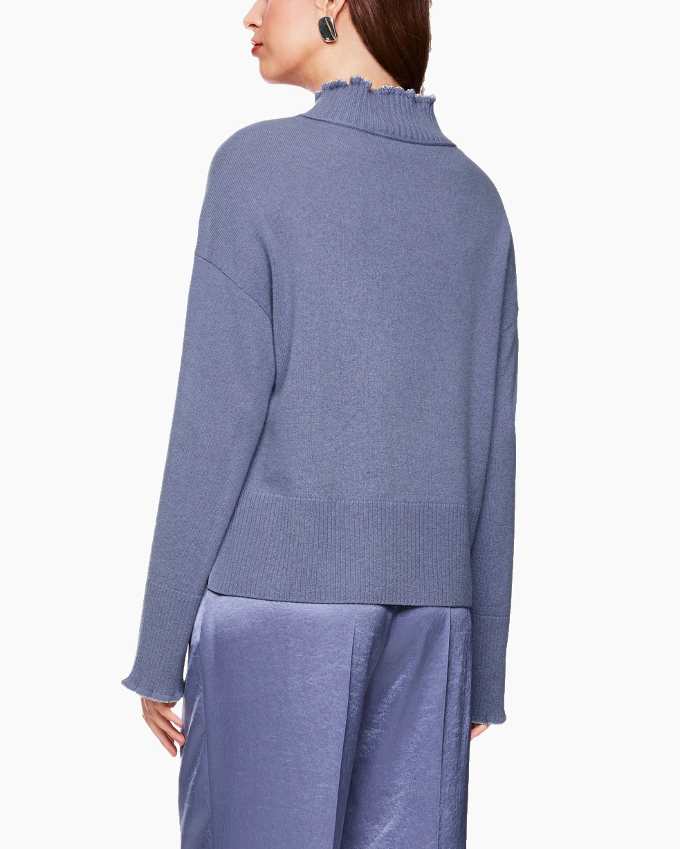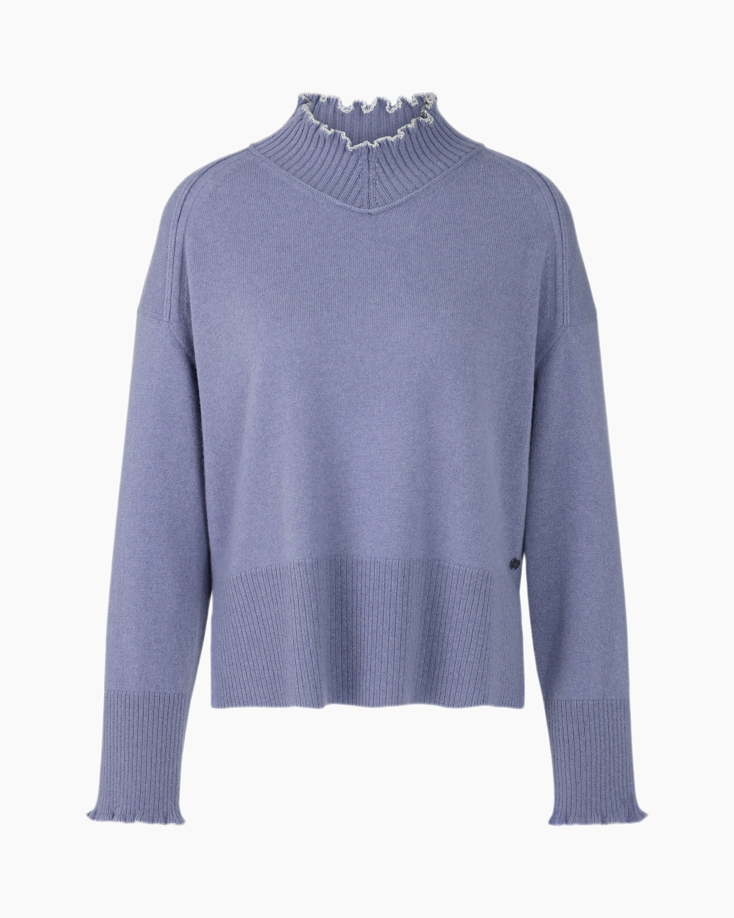 De gebreide trui heeft een rechte pasvorm en valt op door de subtiele ruches aan de hals en de mouwboorden. De raglanmouwen geven hem een nonchalante uitstraling. Een speels detail zijn de boorden aan de hals en de mouwen, die zijn afgewerkt met glinsterend effectgaren.