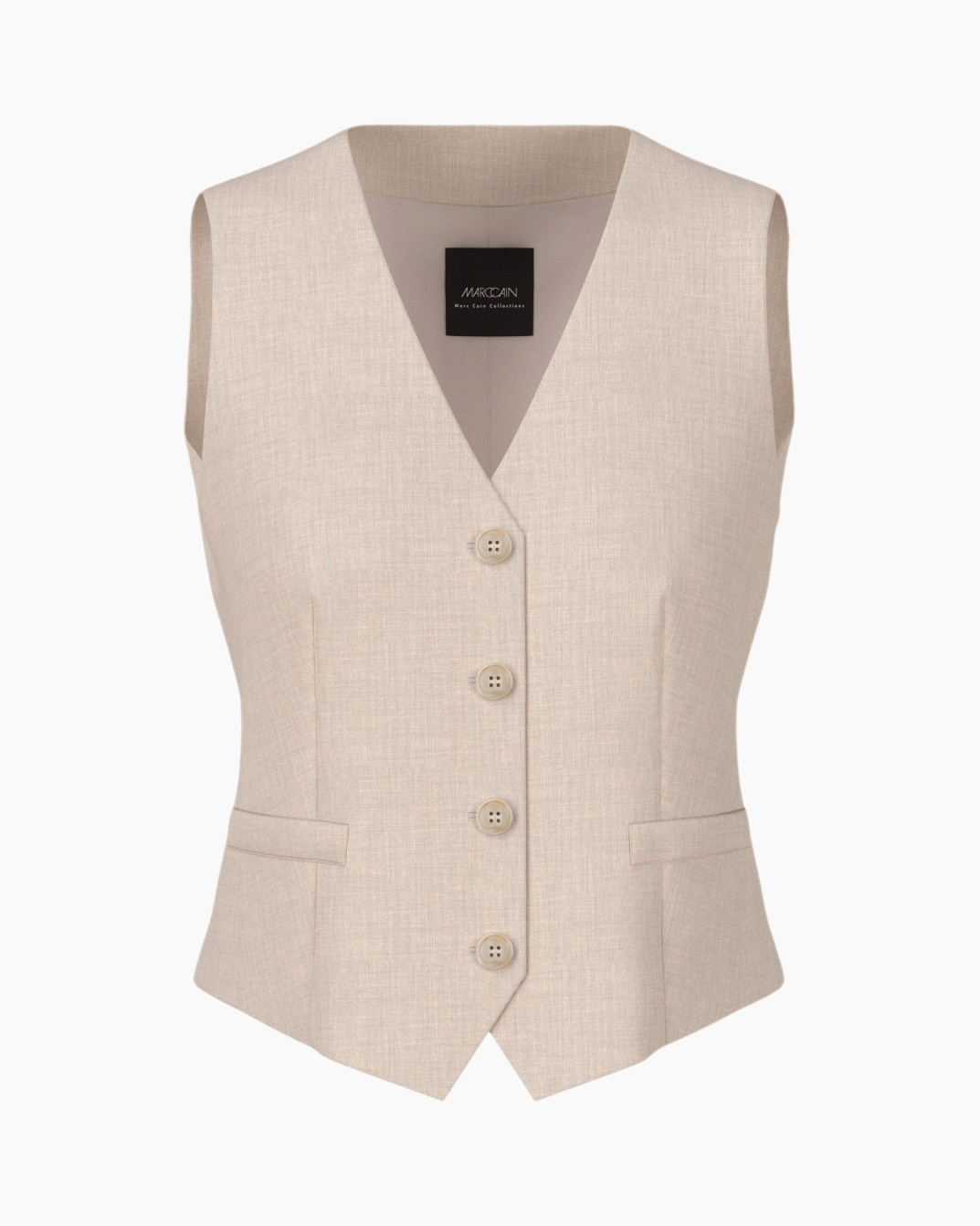 Met het Vest Zc 37.03 W77 X van Marc Cain Collections voeg je een veelzijdig kledingstuk toe aan je garderobe. Dit mouwloze vest, uitgevoerd in een zandkleur, heeft een licht getailleerde pasvorm die je figuur subtiel accentueert. De diepe V-halslijn zorgt voor een open uitstraling, terwijl de vijf knopen in bijpassende tint een nette sluiting bieden. Twee paspelzakken sieren de voorkant van het vest. Je draagt dit vest kort, tot net boven de heupen.