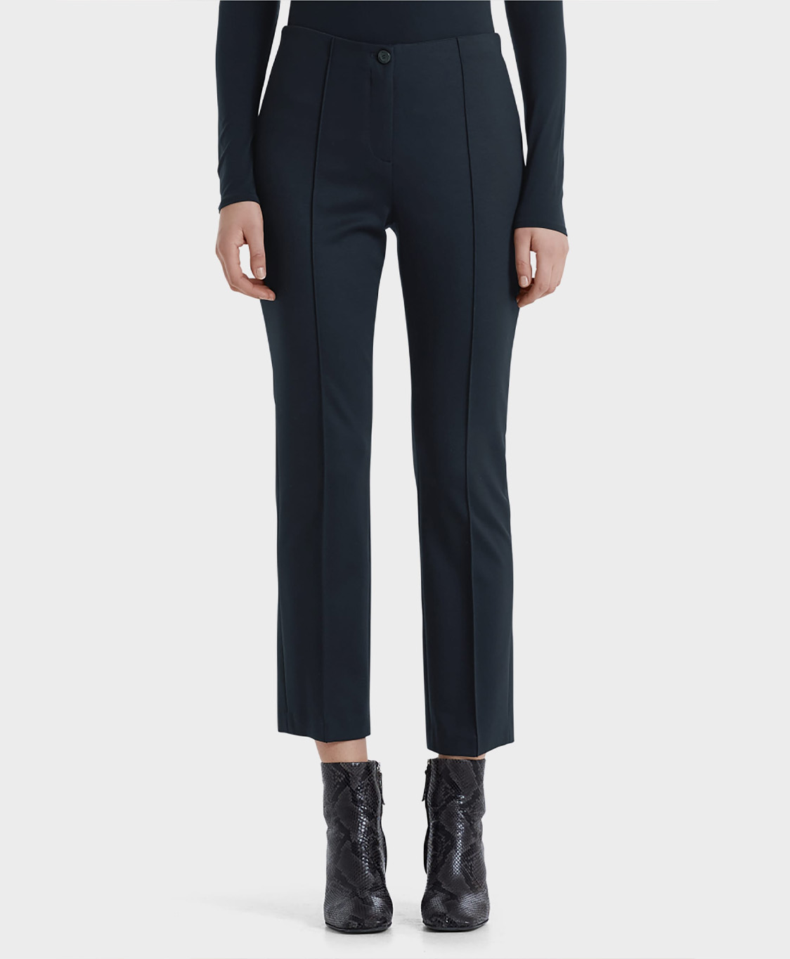 7/8 pantalon in slank model met scherpe vouw en elastische tailleband. De pantalon heeft rechte pijpen en wordt aan de voorkant met een ritssluiting en knoop gesloten. Het model heeft een lengte van 179 cm en draagt maat N3/38. Materiaal: 69% viscose, 29% polyamide en 2% elastaan