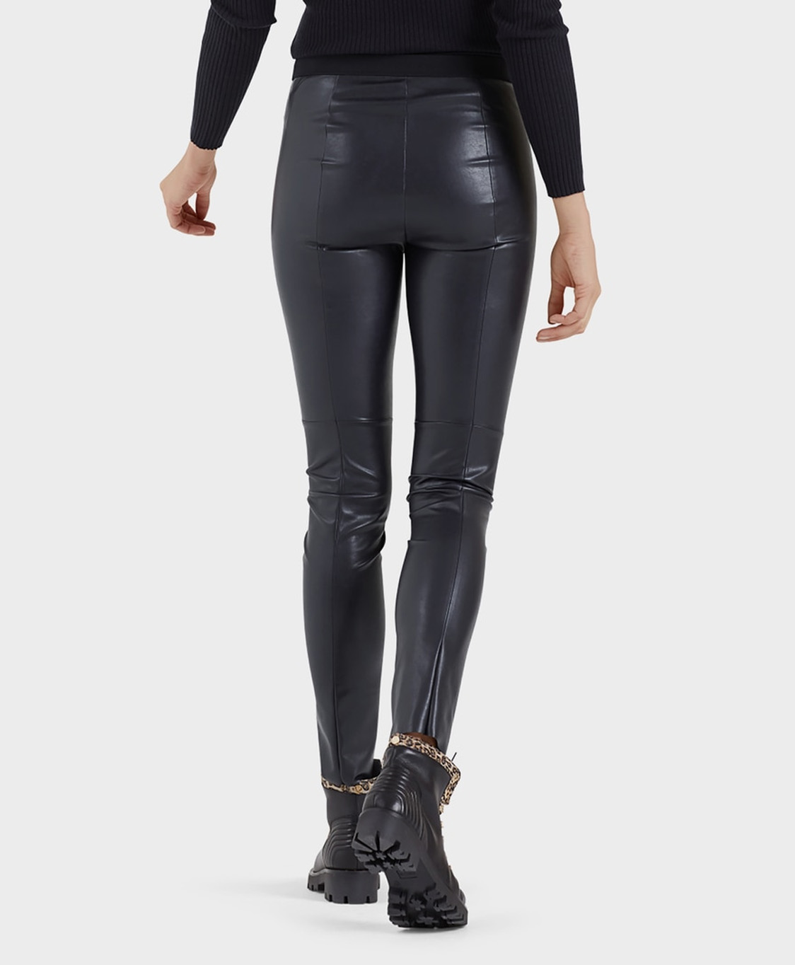 Legging van kunstleer in een nauw sluitende pasvorm, afgewerkt met afgezette naden, elastische stof en rubberen band. Materiaal: 100% polyamide, polyurethaanlaag. Het model is 179 cm lang en draagt maat N3/38.