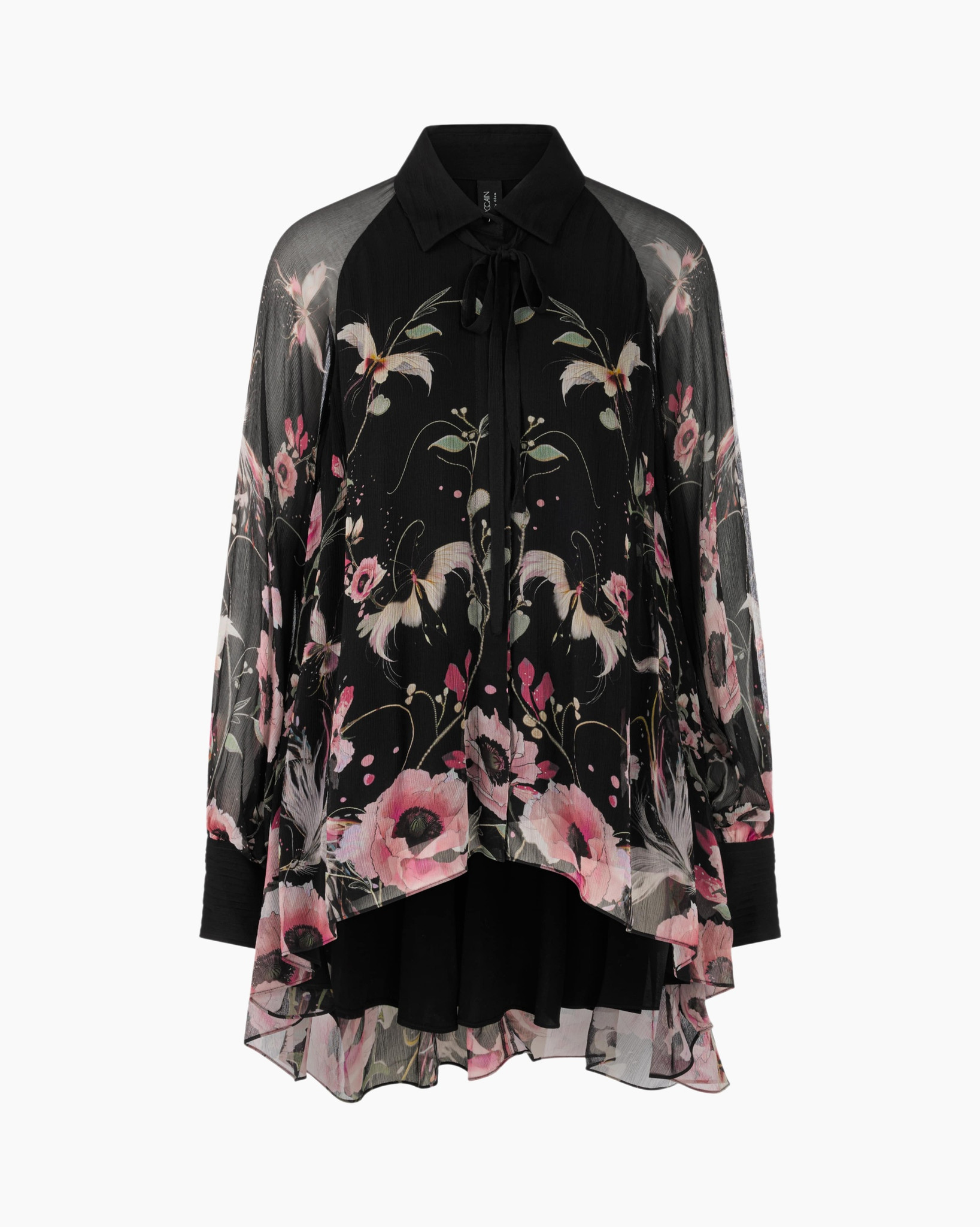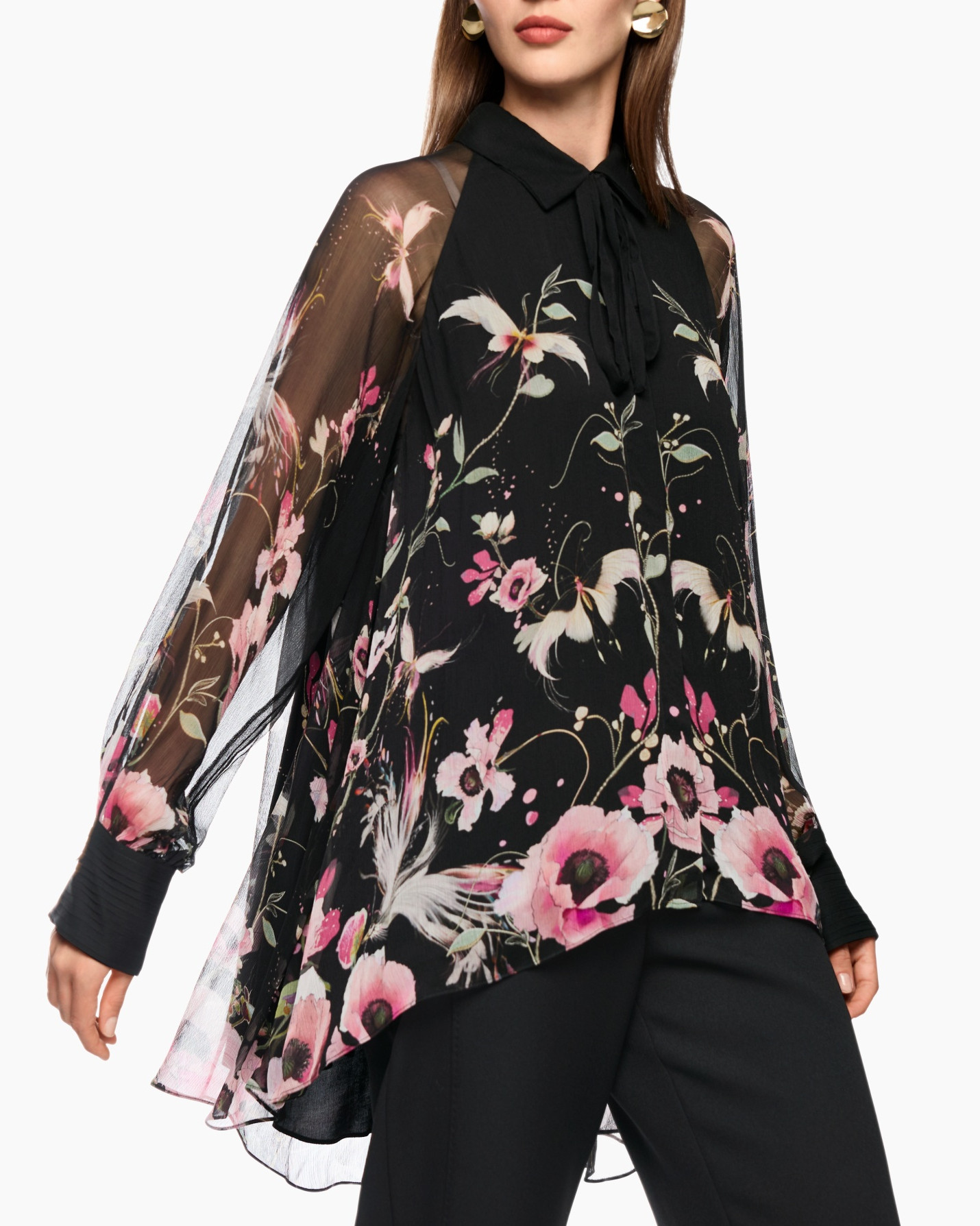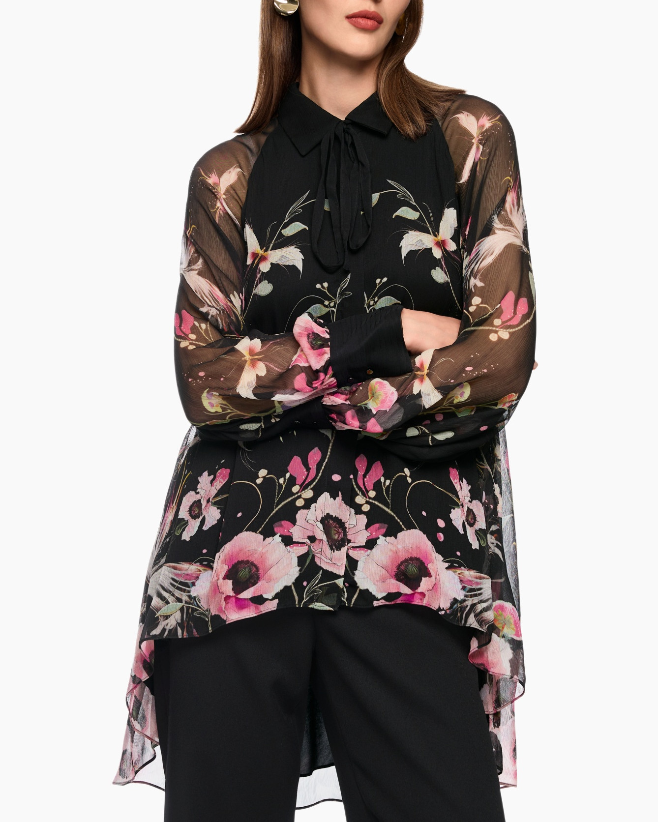 Deze blouse, de Zg 51.10 W14 Zwart van Marc Cain Glam, is een echte blikvanger in je garderobe. De lichte stof valt soepel en beweegt mooi mee. Je ziet een hoge-lage zoom, die aan de achterkant langer valt en speels oogt. De mouwen en het bovenste gedeelte van de rug zijn transparant, wat een luchtig effect geeft aan het geheel. De diepzwarte basis wordt verlevendigd door een levendige bloemenprint in verschillende roze en groene tinten. Deze print bedekt het voorpand en de onderkant van de mouwen. Een klassieke kraag, met een strikdetail bij de hals, geeft de blouse een verzorgde uitstraling. De lange mouwen eindigen in manchetten die je met knopen sluit.