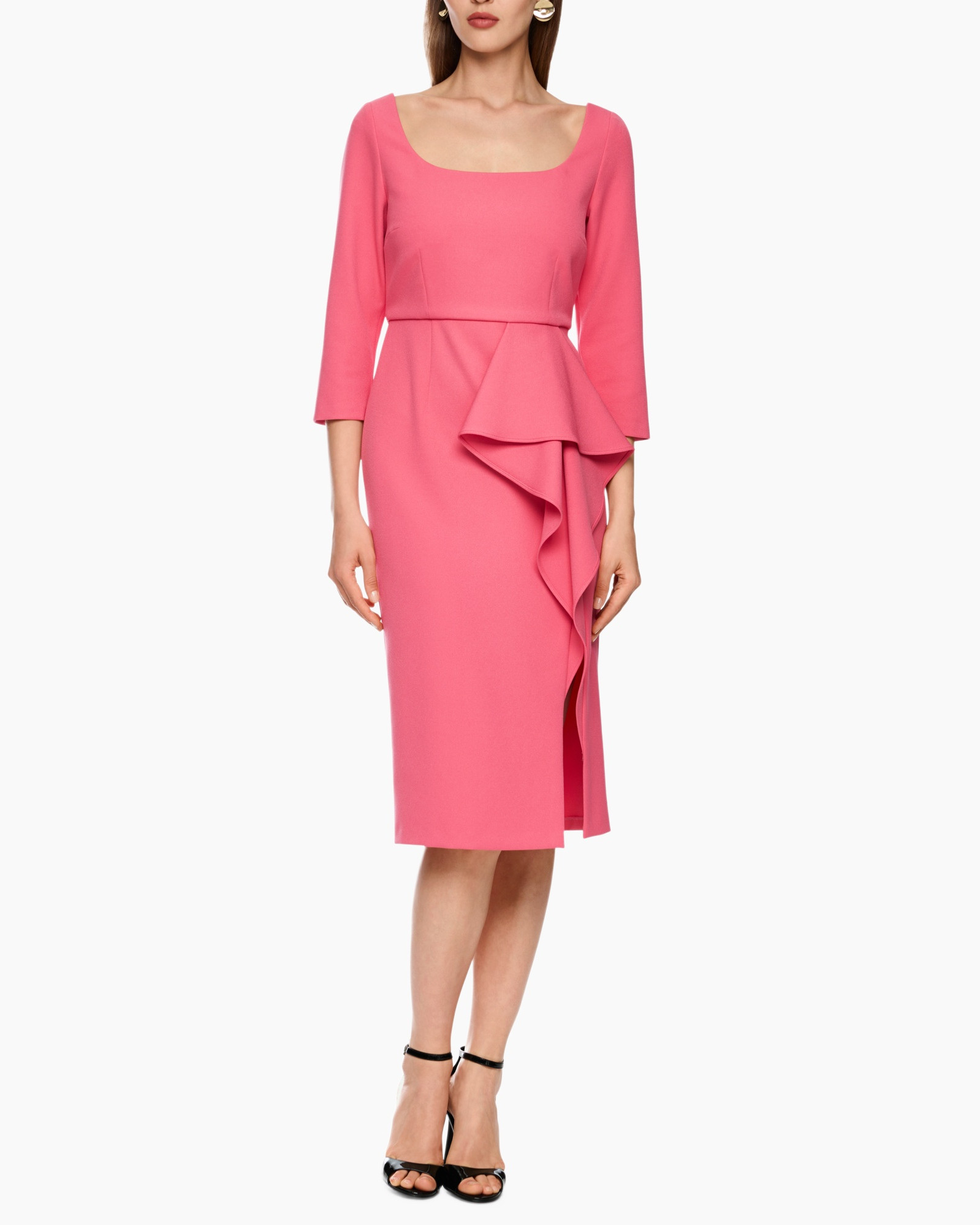 Draag deze jurk met zwarte hoge hakken en een simpele clutch om de focus op de kleur te houden.