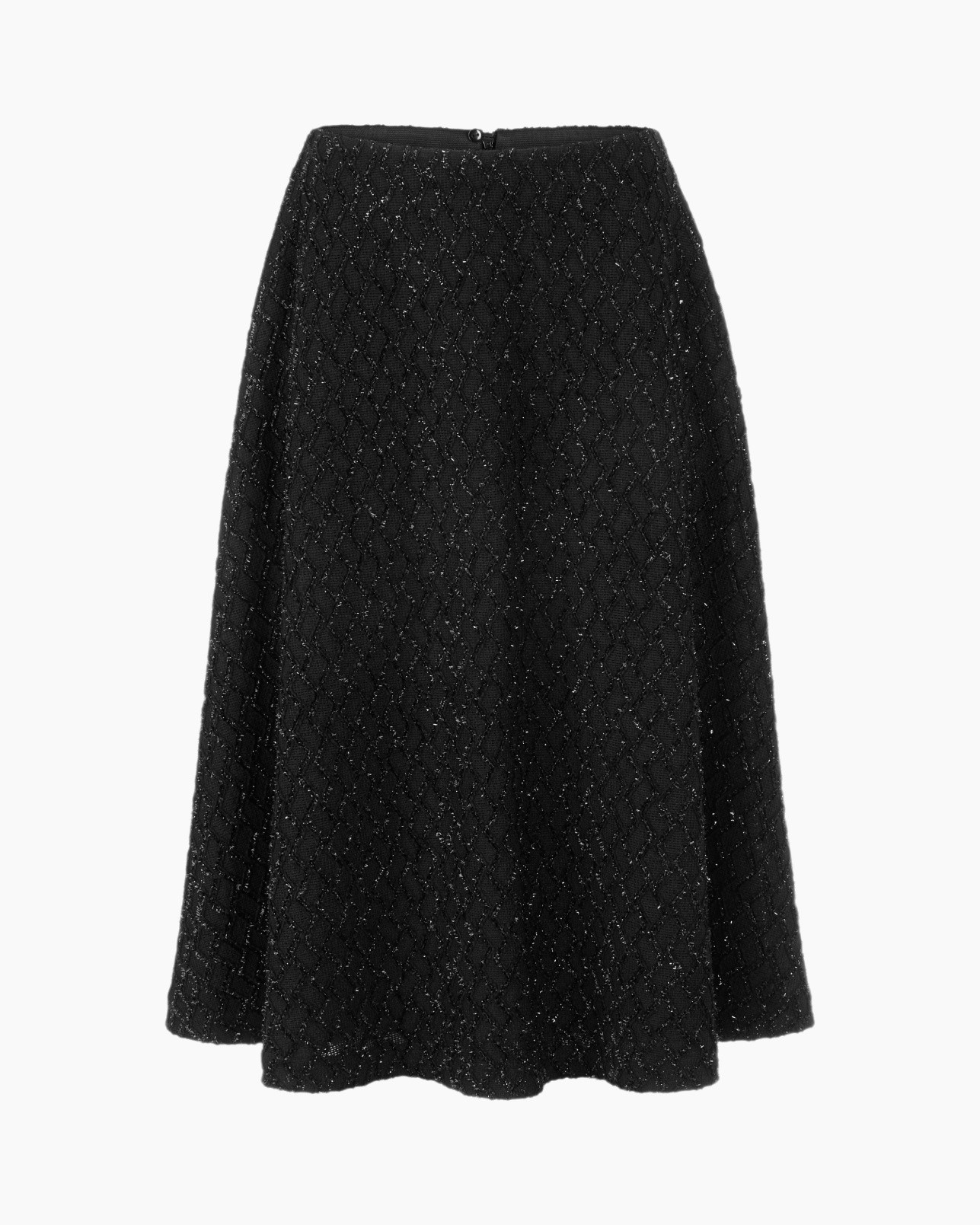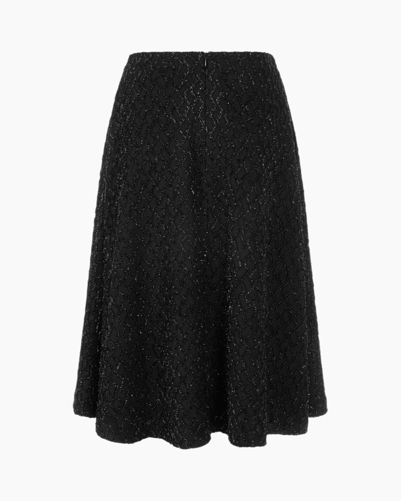 Voor een veelzijdige aanvulling op je garderobe is er de Rok Ag 71.03 W08 Zwart van Marc Cain Glam. Dit is een rok die direct de aandacht trekt door zijn diepzwarte kleur, verrijkt met een subtiele zilverkleurige glans die elk licht vangt. De pasvorm zit prettig, met een aangesloten taille die mooi over de heupen valt en daarna subtiel uitloopt in een lichte A-lijn. De lengte reikt tot halverwege de kuit, wat een verfijnde uitstraling geeft. Je ziet een fijn geweven patroon dat een ruitstructuur vormt, wat de rok een unieke textuur geeft. Hierdoor is de rok een item dat je voor diverse gelegenheden in kunt zetten.