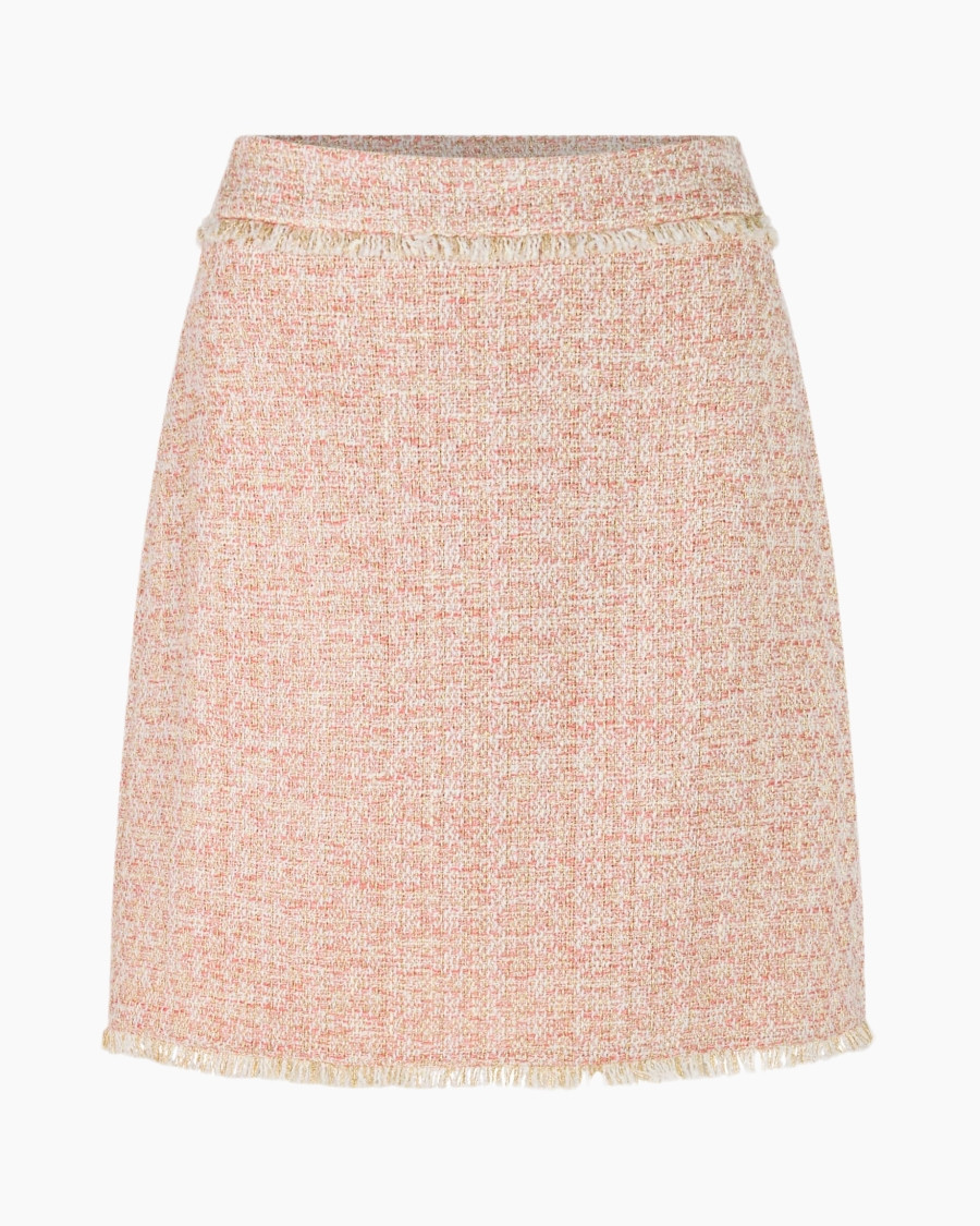 Rok Zg 71.03 W03 Beige van Marc Cain Glam is een verfijnde rok die je collectie aanvult. Deze recht gesneden mini-rok valt netjes boven de knie. Je ziet een mix van beige, roze en off-white draden die samenkomen in een karakteristieke weefstructuur. Deze tweed-achtige stof geeft de rok een bijzondere uitstraling. De pasvorm is gestroomlijnd en sluit goed aan zonder te knellen, waardoor je vrij beweegt. Een opvallend detail is de gerafelde rand aan de onderzijde, die een speels accent toevoegt aan de klassieke lijn. De rok heeft een gladde, ononderbroken tailleband, wat bijdraagt aan de strakke afwerking. Dit item draag je gemakkelijk naar kantoor of tijdens een speciale gelegenheid. De stof voelt prettig aan en behoudt zijn vorm.