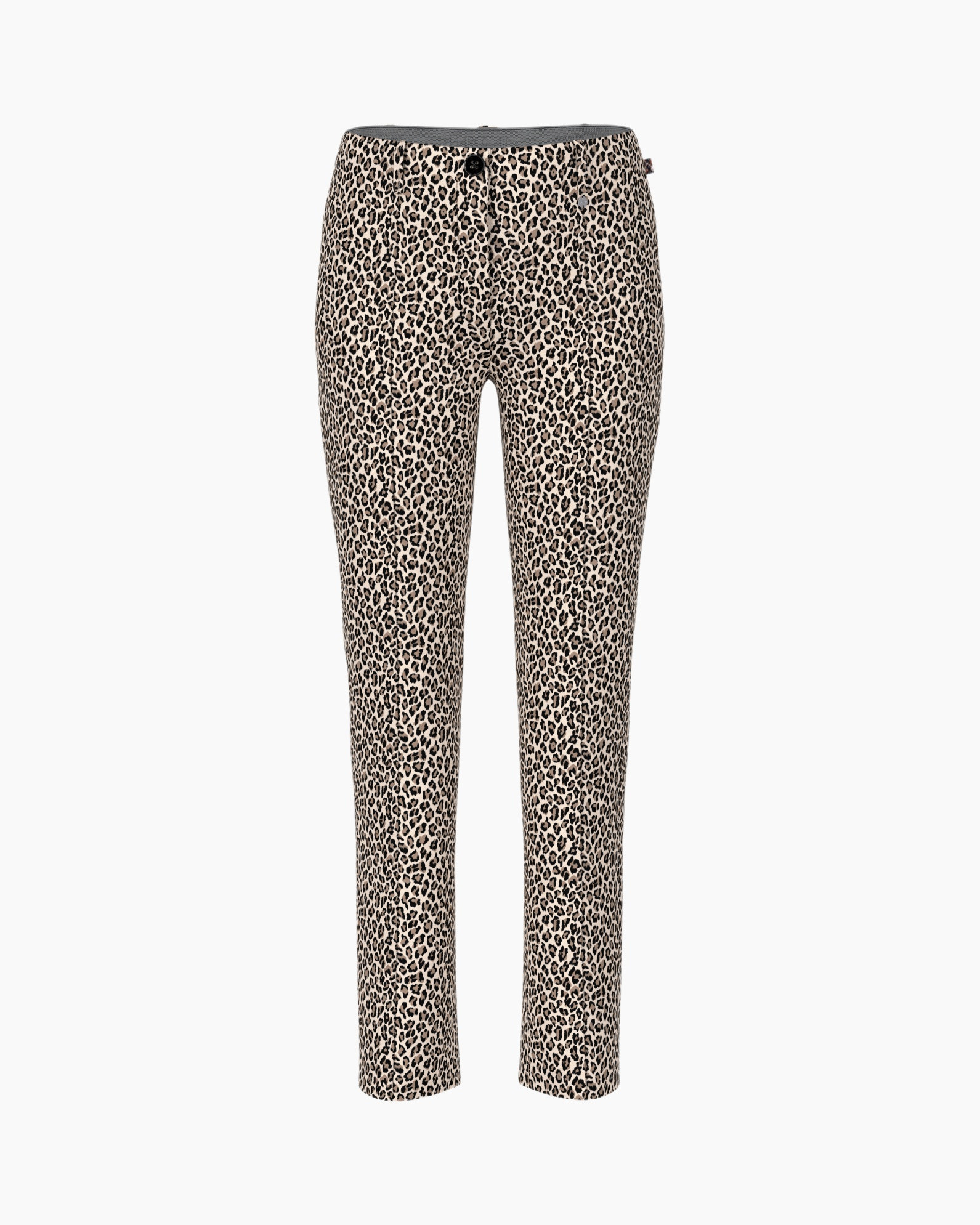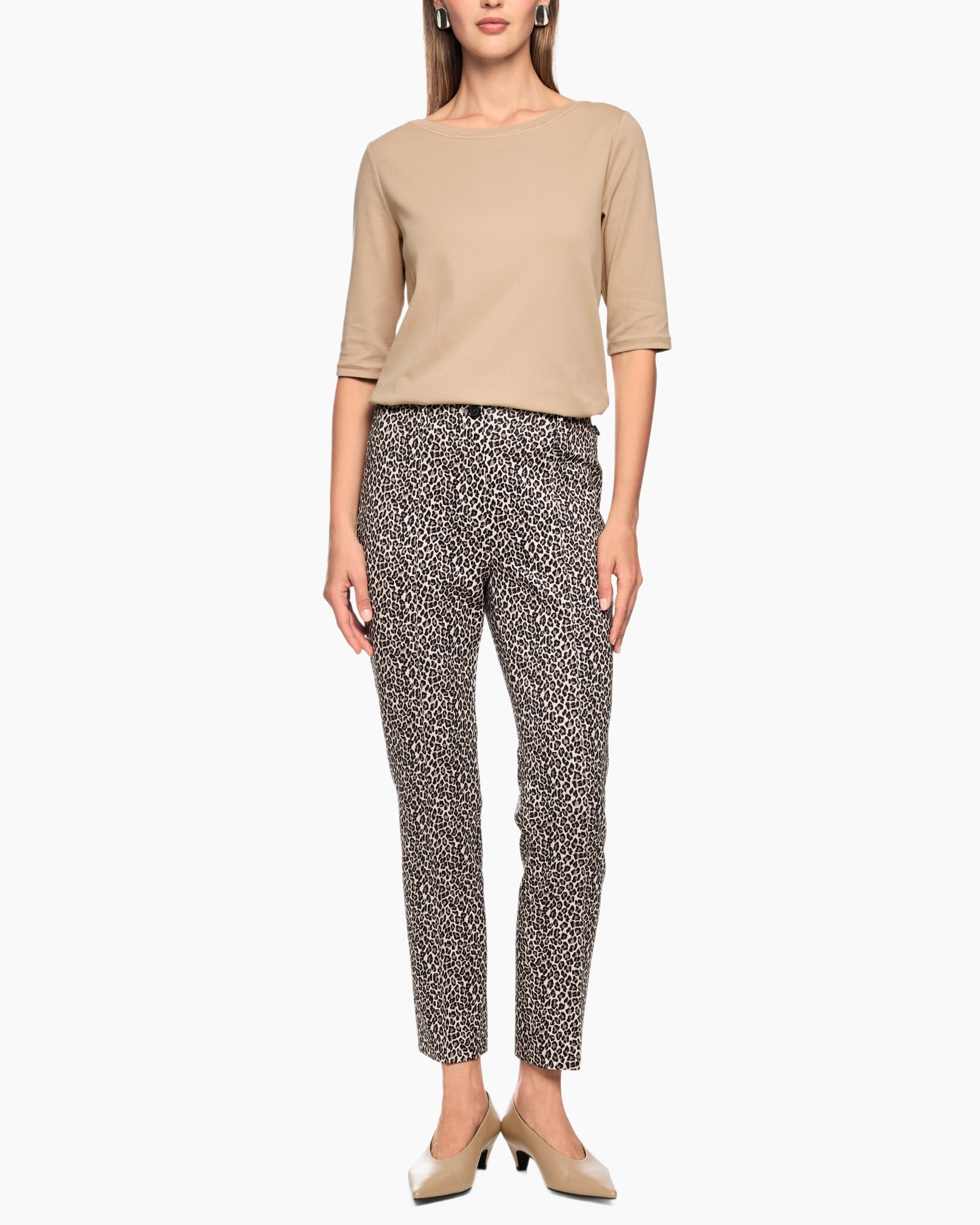 De Broek Ap 81.11 J01 Ecru van Marc Cain Pants is de perfecte basis voor een krachtige look. Deze broek, een sterke toevoeging aan je garderobe, biedt jou een verfijnde pasvorm. Het model sluit goed aan op de heupen en heeft een rechte pijp die net boven de enkel valt. Die lengte creëert een vlotte uitstraling. De volle luipaardprint, uitgevoerd in rijke schakeringen van zwart, warmbruin en ecru, geeft direct karakter aan iedere outfit. Je ziet dat het ontwerp zuiver en strak is gehouden. De tailleband is glad afgewerkt, waardoor de broek ideaal is om tops in de tailleband te dragen. Het is een comfortabel item om de hele dag te dragen, zonder in te leveren op uitstraling. Door het slimme ontwerp zonder zichtbare sluitingen of opgestikte zakken ligt alle focus op de expressieve print. Je creëert hiermee direct een gelaagde look die opvalt.