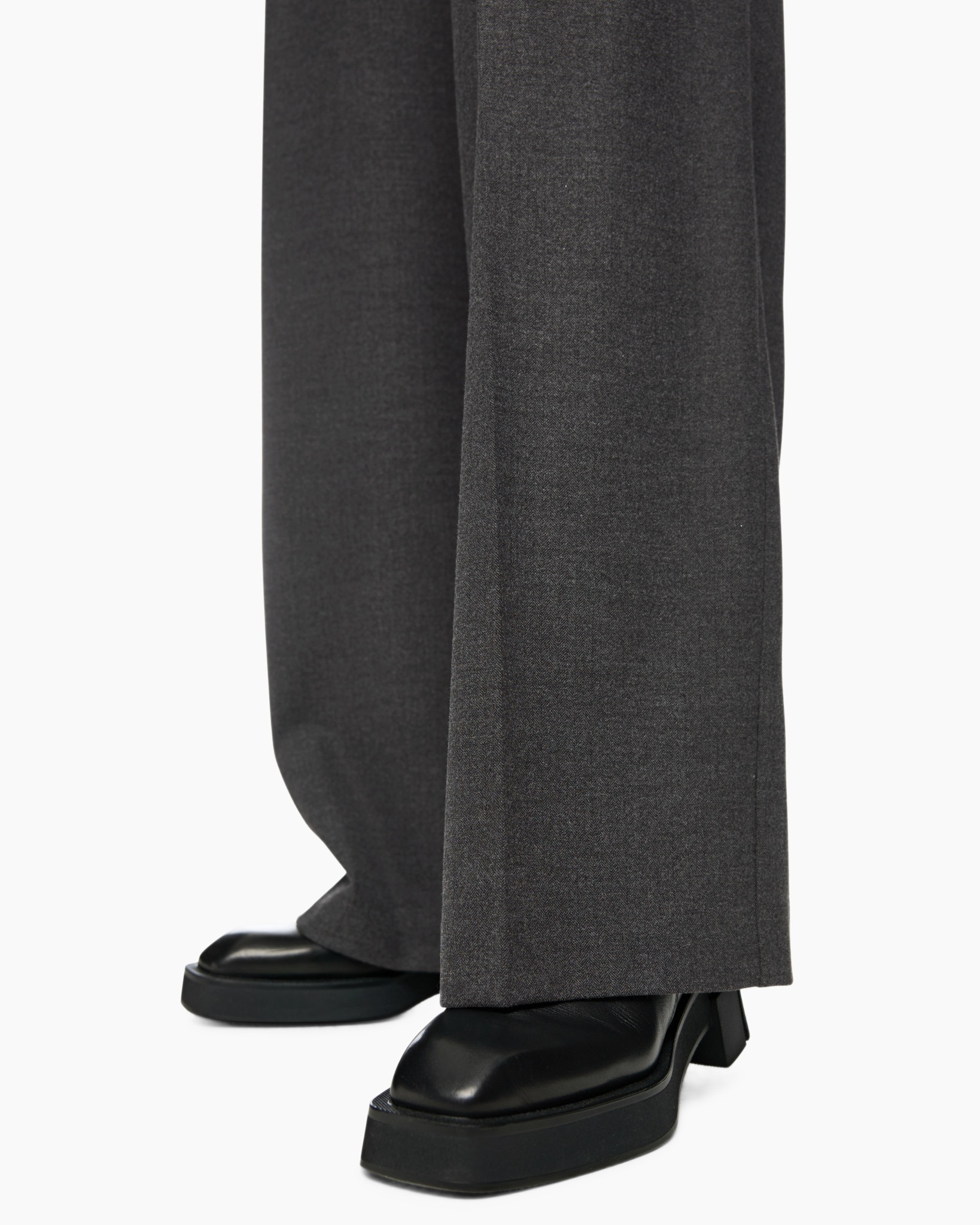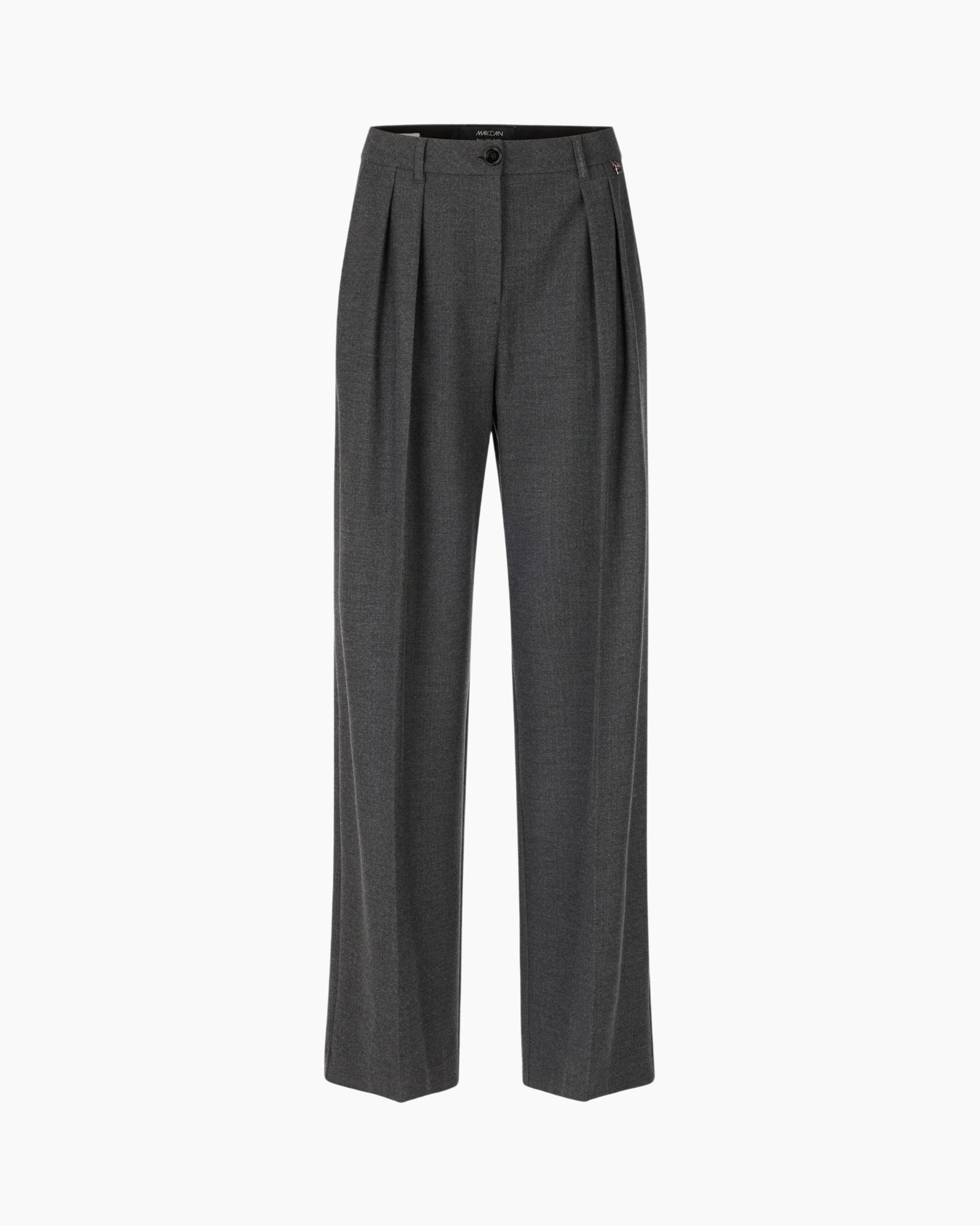 Maak kennis met de Broek Zp 81.19 W78 Donker Grijs van Marc Cain Pants, een pantalon die je basis slim aanvult. Je ziet een diep donkergrijze broek met een ruime pasvorm die je veel draagcomfort en bewegingsvrijheid biedt. De hoge taillelijn zorgt voor een gestroomlijnd silhouet, waarbij de wijde pijpen recht en soepel naar beneden vallen. Aan de voorkant heeft de broek opvallende plooien die je direct een verzorgde look geven, gecombineerd met een sluiting met een enkele knoop. Een duidelijke persvouw loopt zowel voor als achter over de gehele lengte van de pijp. Dit geeft de broek een nette uitstraling, geschikt voor diverse momenten. De achterzijde kenmerkt zich door een gladde afwerking, zonder extra zakken of onnodige details. De stof heeft een subtiele textuur die de donkergrijze kleur een levendige diepte geeft.