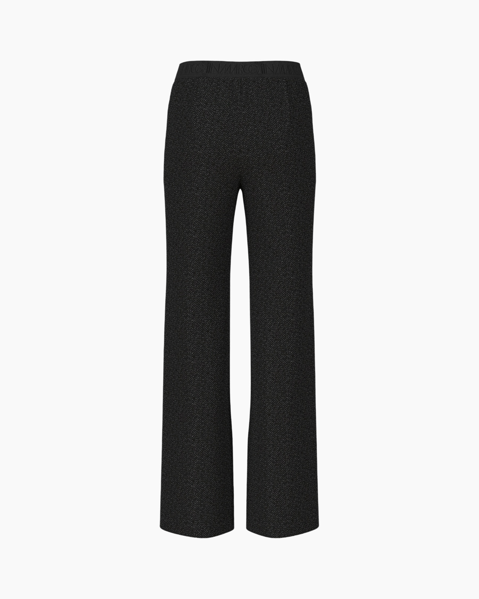 Je ziet hier de Broek Zp 81.42 J18 Zwart van Marc Cain Pants. Deze broek kenmerkt zich door een wijde pijp die recht naar beneden valt. De soepele pasvorm geeft je alle ruimte om te bewegen en draagt de hele dag comfortabel. De stof heeft een diepzwarte basis, waarin een fijne, zilverkleurige draad is geweven. Dit geeft het textiel een subtiele glinstering die beweegt met het licht. De broek heeft een brede, elastische tailleband die nauwkeurig aansluit op je middel, zonder te knellen. Aan de voorkant zie je geen zichtbare knopen of rits, wat bijdraagt aan de naadloze look van deze broek. Een klein metalen detail siert de zijkant van de tailleband. Het materiaal voelt prettig aan op de huid en behoudt zijn vorm. Dit maakt het een veelzijdig kledingstuk voor diverse gelegenheden.