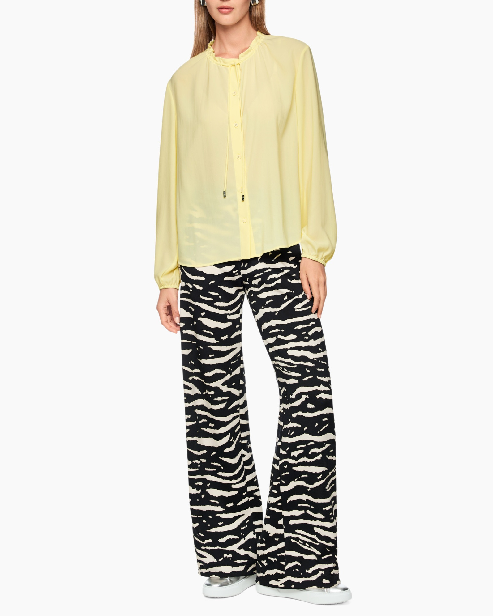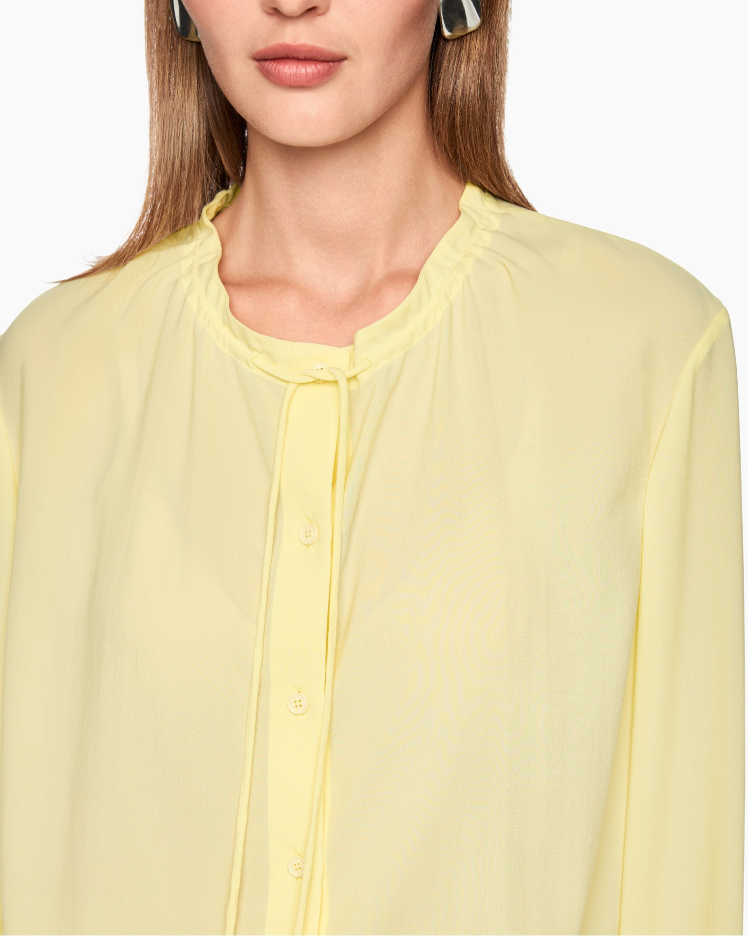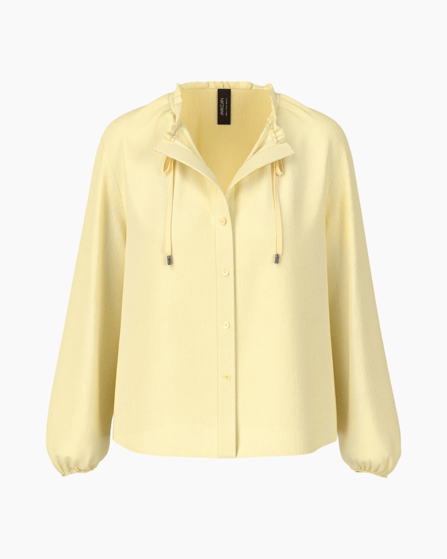 Je zoekt een kledingstuk dat frisheid brengt in je garderobe, en deze Blouse As 51.05 W70 licht geel van Marc Cain Sports is precies wat je zoekt. Deze blouse heeft een soepele, rechte pasvorm die heerlijk luchtig rond het lichaam valt. De zachte, licht gele tint geeft je outfit direct een heldere uitstraling. Je ziet een fijn geweven stof met lange mouwen die eindigen met een elastische manchet. Een opvallend kenmerk is de verzamelde opstaande kraag. De blouse sluit aan de voorkant met knopen. Boven de knoopsluiting vind je smalle koorden met metalen eindstukjes. Dit detail geeft de blouse een speelse uitstraling.