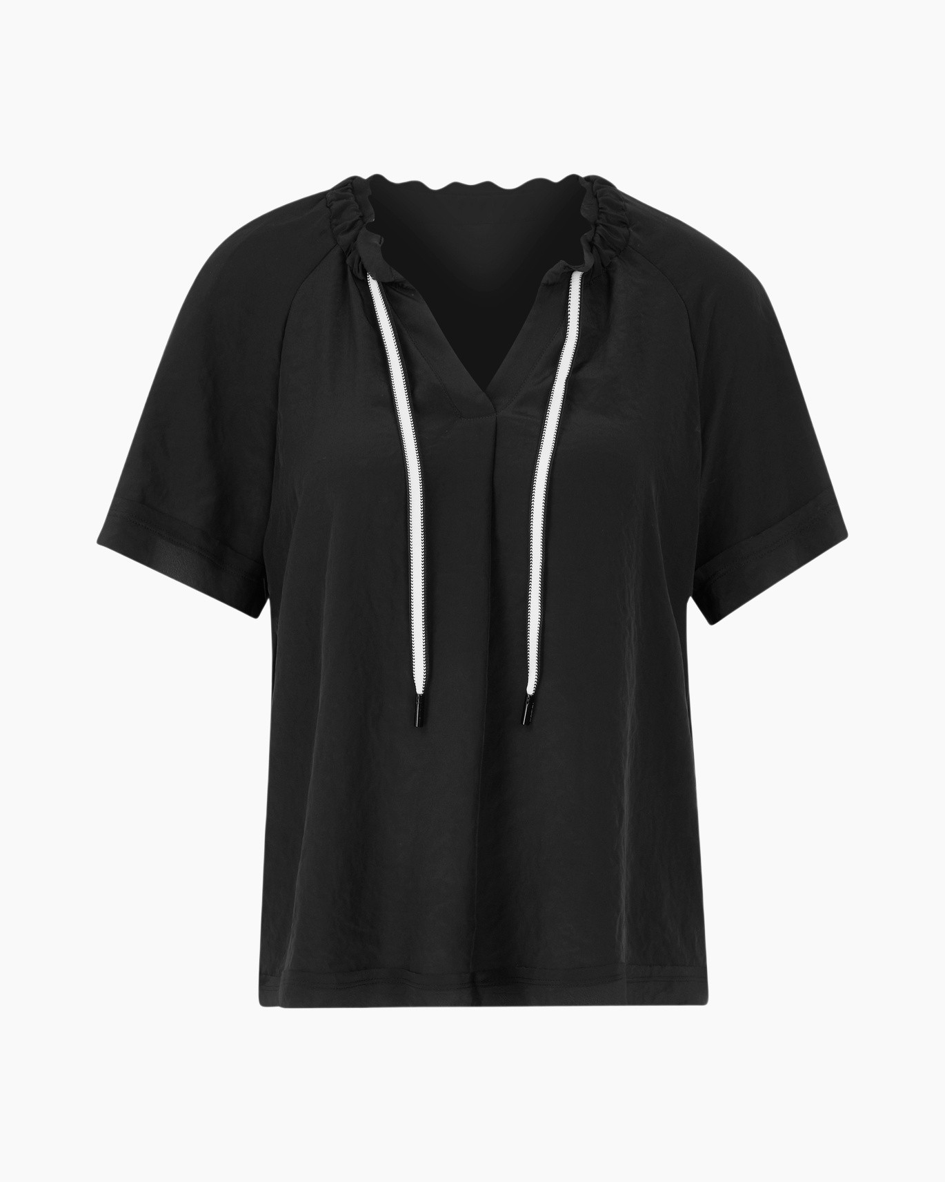 De blouse is vervaardigd uit een zacht, ademend materiaal dat comfort biedt gedurende de hele dag. De pasvorm is losjes met een elegante v-hals die voorzien is van een subtiele trekkoordsluiting. Geen knopen of zware details, maar een eenvoudig zwart ontwerp dat straalt in zijn eenvoud. Een klein logo detail siert de halslijn zonder te overheersen.