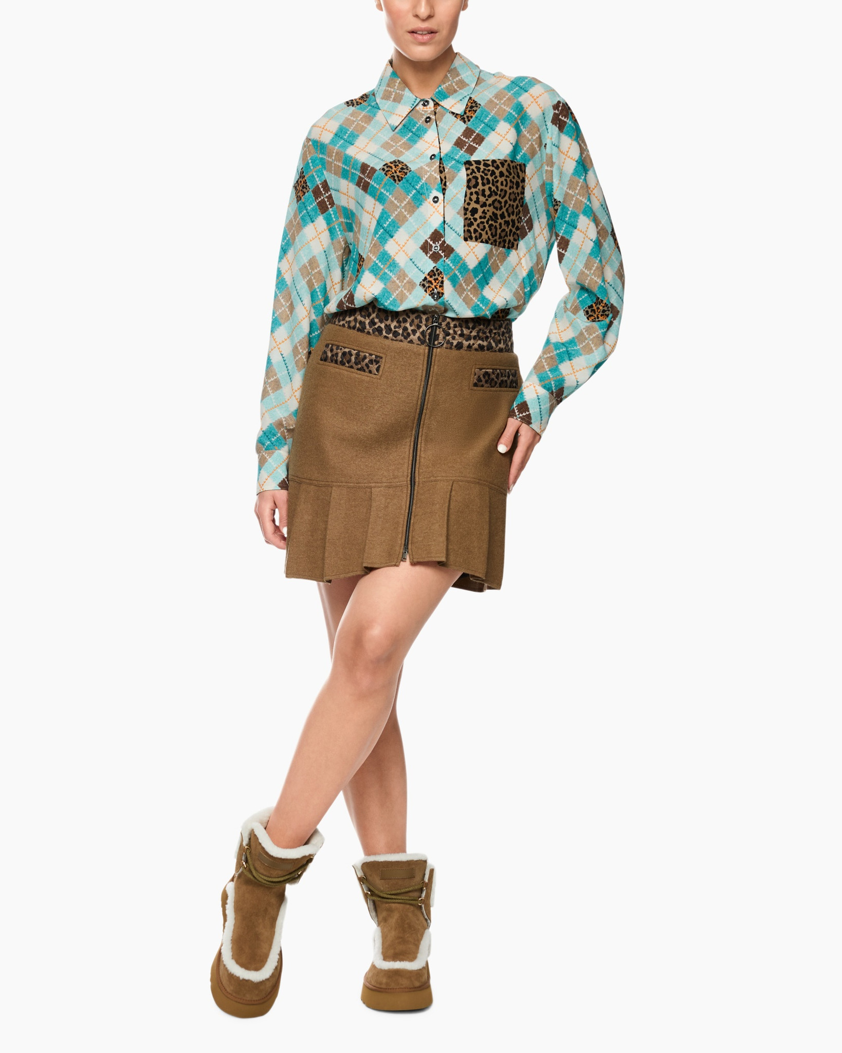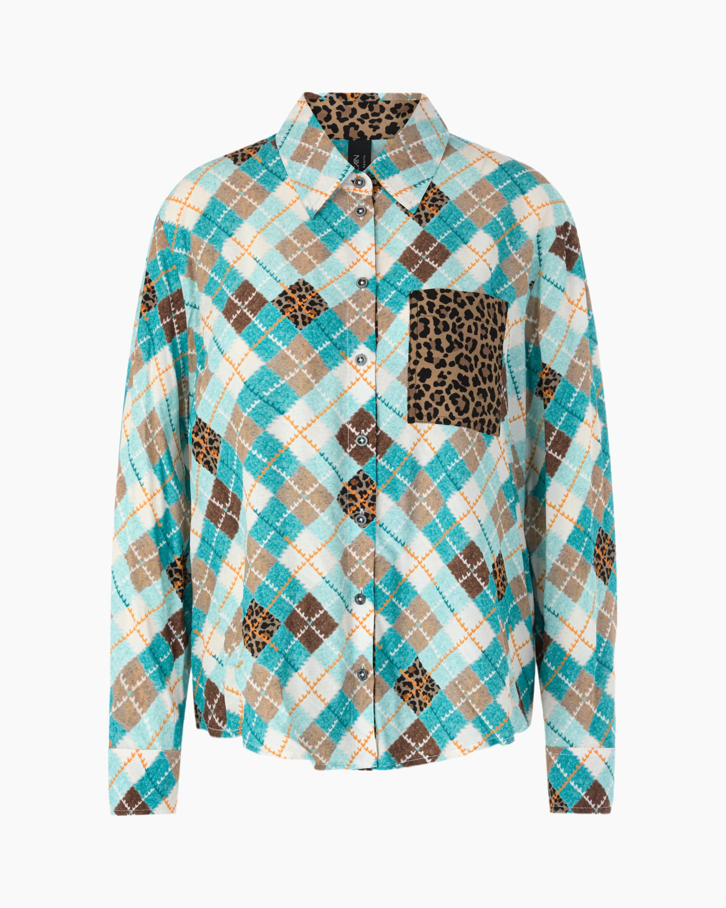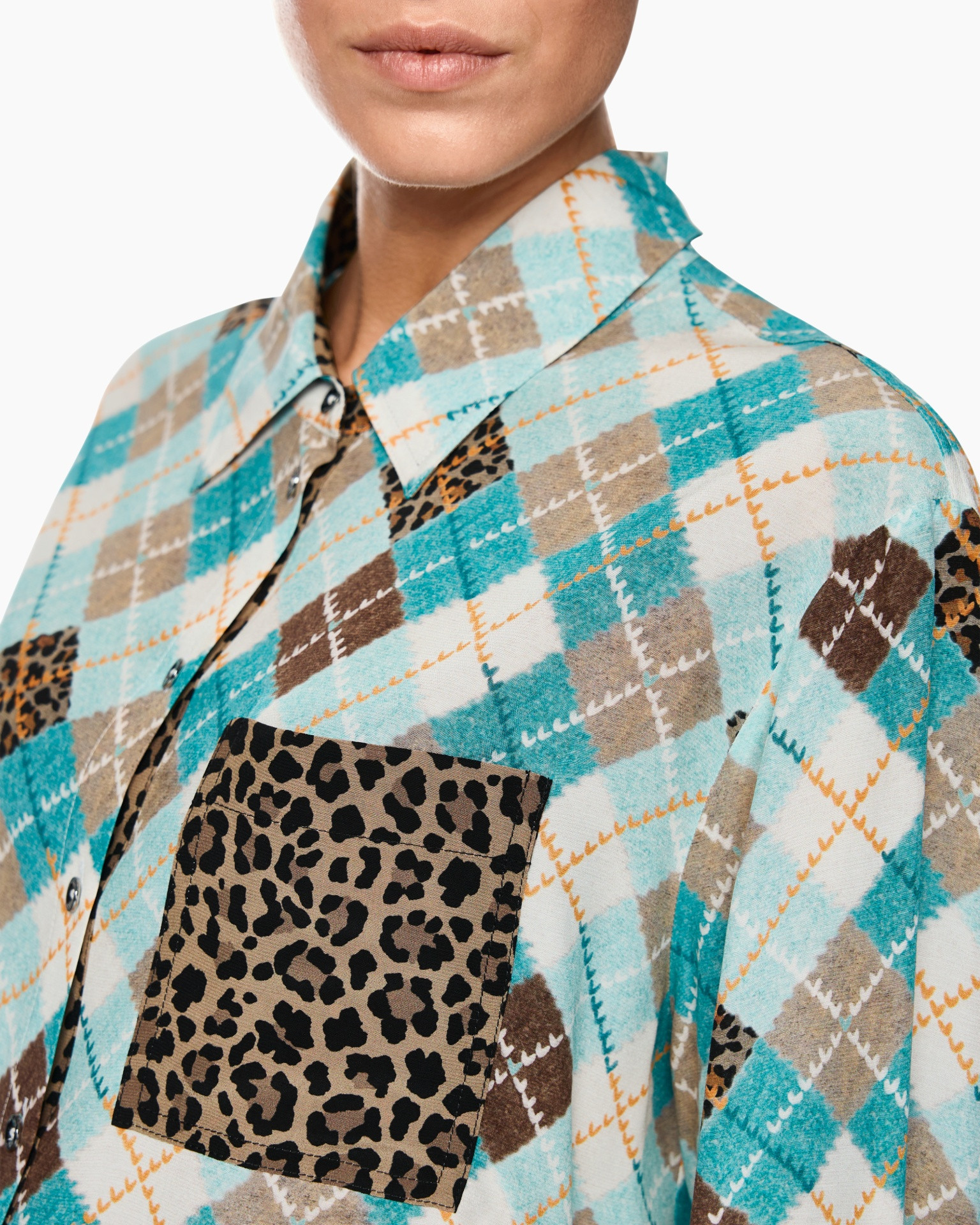 Je garderobe krijgt een levendige draai met de Blouse Zs 51.21 W35 Groen van Marc Cain Sports. Deze blouse valt direct op met zijn onderscheidende design. De pasvorm is comfortabel en licht vallend, ideaal voor een soepele look. Je ziet een speels argylepatroon in helder turkoois, warm bruin en zacht crème, verrijkt met subtiele dierenprint details. Een opvallende borstzak op de linkerzijde is geheel verfraaid met deze dierenprint, wat een verrassend contrast geeft. De blouse heeft een klassieke kraag en sluit met donkere knopen aan de voorzijde, die doorlopen tot aan de manchetten op de lange mouwen. Dit item staat garant voor een persoonlijke touch in je dagelijkse outfit.