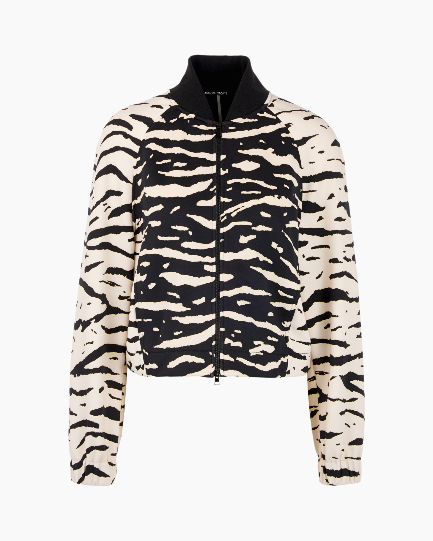 Jack As 31.04 J03 Zwart van Marc Cain Sports is dat jack waar jij direct in wegloopt. Dit korte jack heeft een helder zwart-wit patroon, wat zorgt voor een krachtige uitstraling. De pasvorm is losjes en comfortabel om te dragen. De opvallende zwarte rits benadrukt het midden van het kledingstuk. Je ziet de raglan mouwen die zorgen voor een soepele lijn over je schouders. De kraag is uitgevoerd in een diep zwart en staat stevig omhoog. Berg je spullen veilig op in de twee steekzakken aan de voorzijde. De zoom en manchetten sluiten goed aan en houden de vorm vast. Dit jack geeft direct karakter aan je look.