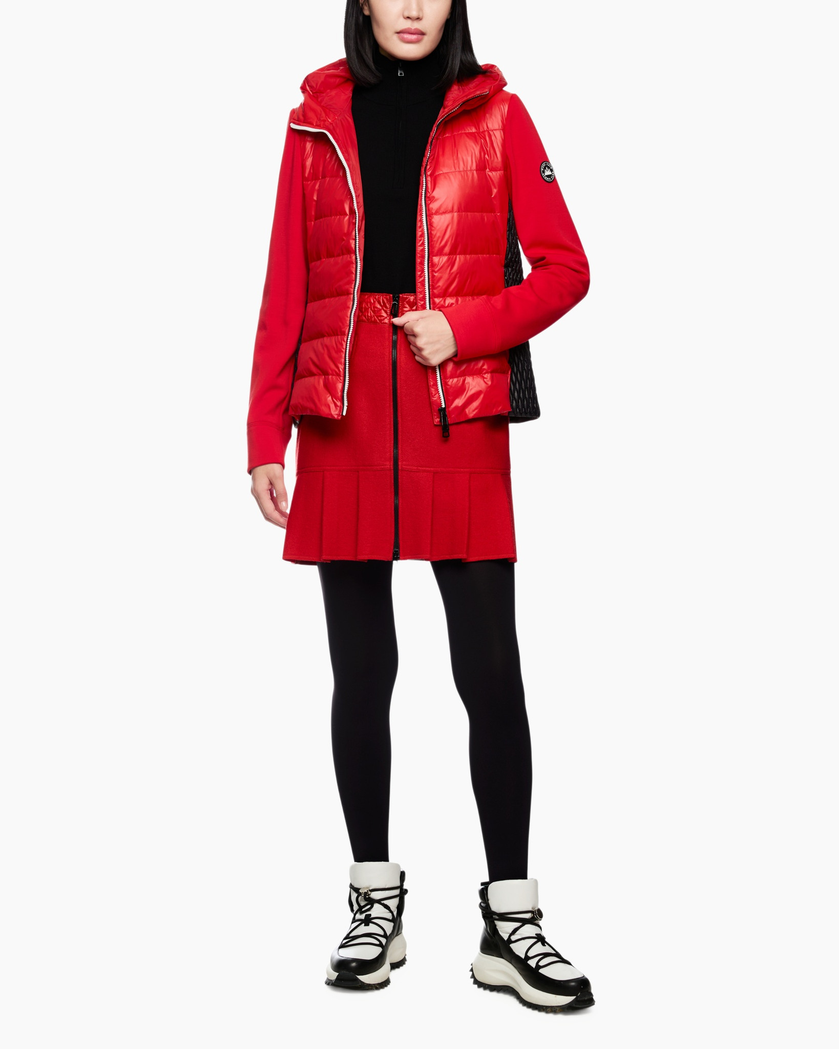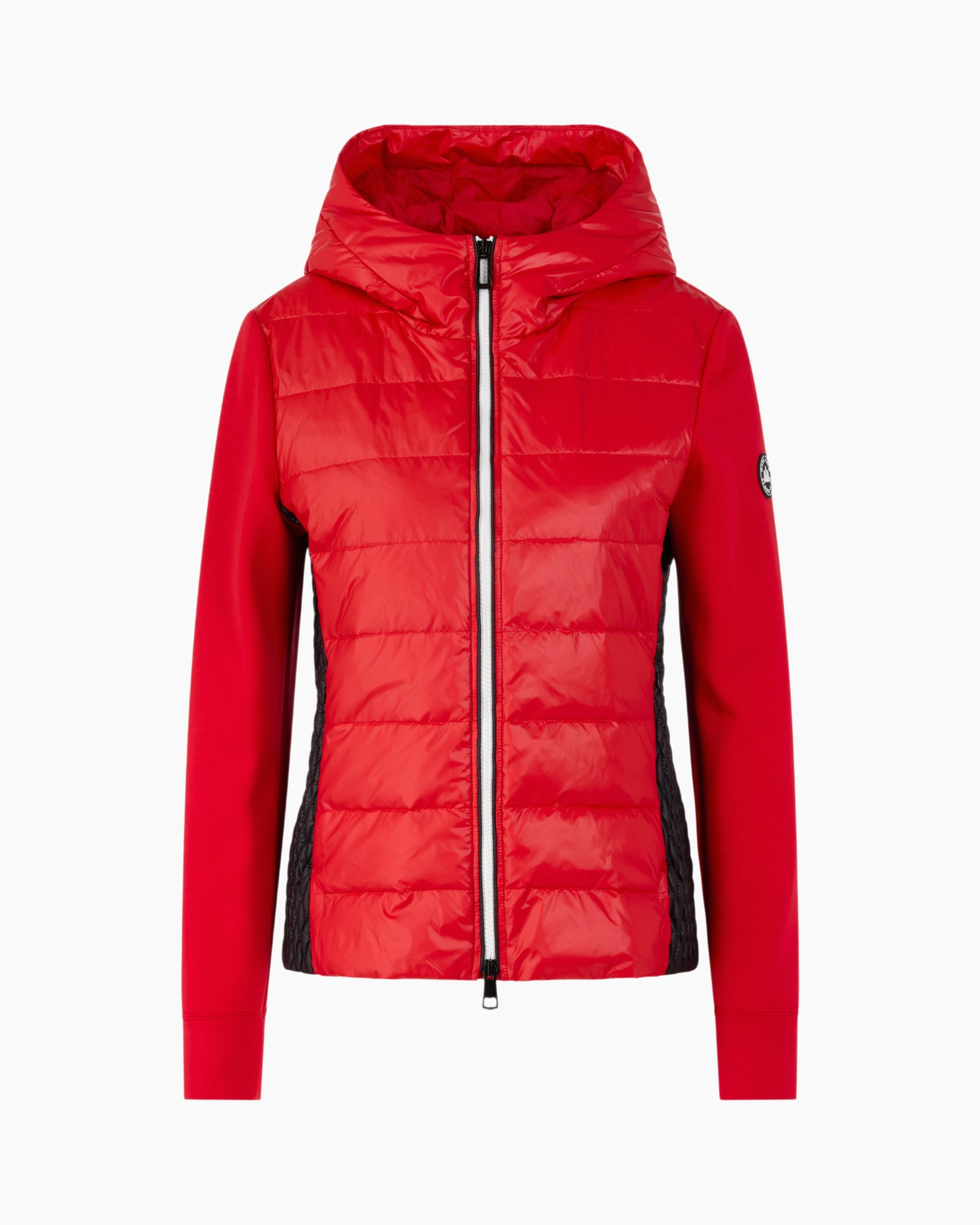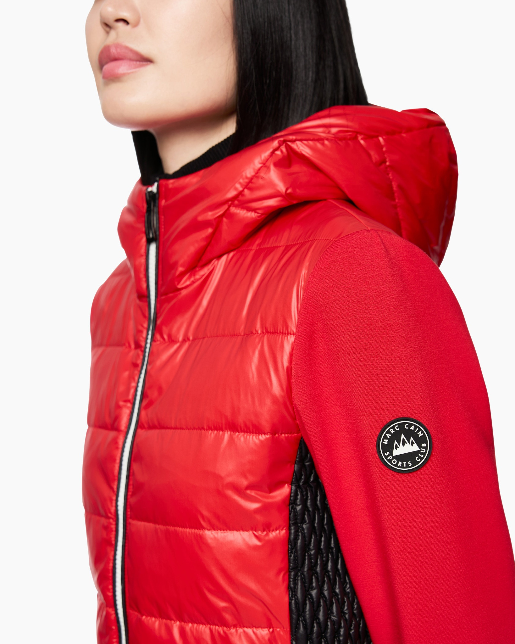 Jack Zs 31.11 W42 Rood van Marc Cain Sports is een opvallend jack dat je direct een verzorgde uitstraling geeft. Je ziet hier een getailleerd model in een heldere rode kleur. De voorkant, achterkant en capuchon zijn uitgevoerd in een glanzend, gewatteerd materiaal, terwijl de mouwen en zijpanden een zachte, gebreide stof laten zien. Dit zorgt voor een fijne pasvorm die je lichaam mooi volgt. Dit jack heeft een praktische capuchon en een opvallende zwarte tweewegritssluiting met een witte bies die een contrast vormt. De zwarte zijpanden met ruitstiksel voegen een interessant detail toe. De comfortabele mouwen eindigen in ribgebreide boorden, wat het jack compleet maakt.