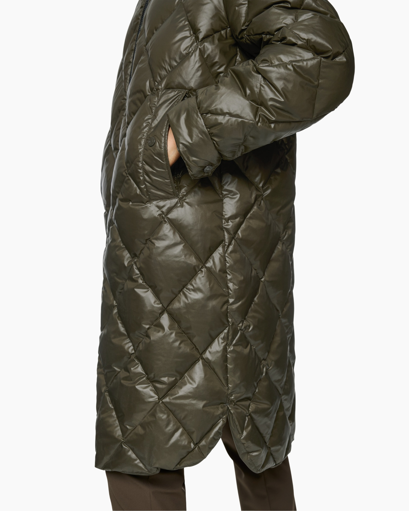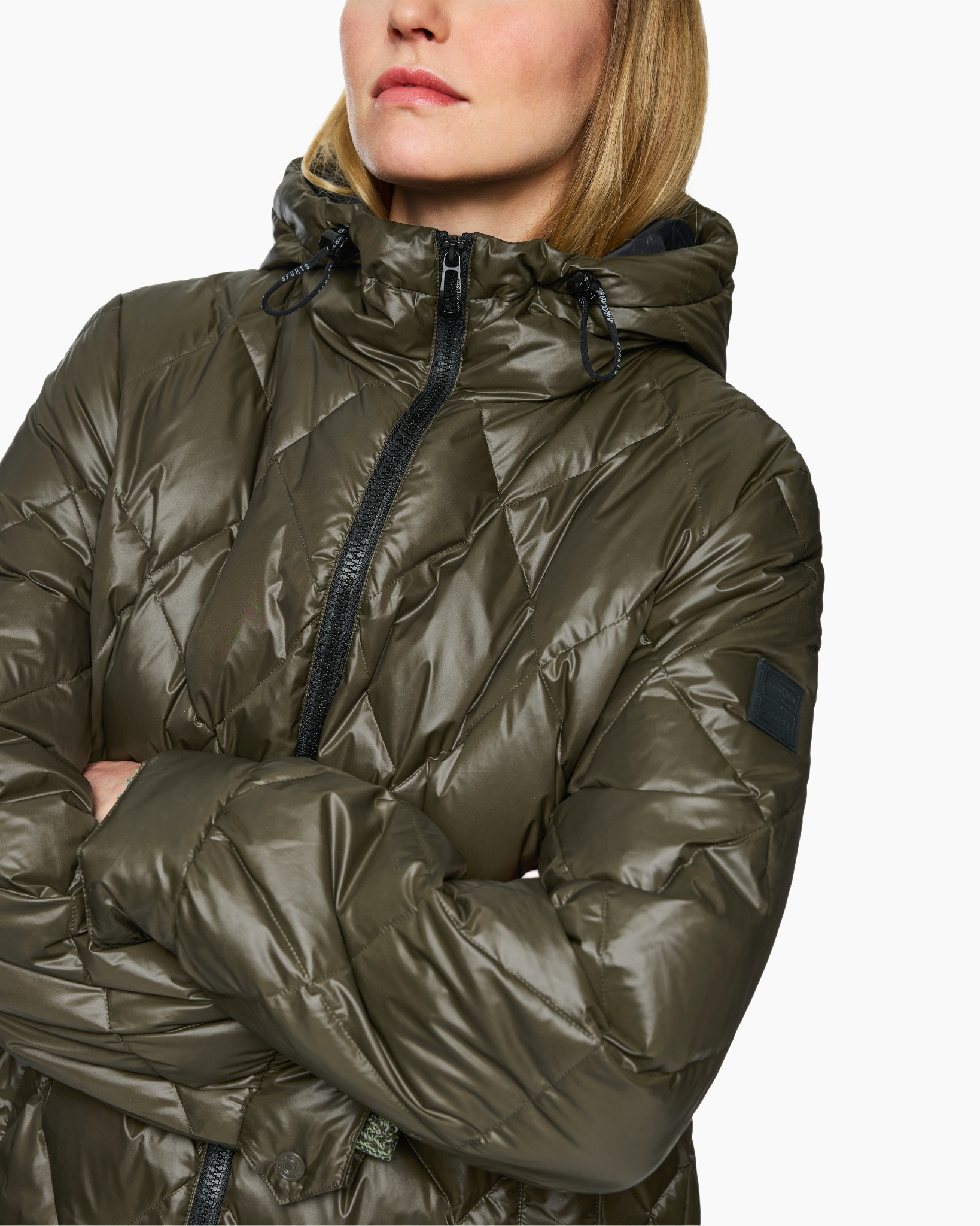 Kenmerkend is de doorgestikte textuur, gecombineerd met een praktische ritssluiting. De jas heeft een handige capuchon en diepe zakken. Het subtiele Marc Cain logo op de mouw voegt een stijlvol detail toe.