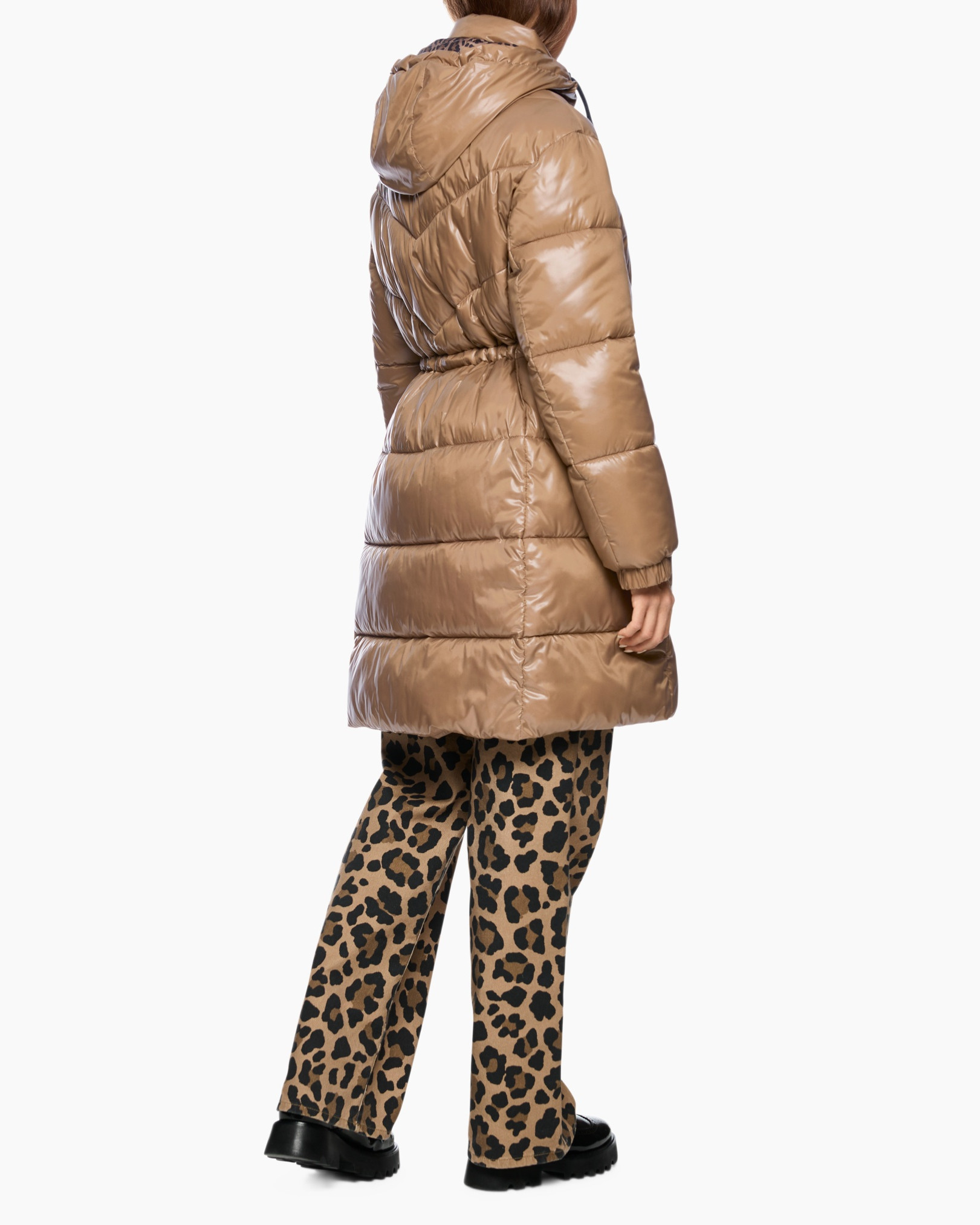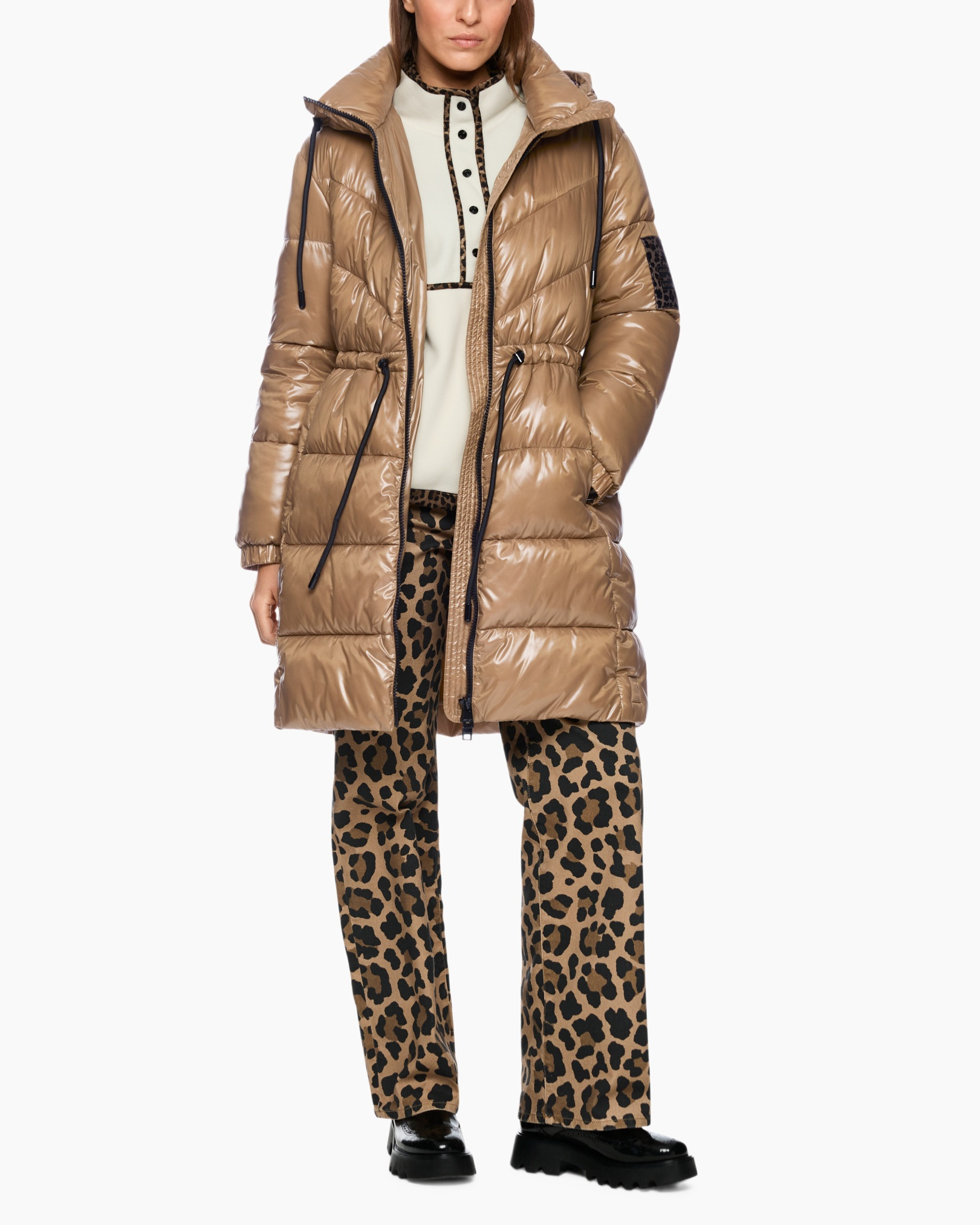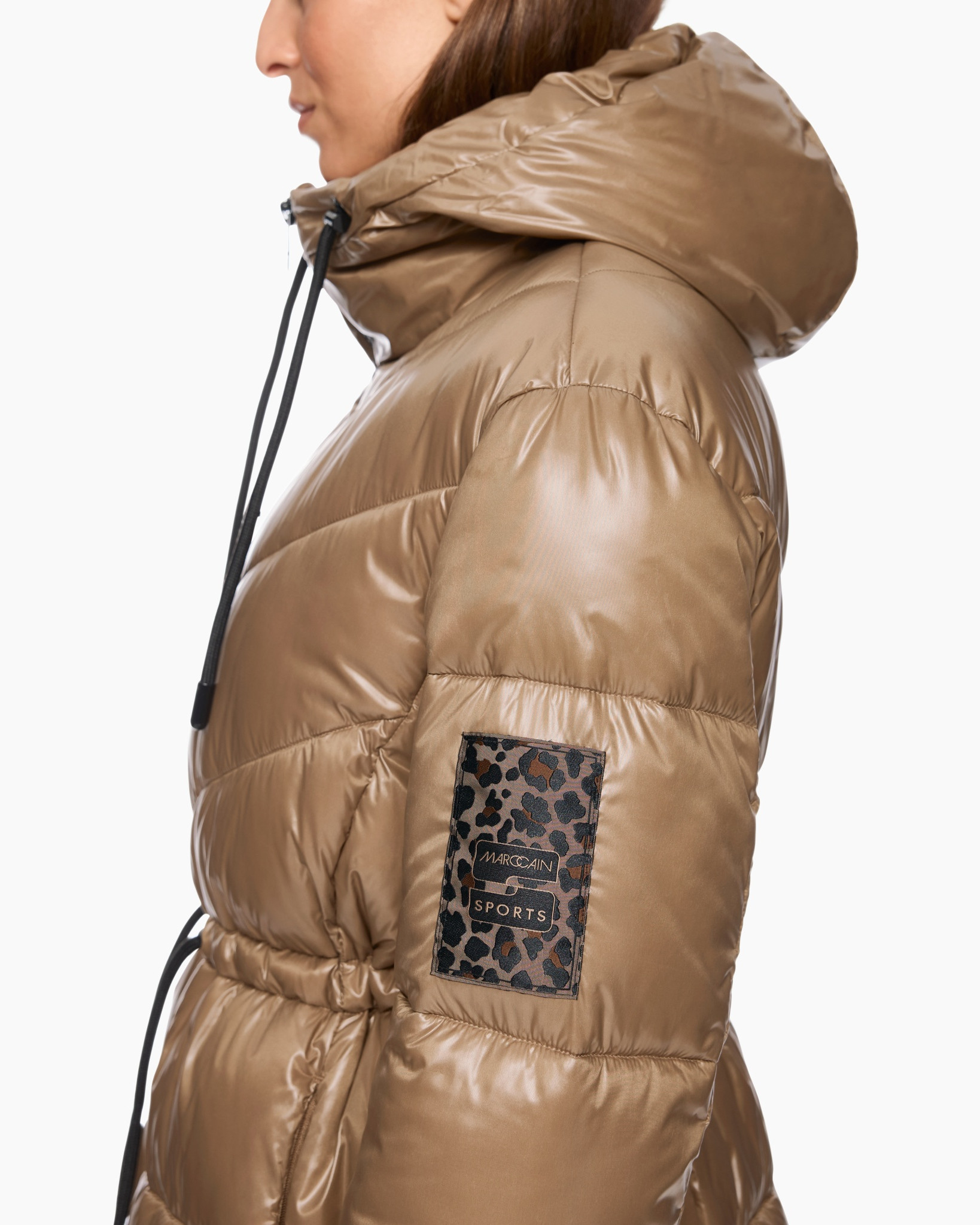 De jas Zs 11.06 W39 Bruin dessin van Marc Cain Sports is jouw ideale metgezel voor koudere dagen. Deze lange pufferjas geeft je comfort en een opvallende look. De jas heeft een ruime pasvorm, die je naar wens verstelt met het trekkoord in de taille. Zo creëer je eenvoudig een getailleerd silhouet. De glanzende, warme bruintint zorgt voor een rijke uitstraling. Je sluit de jas met een zwarte rits die doorloopt tot in de hoge kraag. De capuchon beschermt je tegen weer en wind, met een opvallende panterprint aan de binnenzijde. Handige steekzakken met ritssluiting bieden ruimte voor je essentials, terwijl de elastische mouwboorden de warmte goed vasthouden. Ook vind je een subtiele patch met panterprint op de mouw.