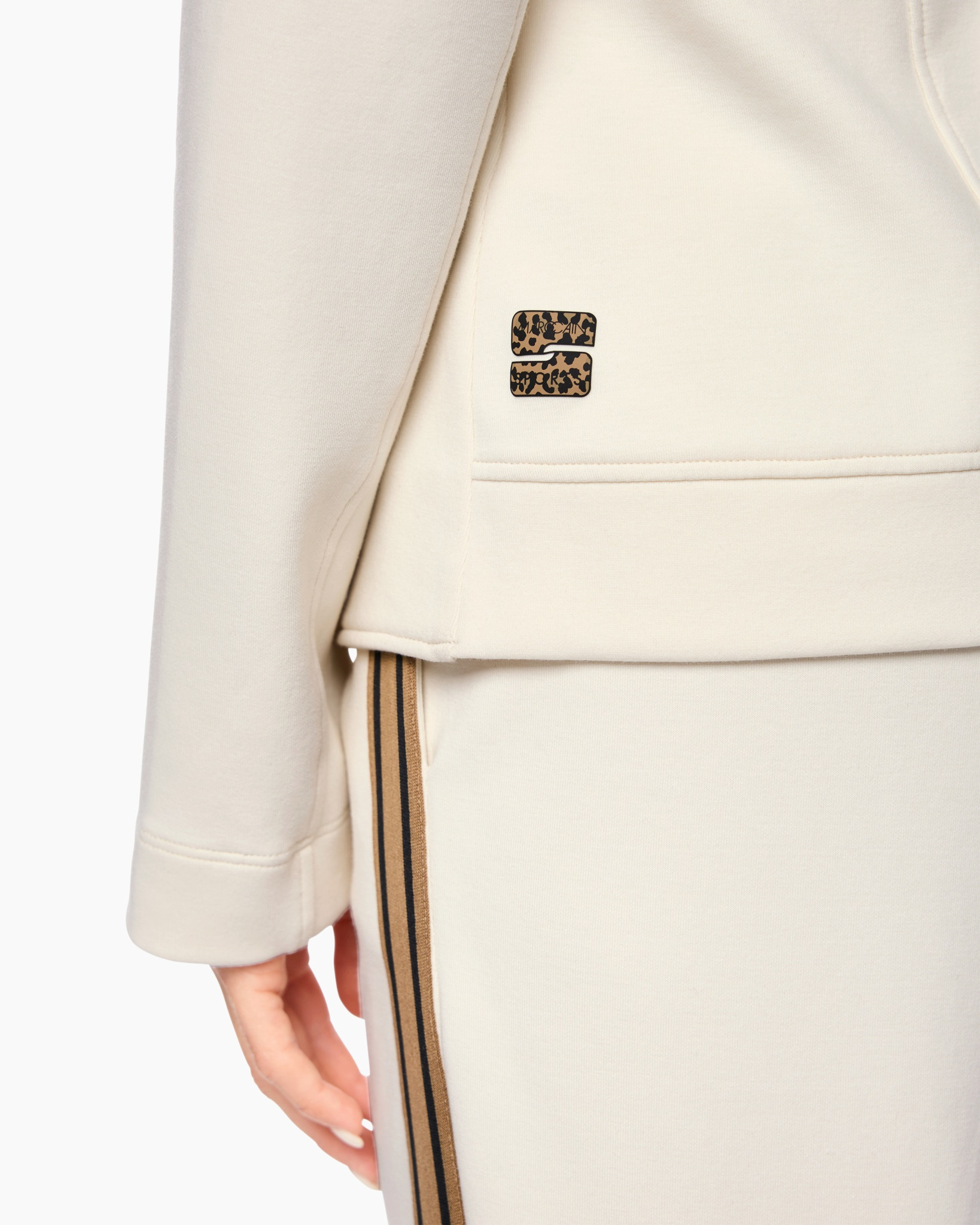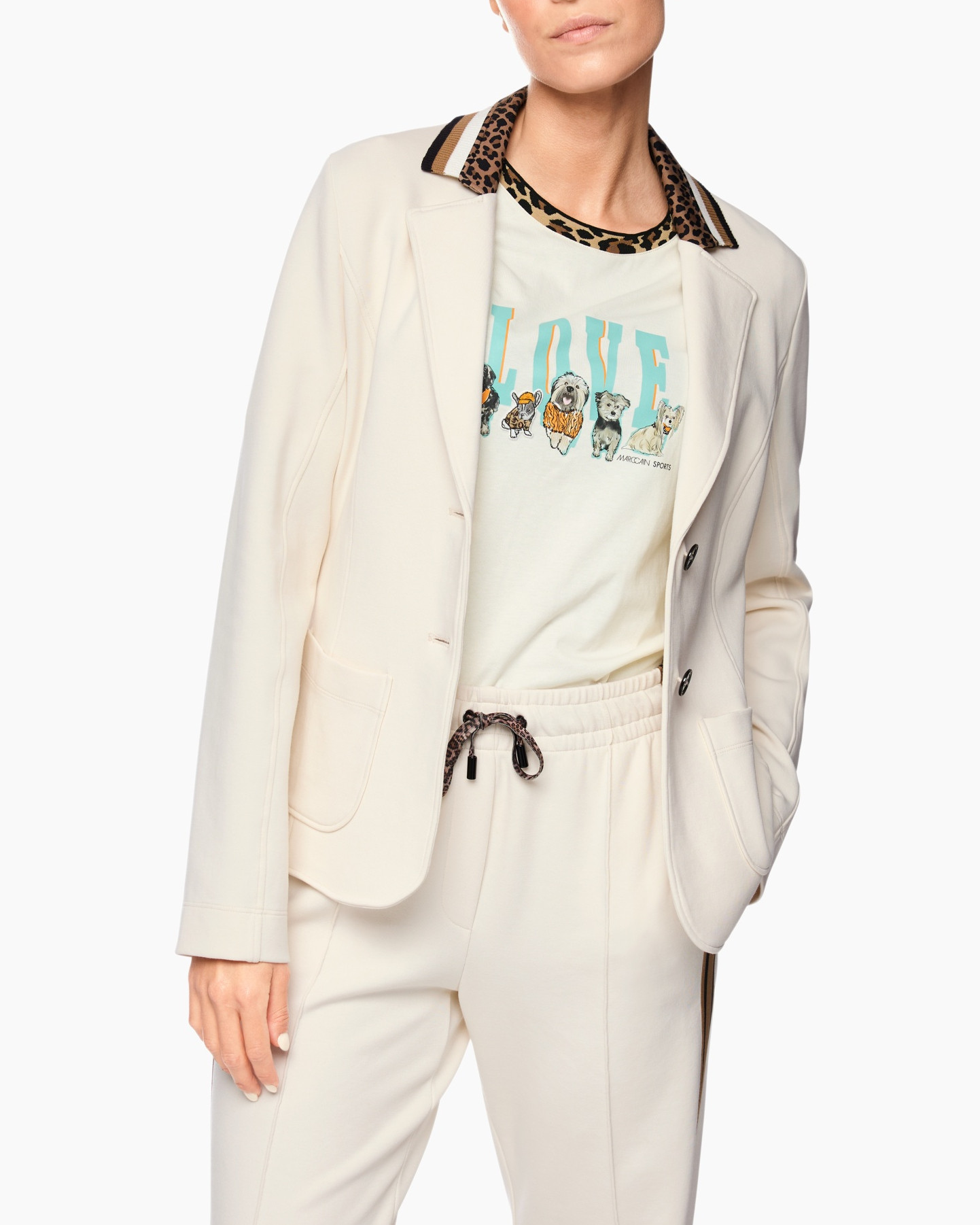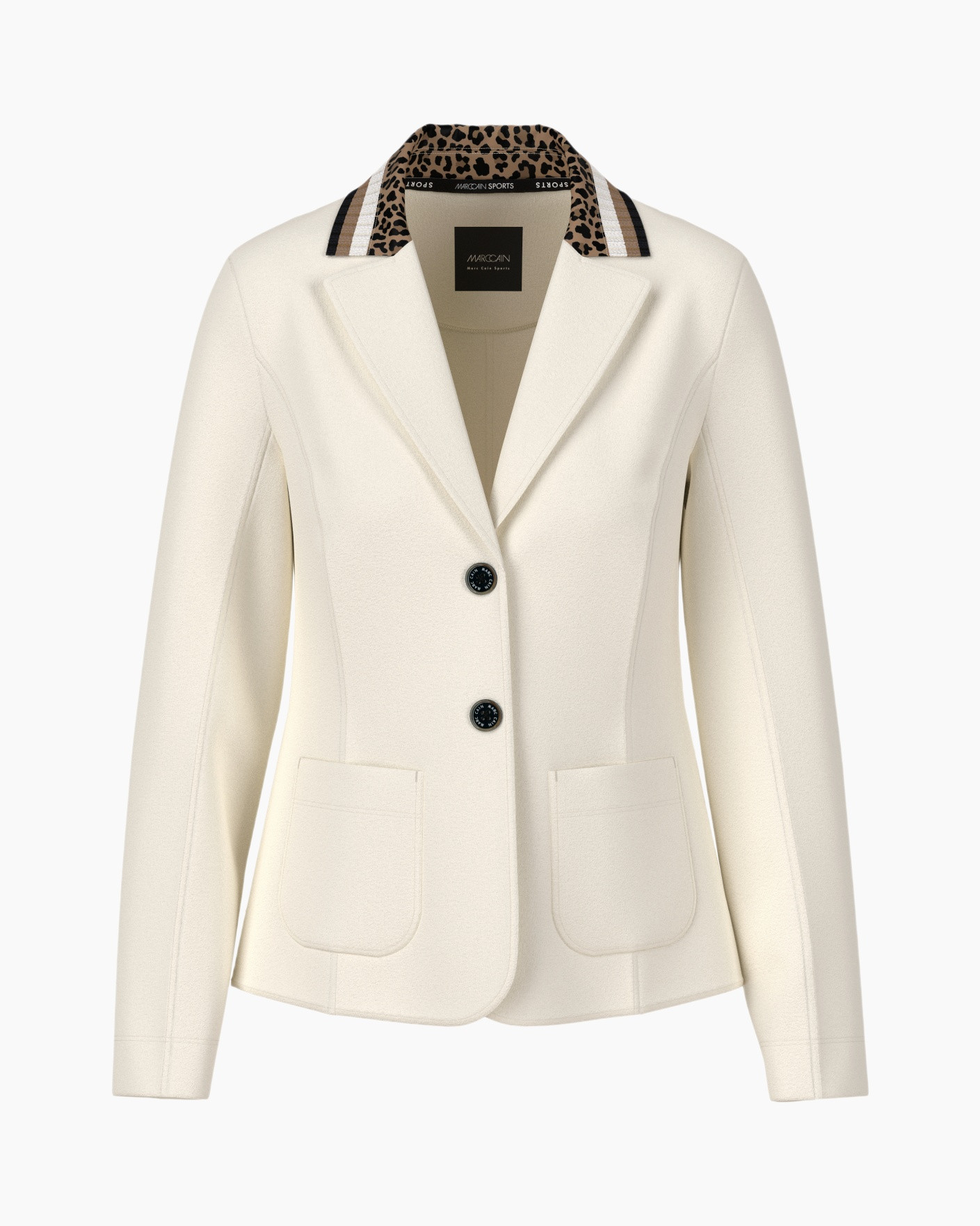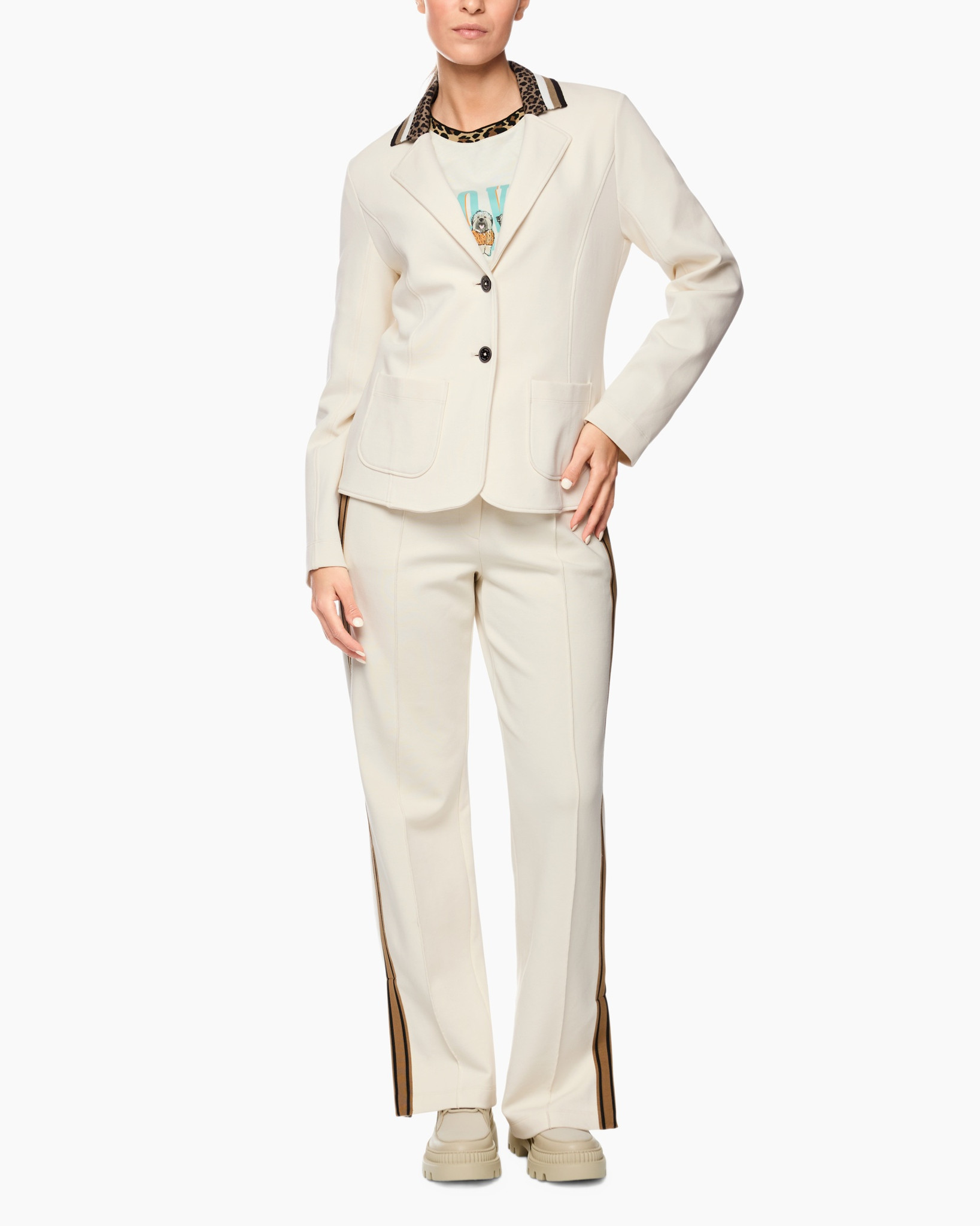 Een opvallend detail is de reverskraag, waarvan de binnenkant een speelse luipaardprint heeft, aangevuld met zwarte en goudkleurige strepen. Je sluit het jasje met een enkele donkere knoop aan de voorkant. De twee opgestikte zakken met afgeronde hoeken zijn niet alleen praktisch, ze geven het jasje ook een relaxte touch.