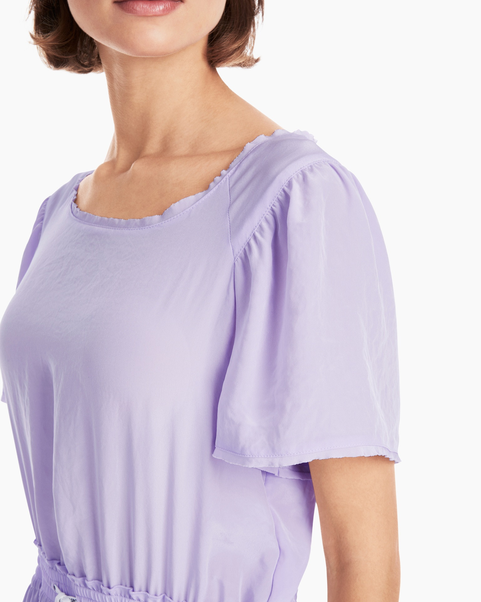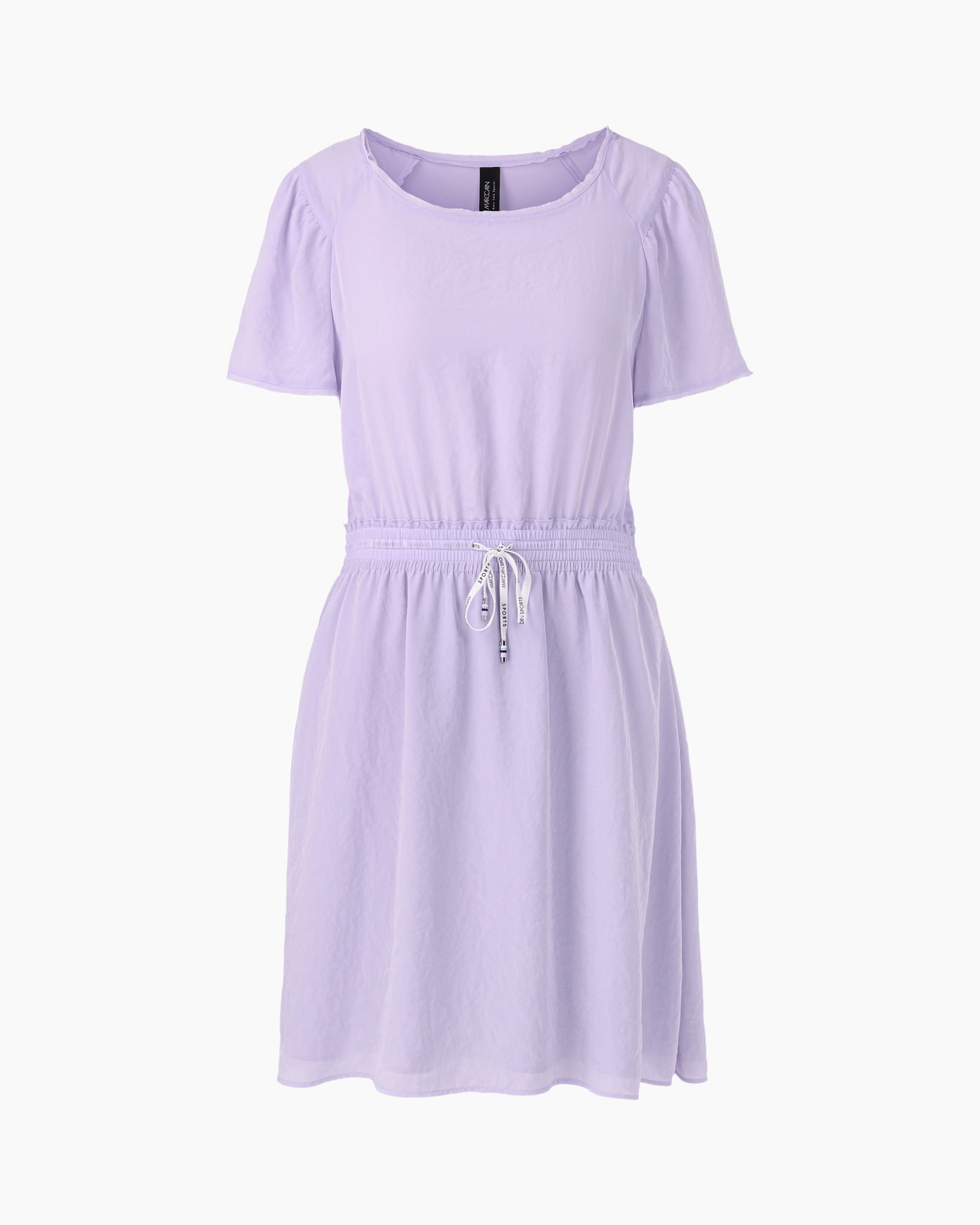 Deze knielange jurk met coole kreukdetails is perfect voor een ontspannen dag. De kreukels benadrukken het nonchalante silhouet met een wijde, open ronde halslijn en korte mouwen met ruches. De taille is gesmockt en heeft een aantrekkoord. Het materiaal heeft een indrukwekkende vloeiende drapering.