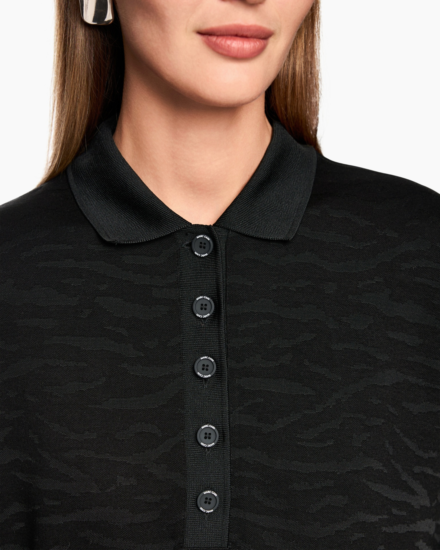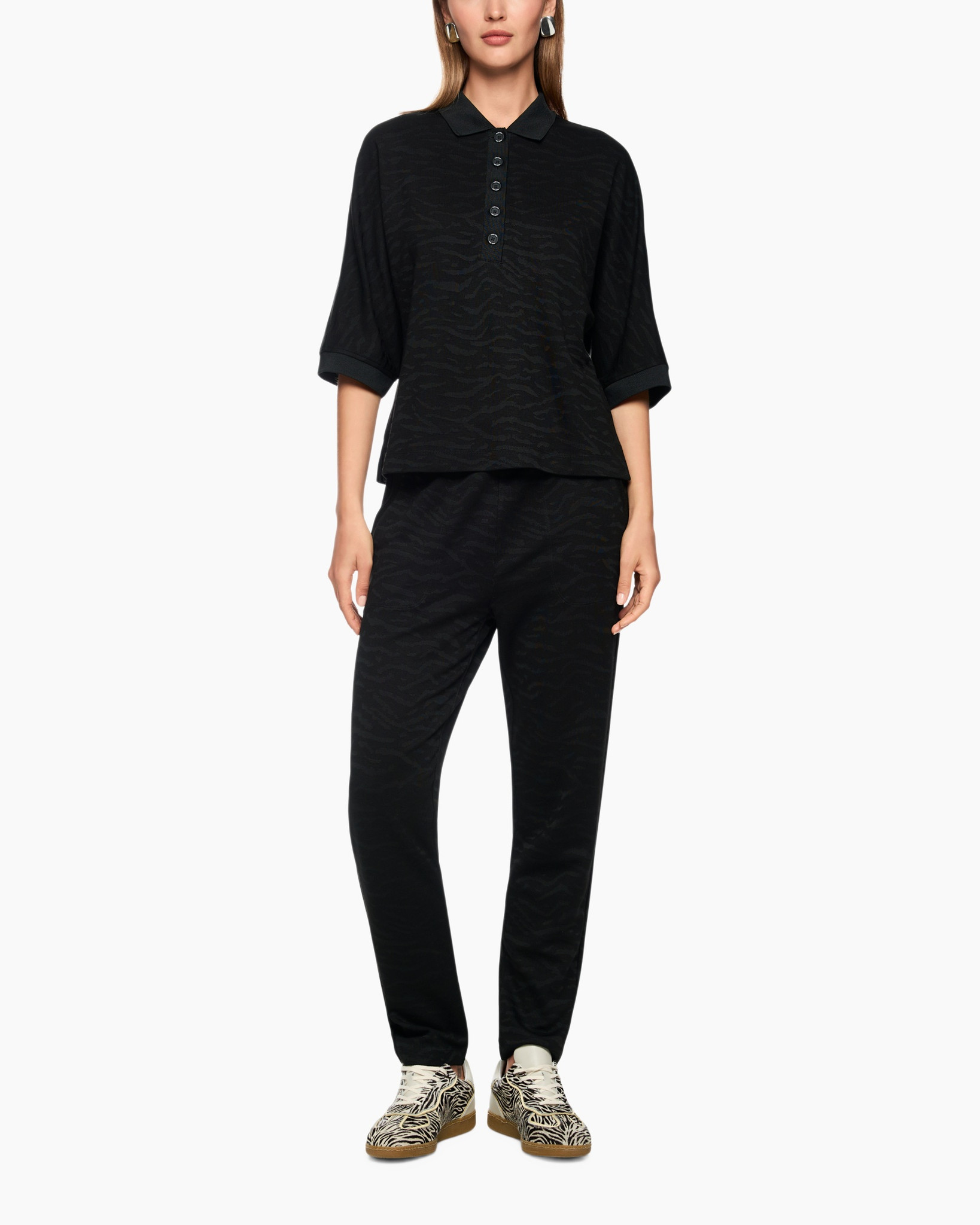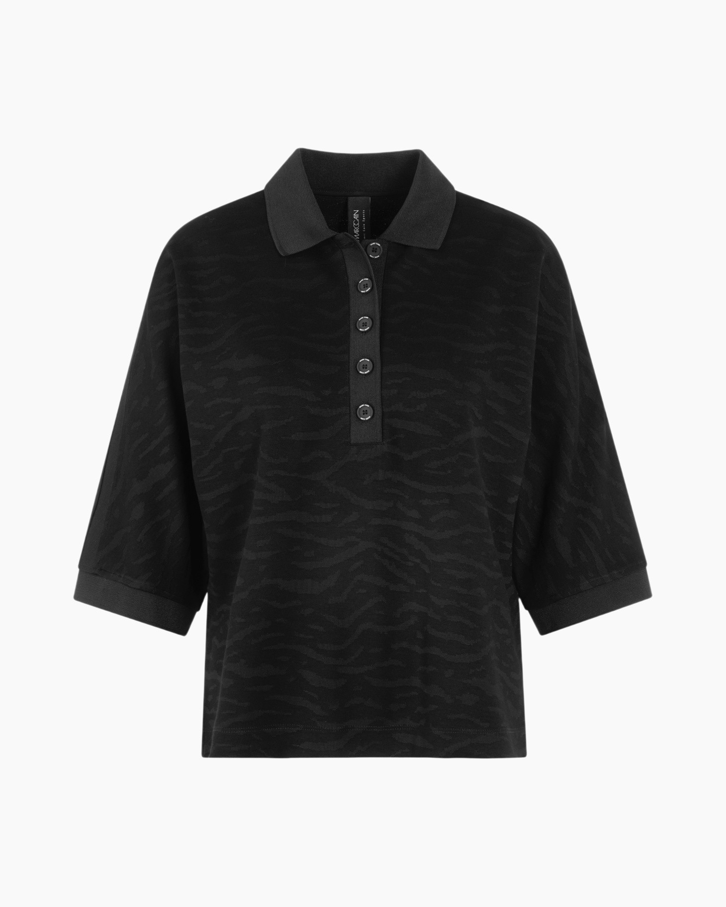 Je zoekt een veelzijdig kledingstuk met een comfortabele uitstraling, en dan is de Polo As 53.02 J01 Zwart van Marc Cain Sports precies wat je nodig hebt. Dit polo shirt heeft een losse pasvorm, waardoor het luchtig en heerlijk zit. De diepe zwarte kleur is de basis, maar kijk goed want de stof heeft een subtiel ingeweven print. Het patroon geeft het item direct textuur. De klassieke kraag sluit je met een knooplijst. Hier zie je vier donkere knopen die mooi wegvallen in de stof. De mouwen vallen wijd en reiken tot net over je elleboog. Dit is een sterk stuk dat je graag pakt voor een relaxte look.