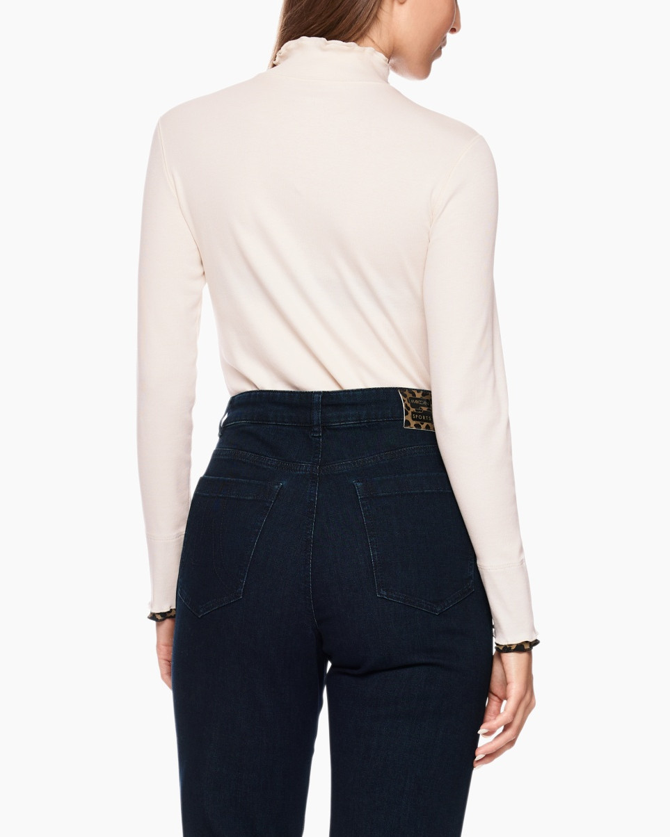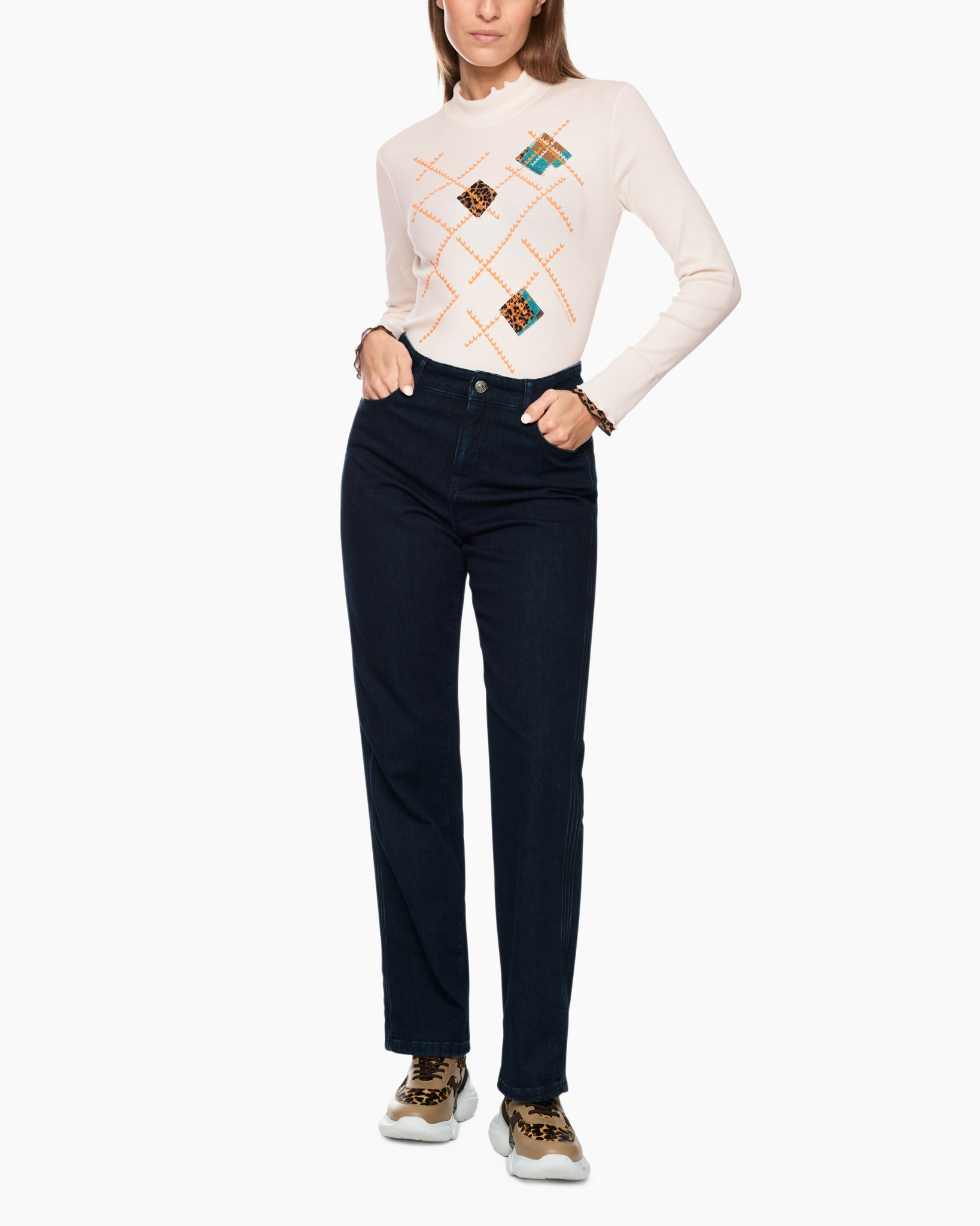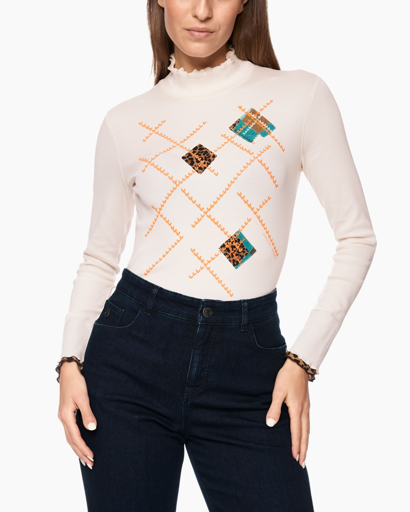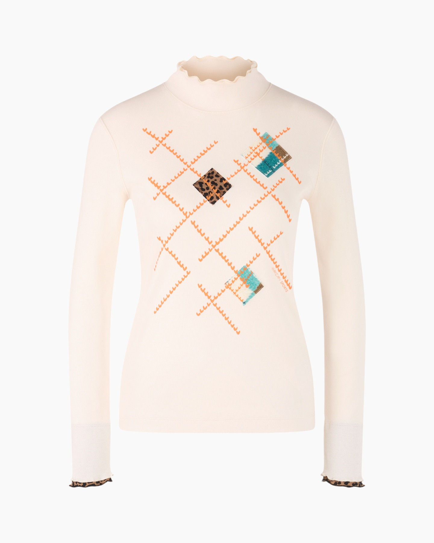 Hier is het T-shirt Zs 48.43 J85 Off White van Marc Cain Sports, een bijzondere top met lange mouwen die je garderobe direct verrijkt. Deze getailleerde top in een zachte crèmekleurige off-white tint vormt zich mooi naar je lichaam, wat een prettig draagcomfort biedt. De lange mouwen eindigen met een subtiele geplooide rand bij de manchetten. Ook de staande kraag is voorzien van een speelse ruchesrand, een charmant detail. Je ziet op de voorkant een dynamisch patroon van oranje zigzaglijnen die gecombineerd zijn met ruiten. Deze ruiten bevatten een levendige dierenprint en geometrische motieven in blauw en bruin. De achterkant van de top is effen, zodat de aandacht volledig op het unieke patroon aan de voorzijde ligt.