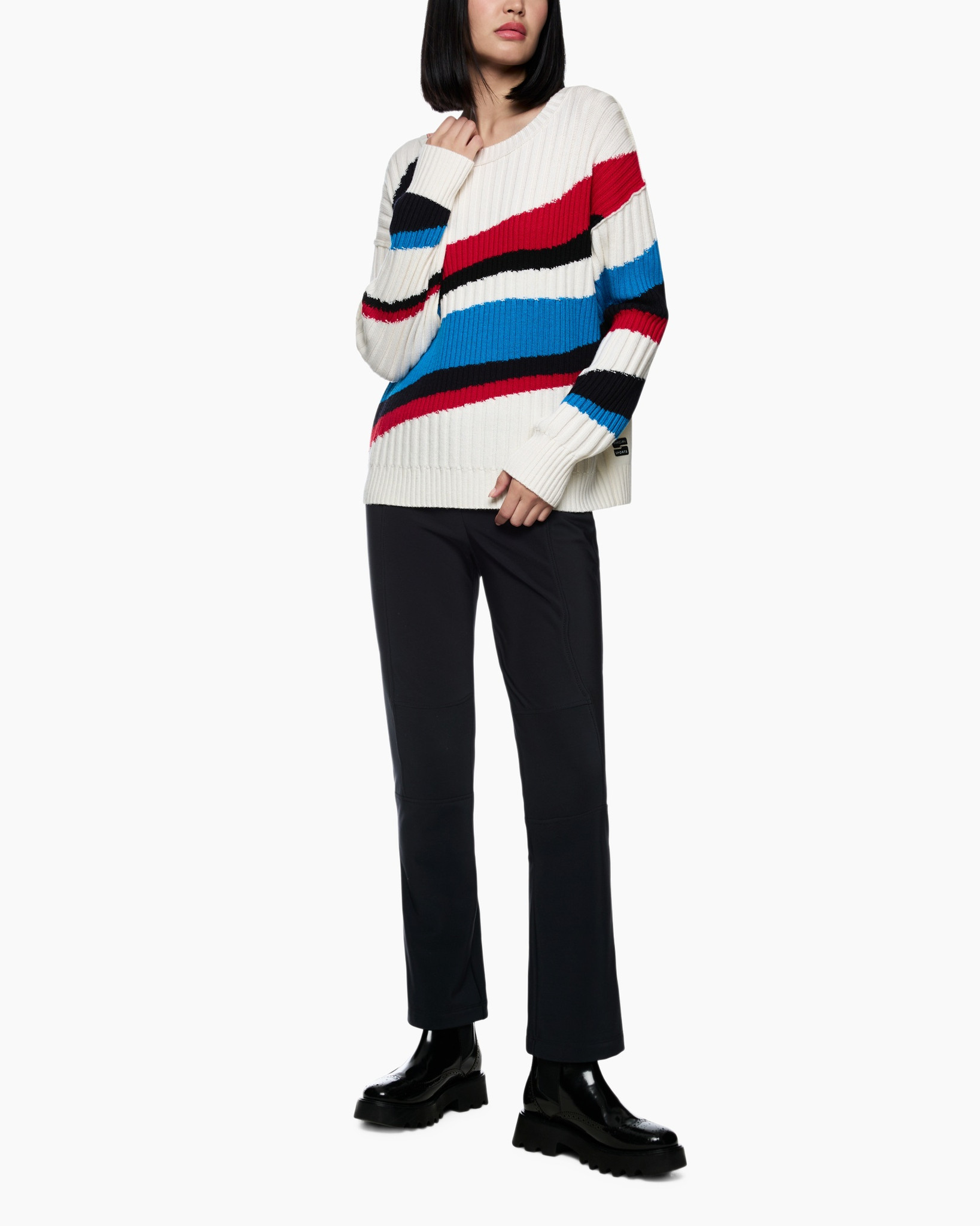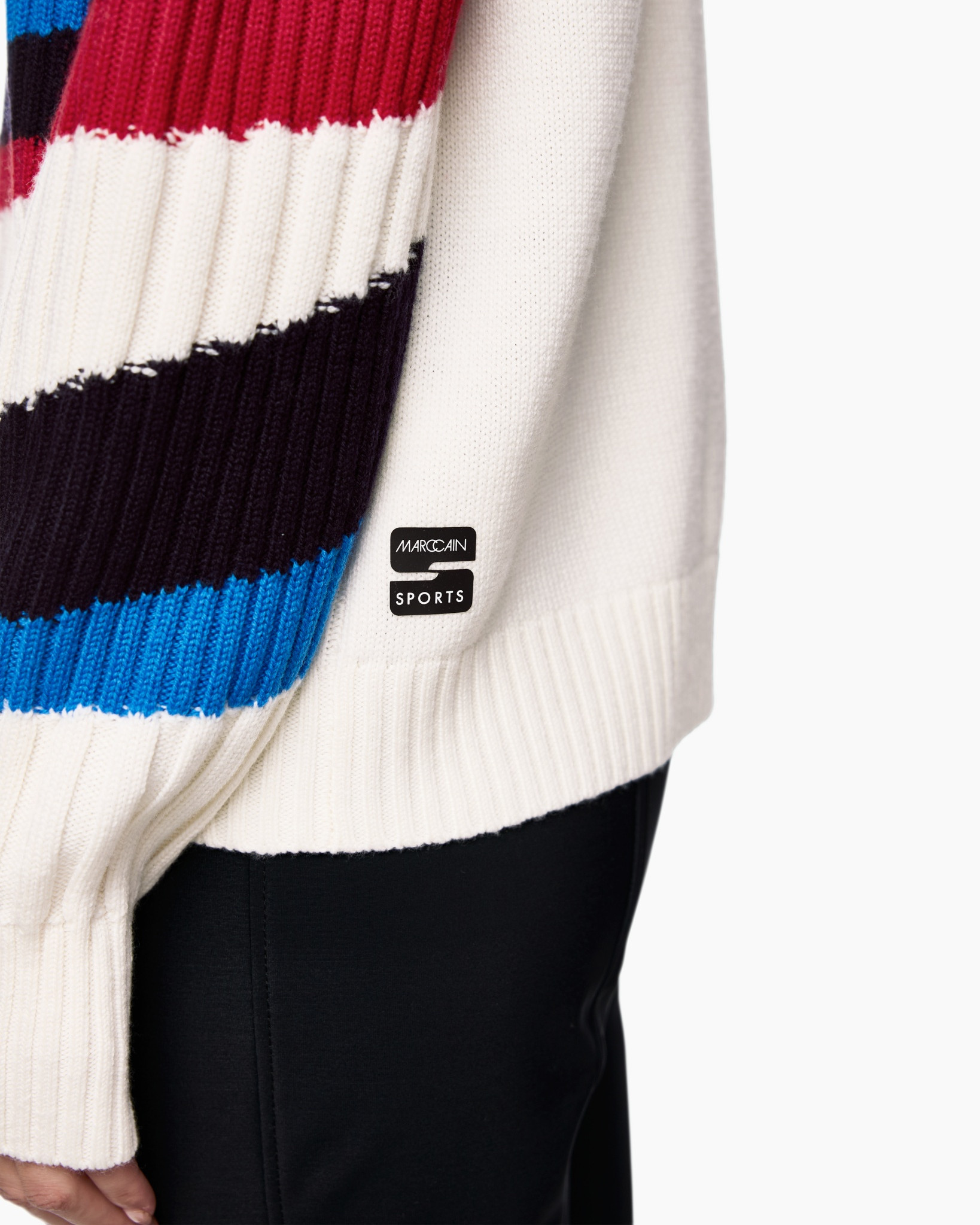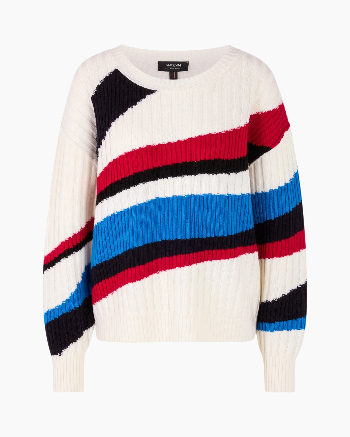 De Trui Zs 41.41 M59 Off White van Marc Cain Sports geeft je een opvallende toevoeging aan je garderobe. Deze comfortabele trui heeft een ruimvallende pasvorm en zit heerlijk. Je ervaart alle bewegingsvrijheid die je wenst. De trui heeft een klassieke ronde hals en lange mouwen, beiden afgewerkt met een ribboord. Ook de onderkant van de trui is voorzien van zo’n brede ribboord. De basiskleur off-white krijgt veel persoonlijkheid door de diagonale banen in krachtig rood, diepblauw en zwart. De duidelijke ribgebreide structuur zorgt voor een fijne textuur. Je ziet geen knopen of zakken, wat het design lekker helder houdt en de aandacht richt op het kleurrijke patroon.