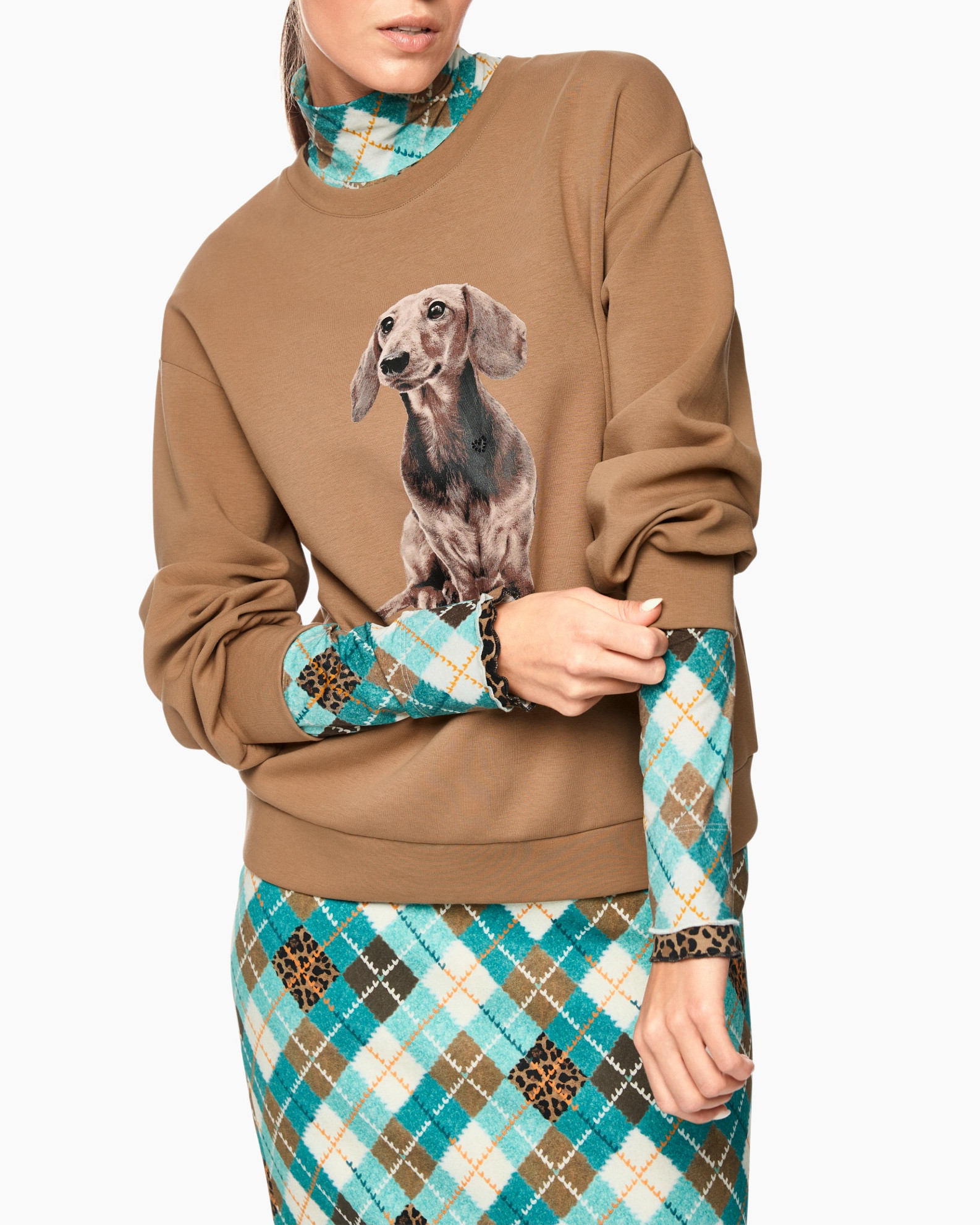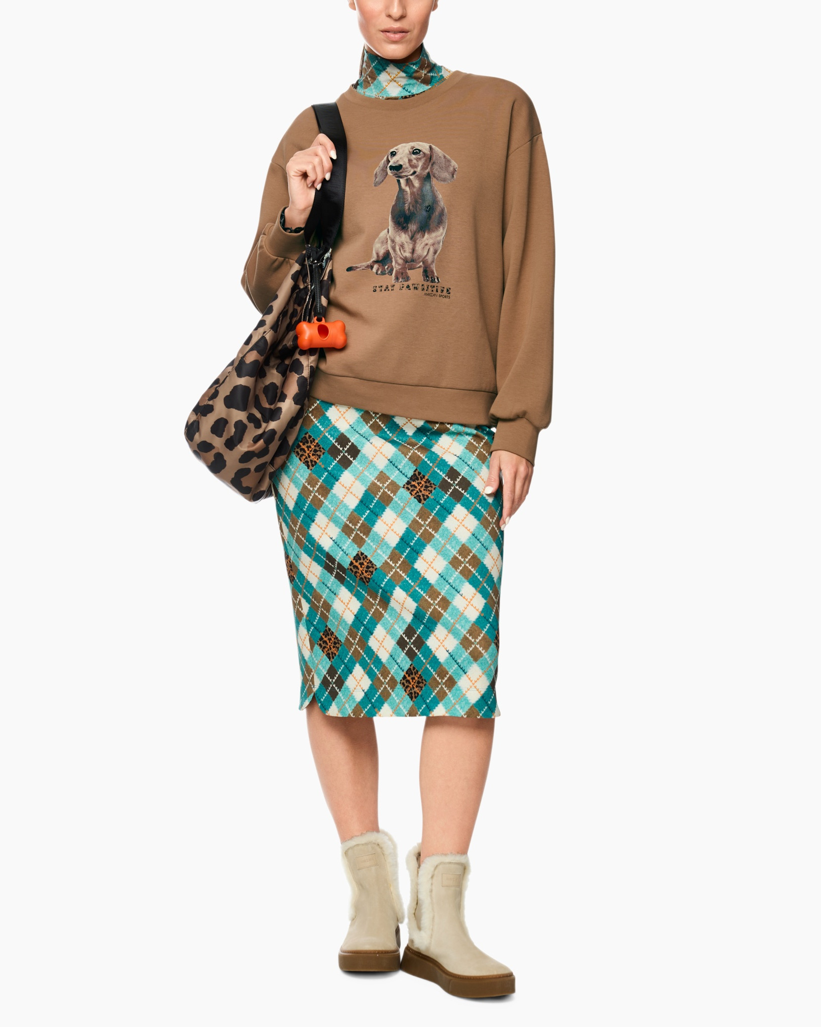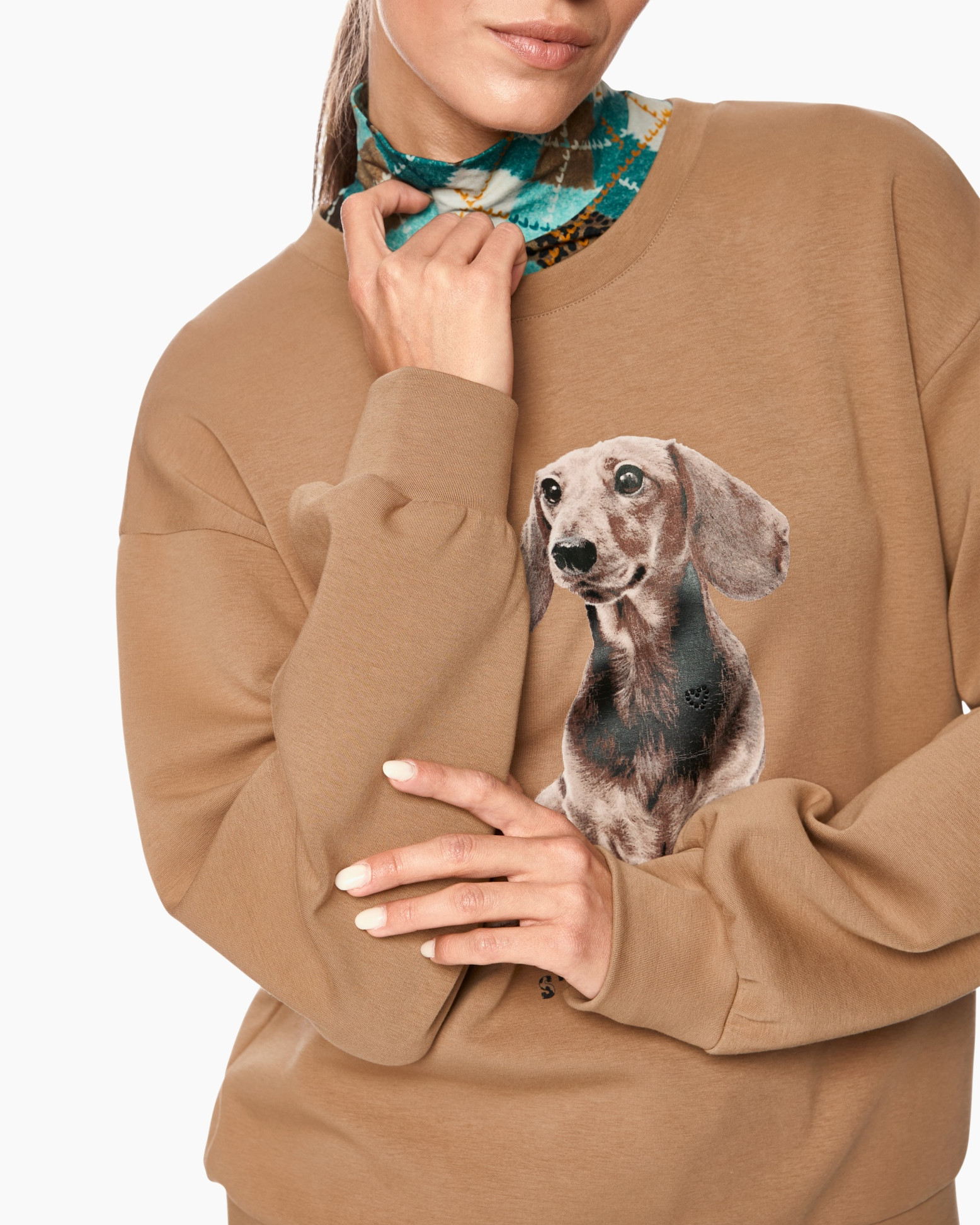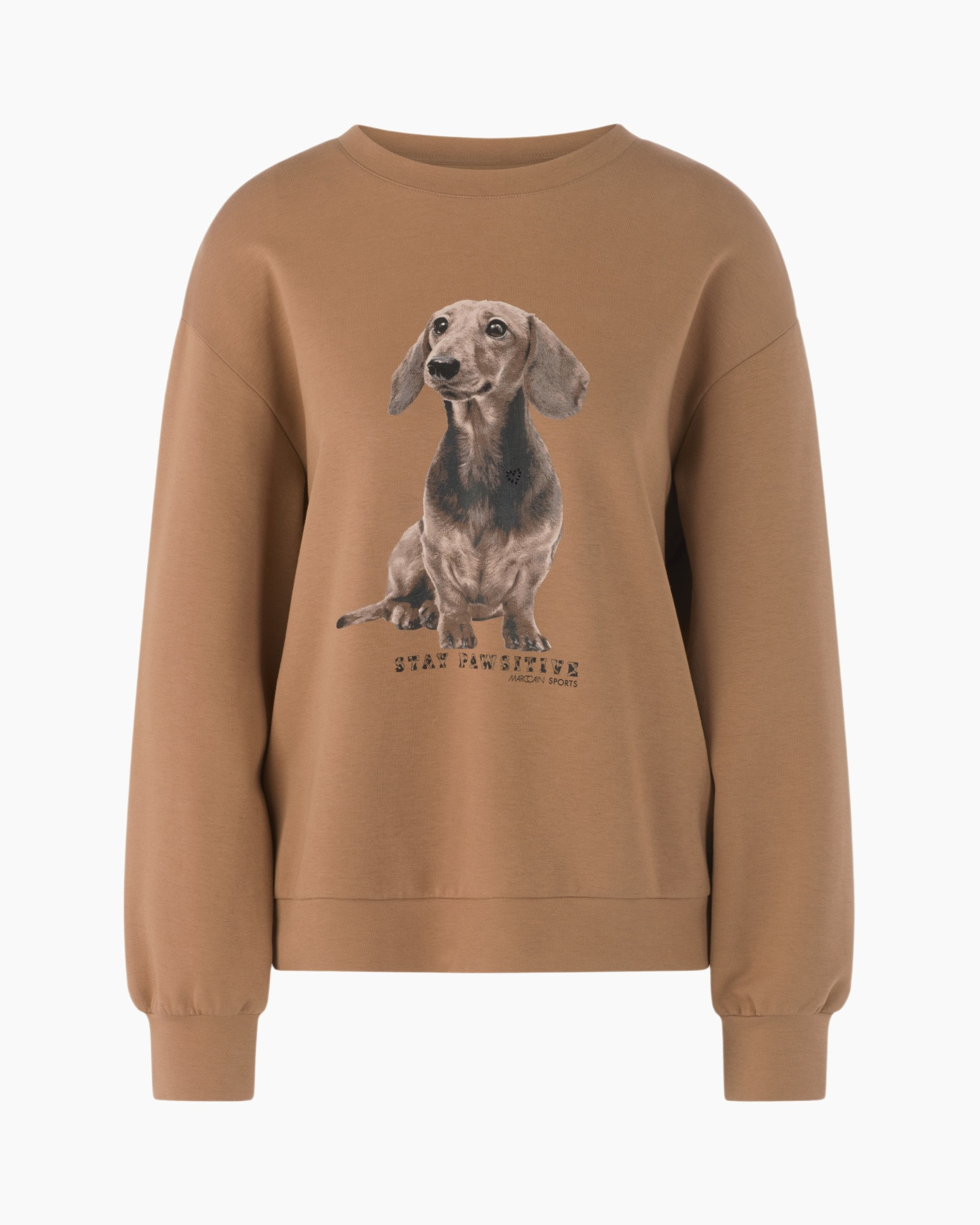 Deze Trui Zs 44.12 J09 Bruin dessin van Marc Cain Sports is een trui die je makkelijk pakt voor een relaxte dag. Je ziet direct de ruime pasvorm en de comfortabele uitstraling die de trui je geeft. De dropped shoulders en de wijde mouwen zorgen voor alle bewegingsvrijheid, wat deze trui tot een fijne keuze maakt. De ribboorden bij de mouwen en aan de onderkant van de trui vallen soepel om je polsen en heupen. De warme bruine kleur geeft een aardse basis die je breed combineert met andere kledingstukken uit jouw kast. Op de voorkant springt direct een vrolijke teckel in het oog, die de trui een uniek karakter geeft. Dit detail trekt de aandacht op een prettige manier en toont direct jouw persoonlijkheid. Onder de afbeelding van de hond lees je de tekst 'STAY PAWS-ITIVE' en 'MARC CAIN SPORTS', wat een speels element toevoegt aan de verder effen achterkant. De ronde halslijn, ook wel bekend als crew neck, maakt het plaatje compleet en sluit mooi aan.