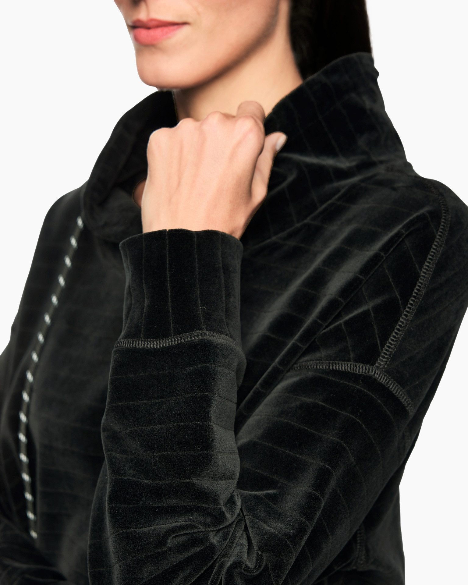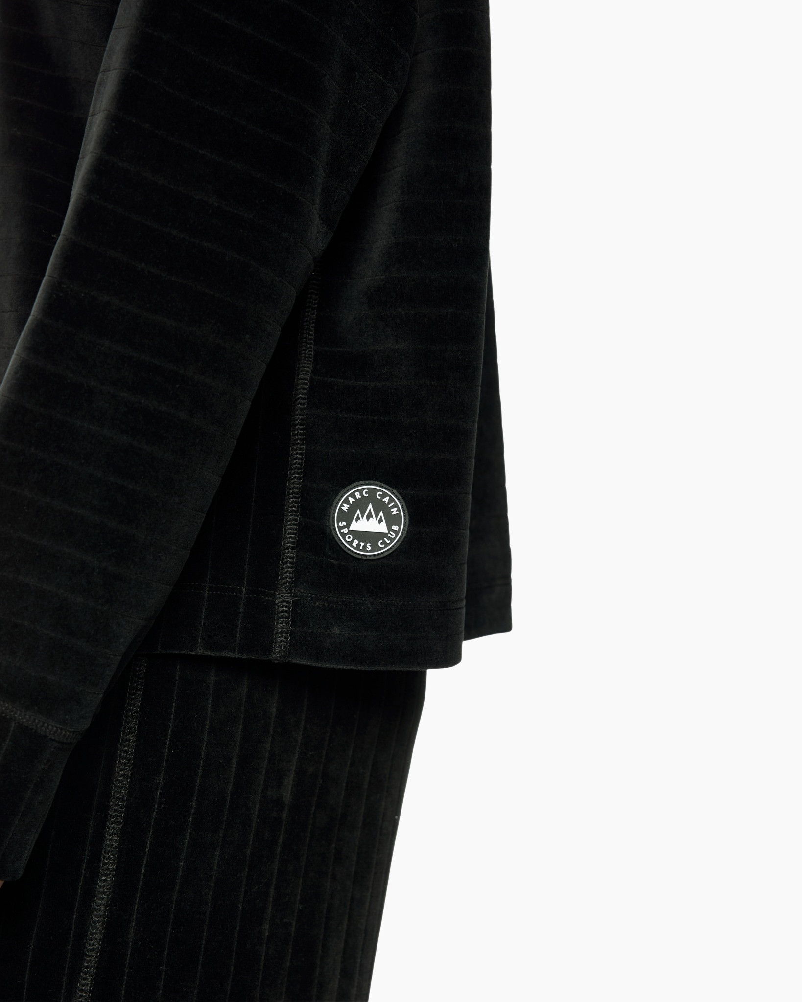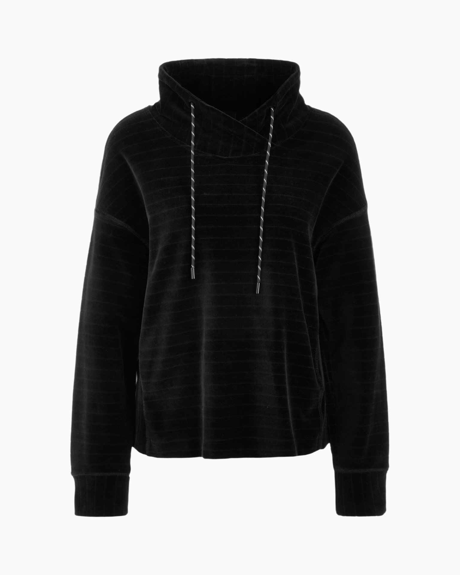 Van Marc Cain Sports zie je hier de Trui Zs 44.13 J70 Zwart. Deze comfortabele trui valt relaxed, met een licht verkorte pasvorm die je eenvoudig combineert. De diepzwarte kleur van het velours geeft de trui een rijke uitstraling. Je ziet een opvallende hoge kraag die je aantrekt met een speels gestreept koord. De ruches langs de kraagrand voegen een verzorgd detail toe. De lange mouwen zijn afgewerkt met ribgebreide boorden, net als de onderkant van de trui. Dit zorgt voor een fijne aansluiting. De horizontale banen in de stofstructuur maken dit een item met karakter.